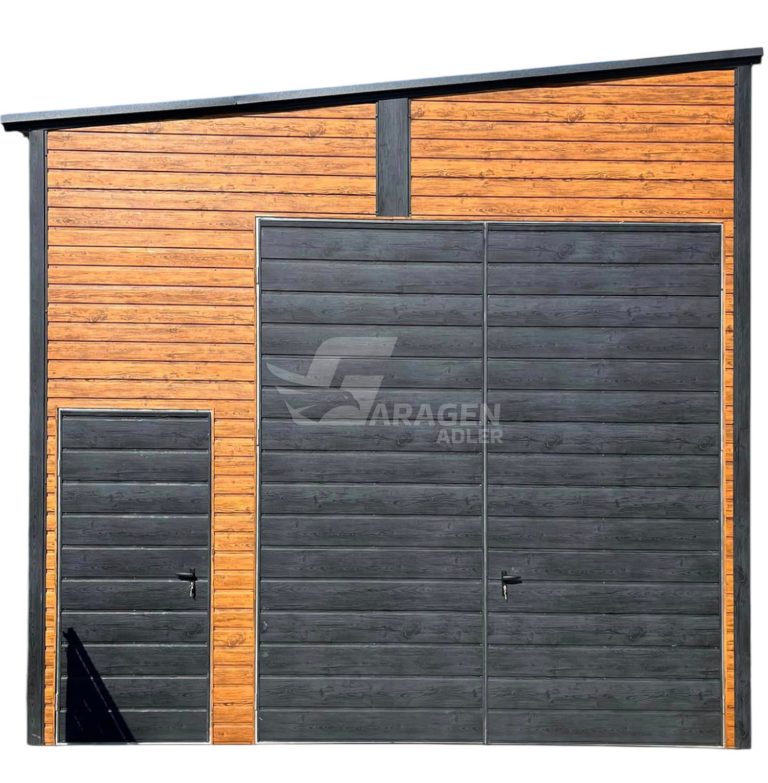 Blechgarage – Halle – 4x8m – Zweiflügeliges Tor – 2x Tür – Anthrazit – Helles Walnussholz – Holzoptik – Dach mit seitlichem Gefälle | ID706 |