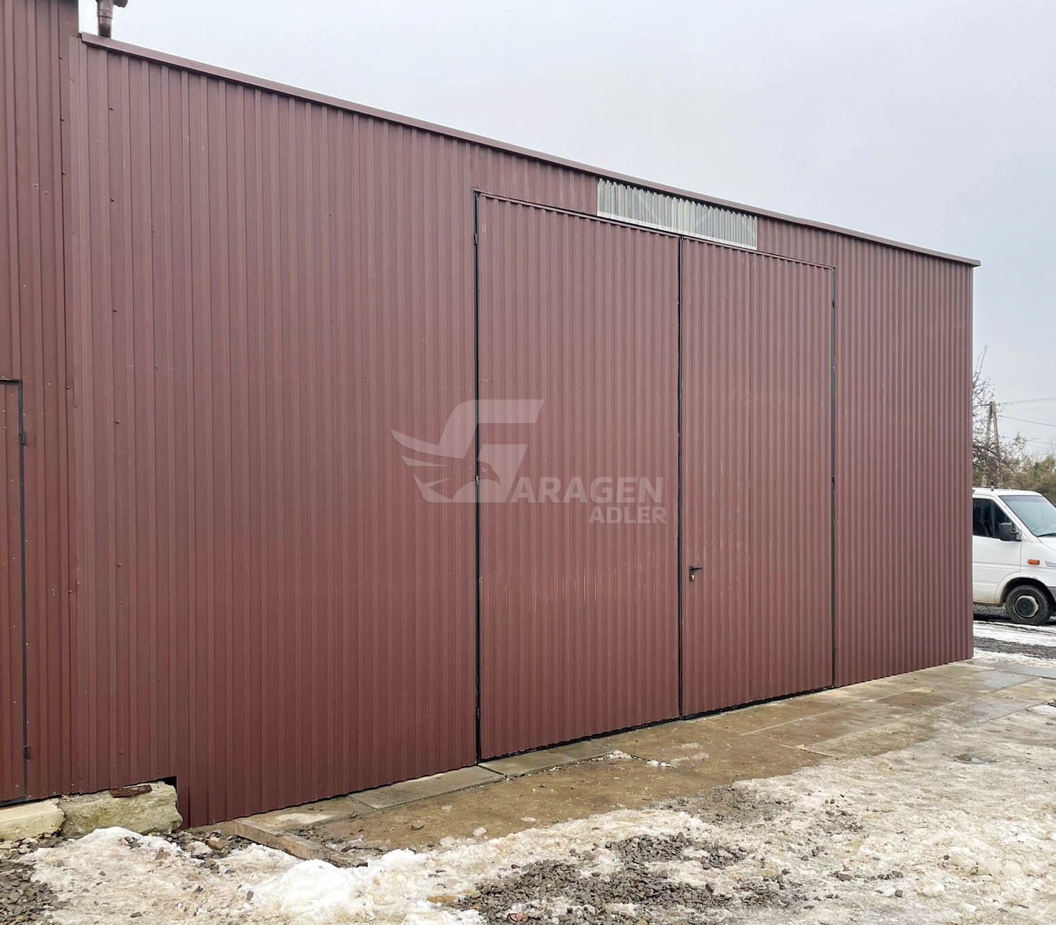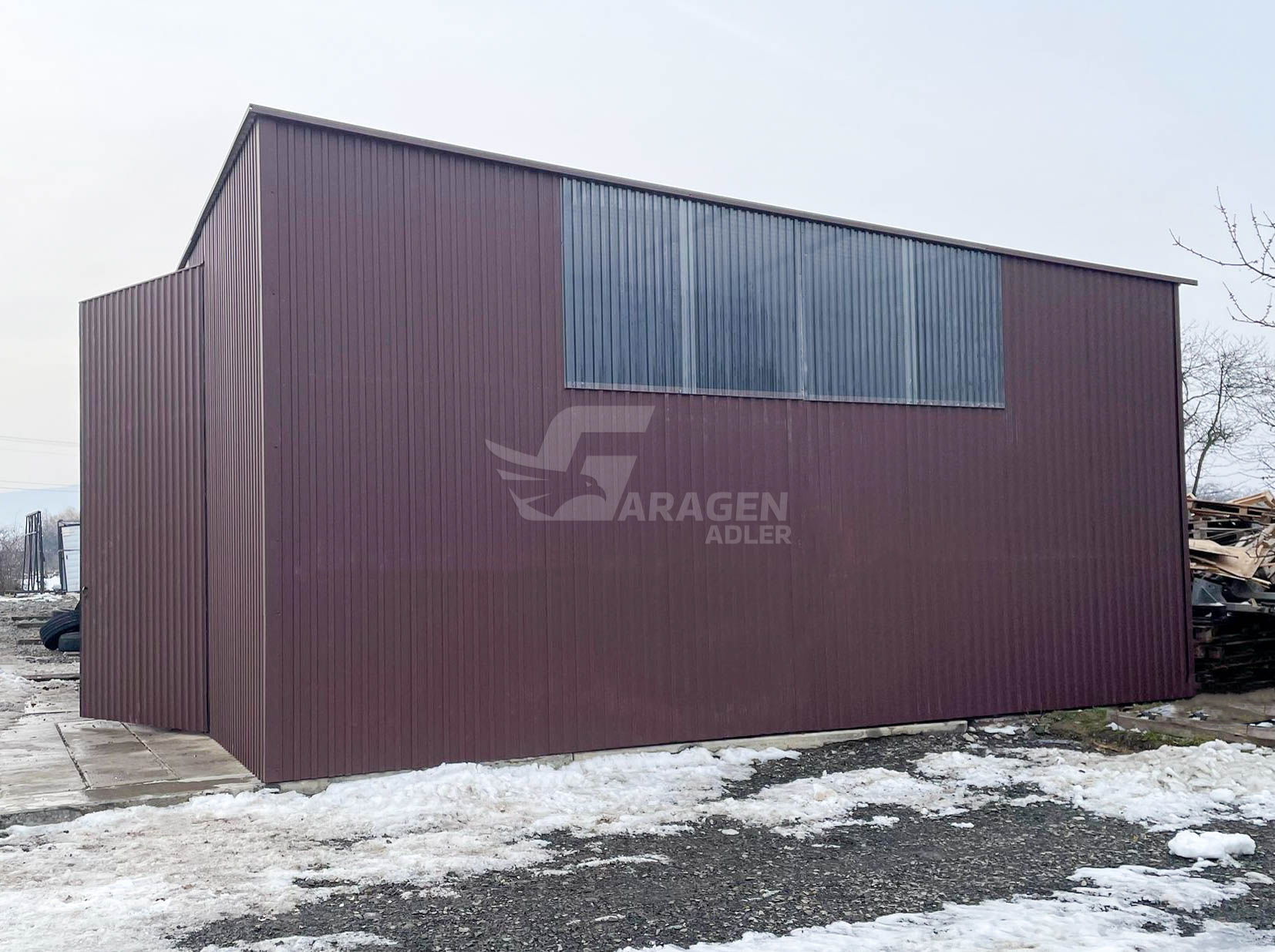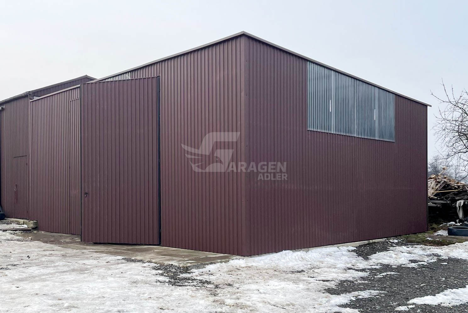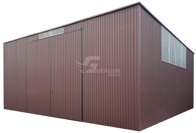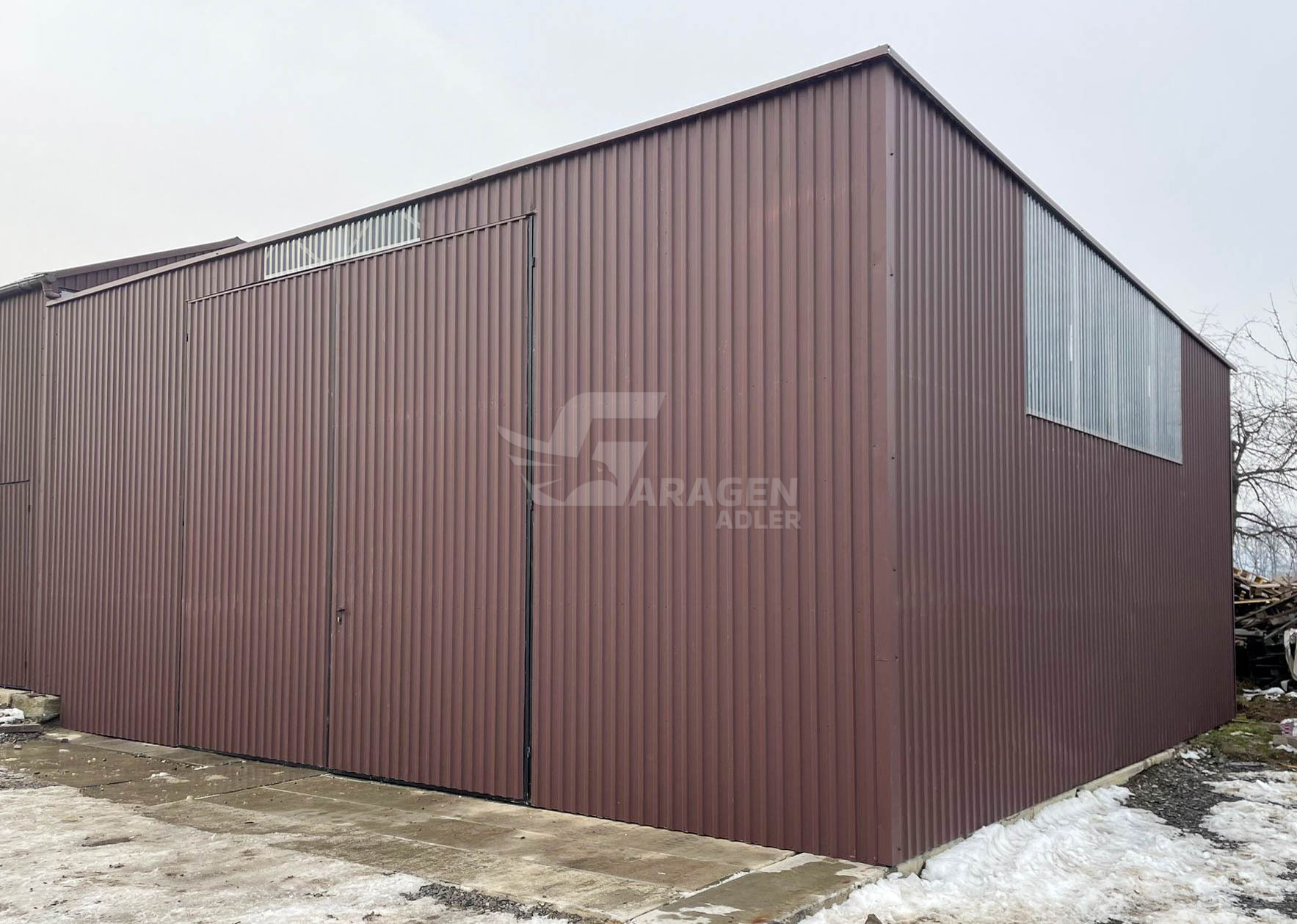 Blechhalle – Lager 9x8m Zweiflügeliges Tor – dunkelbraun – Flachdach | GP587 |