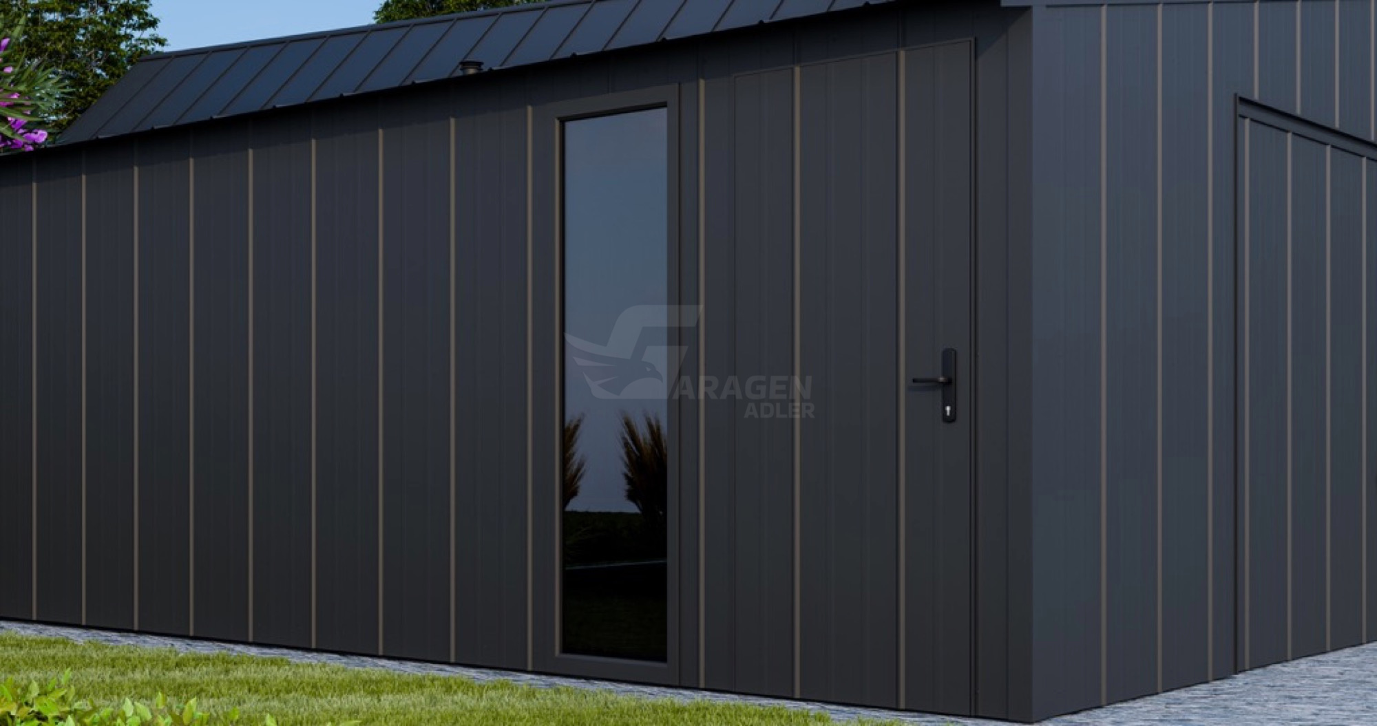 - Satteldach, Eindeckung aus Stehfalzblech, Farbe: Anthrazit Matte 7016