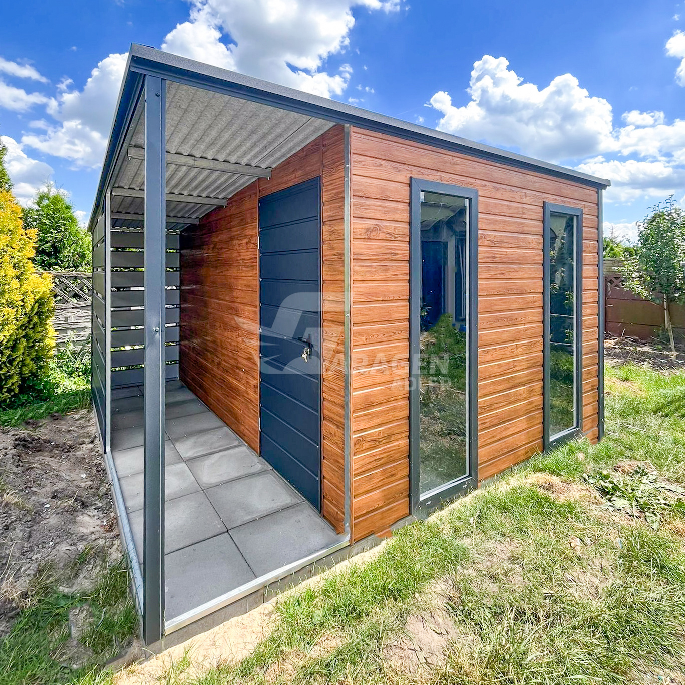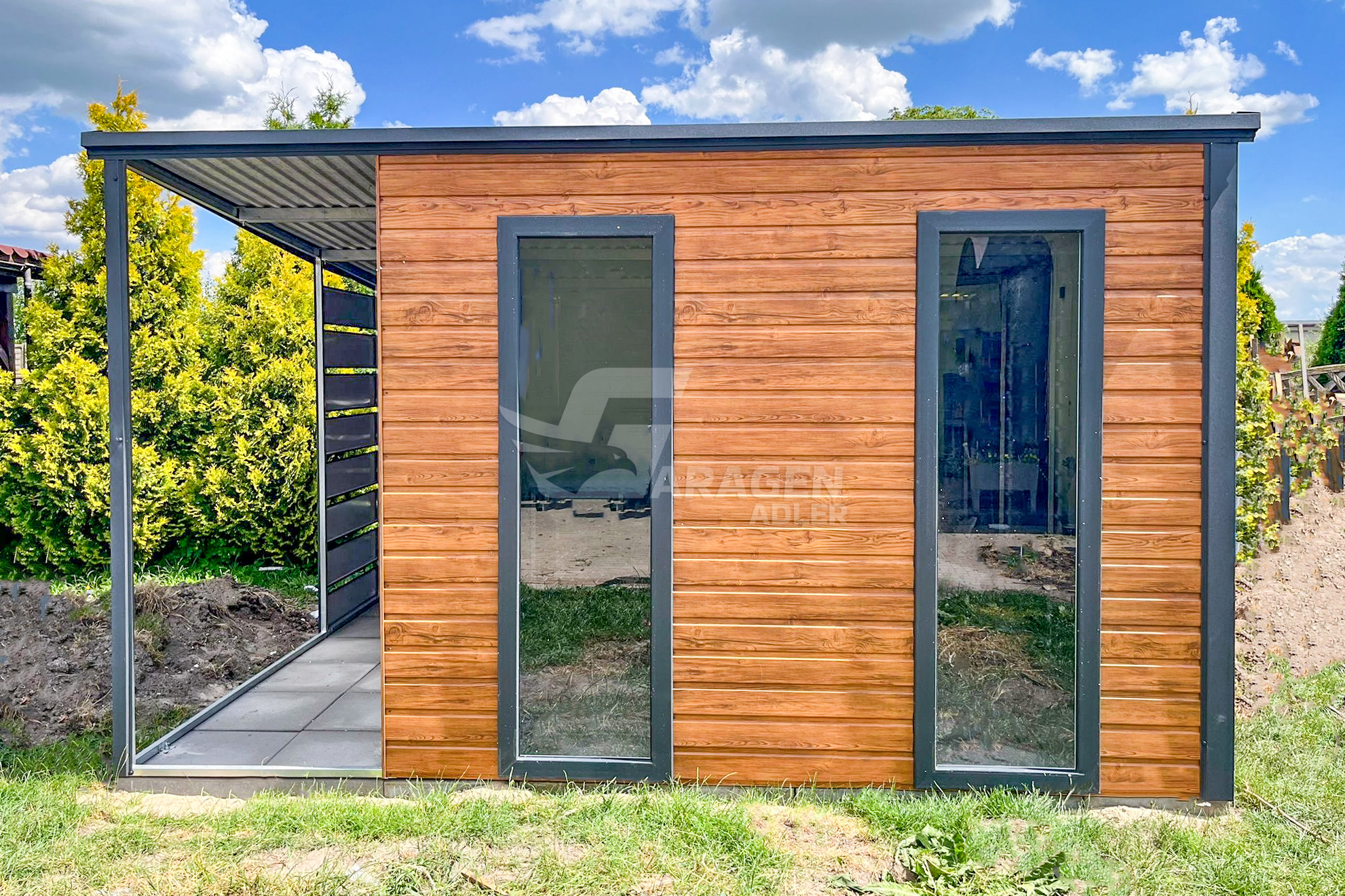 - Überdachung 1x3m Die Seiten- und Rückwand sind mit Paneelen verkleidet