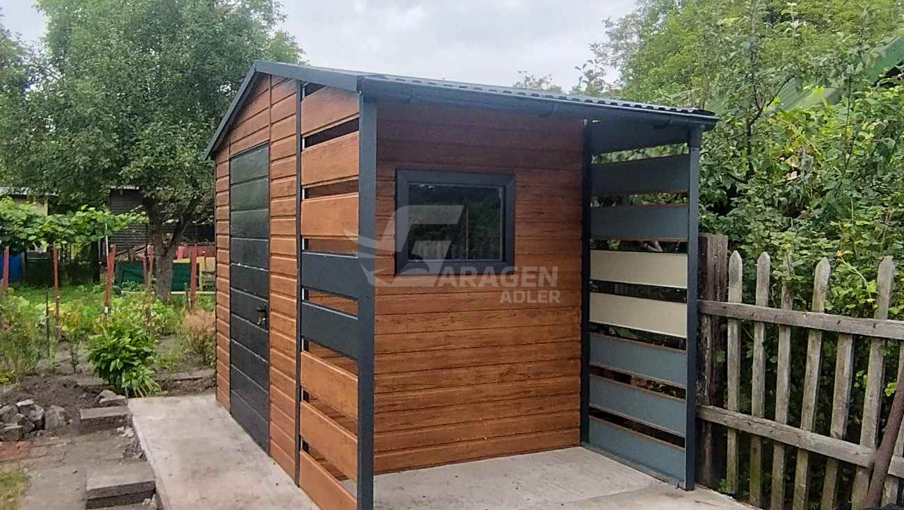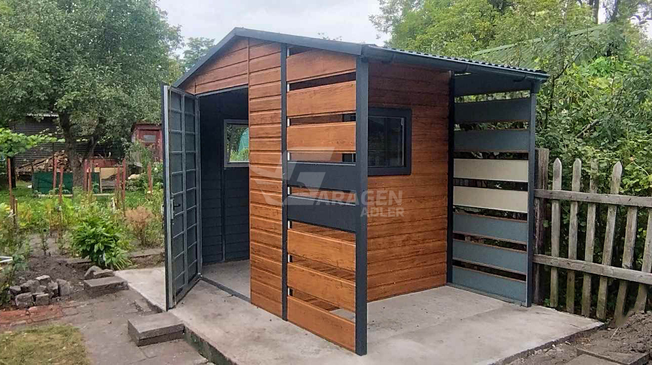 - Überdachung 1×2 m Die Rück- und Vorderwand sind mit Paneelen verkleidet.