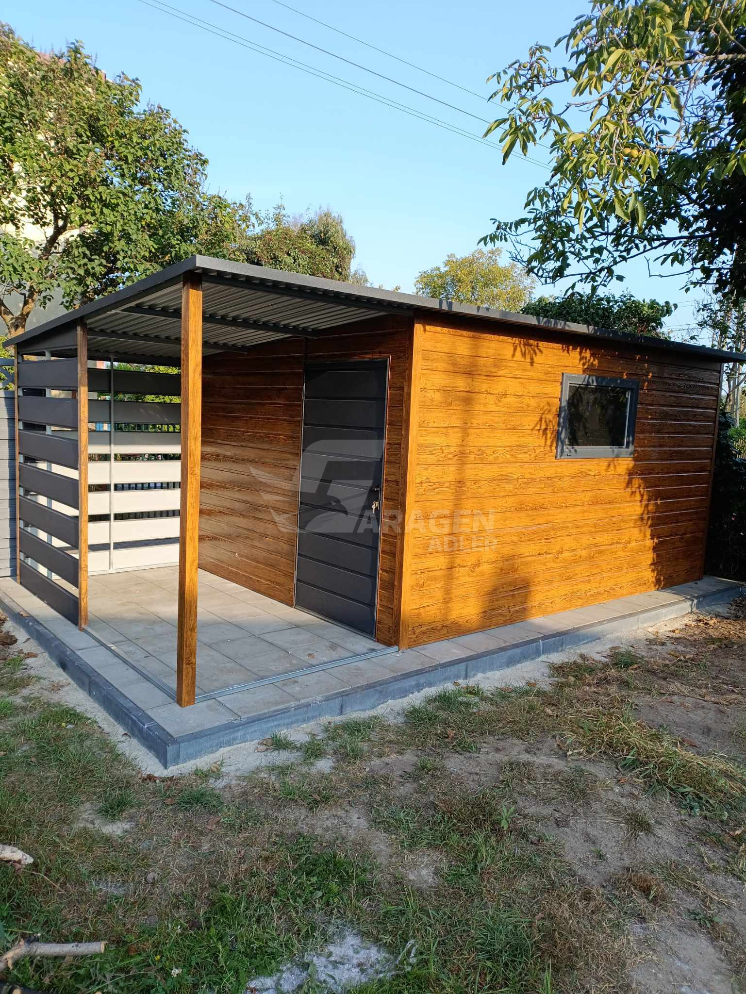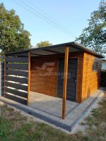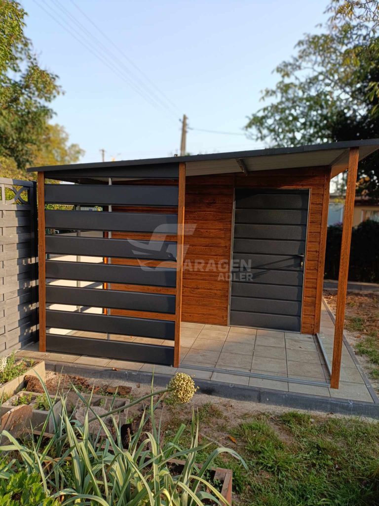 Gartenhaus – Gartenschuppen 3,5x3m + Überdachung 2m – Tür – PVC Kippfenster – Helles Walnussholz – Holzoptik – Anthrazit – Flachdach | ID756 |