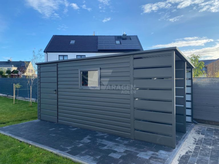 Gartenhaus – Gartenschuppen 3,8×2,5m + Überdachung 1,2m – Tür – PVC Kippfenster – Anthrazit – Flachdach | GP459 |