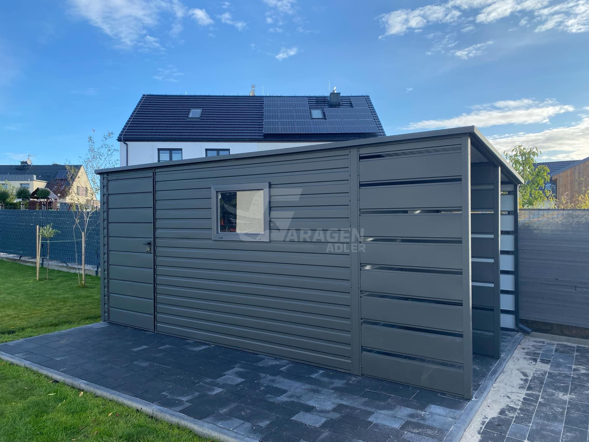 - Überdachung 1,2×2,5 m Die Rück- und Vorderwand sind mit Paneelen verkleidet. Farbe: Anthrazit Matte 7016