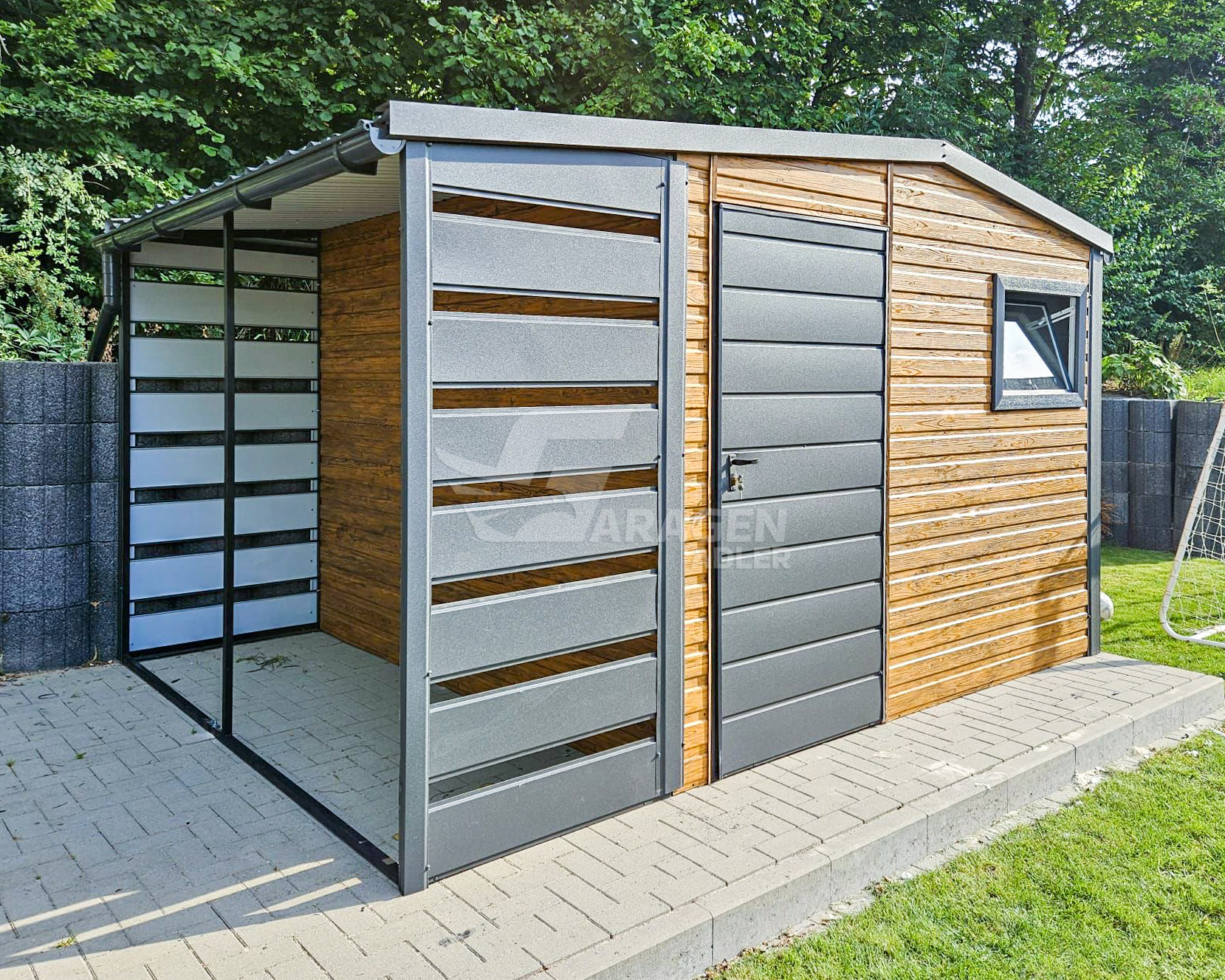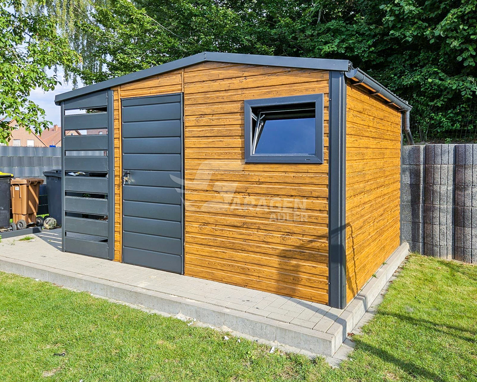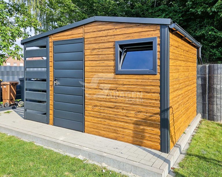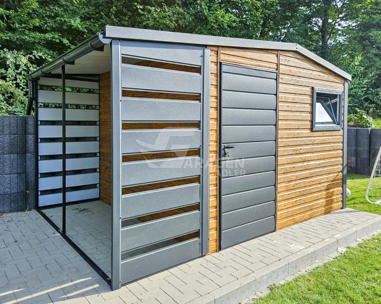 Gartenhaus – Gartenschuppen 3×3,5m + Überdachung 1m – Tür – PVC Kippfenster – Holzoptik – Anthrazit – Dachrinnen – Satteldach GP484