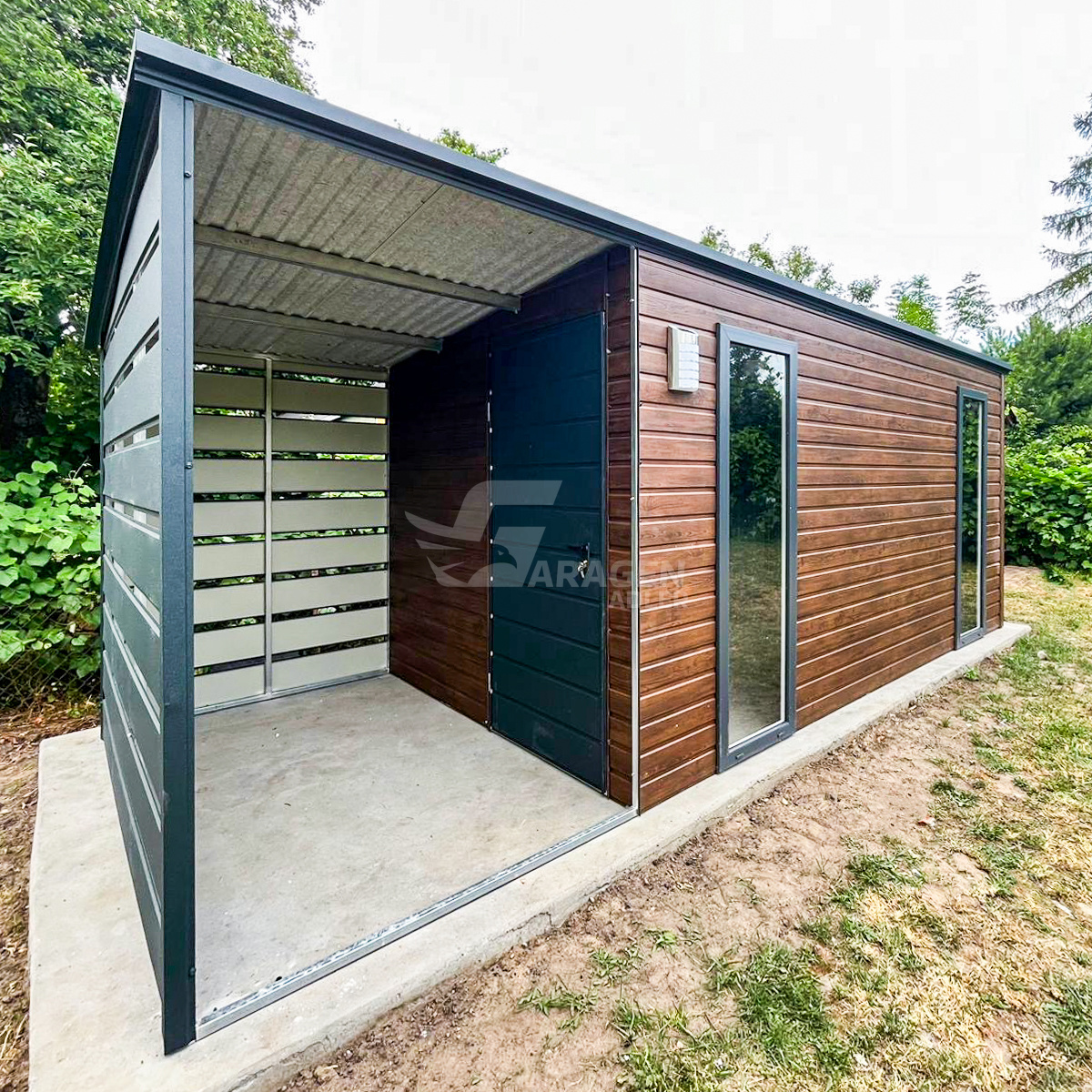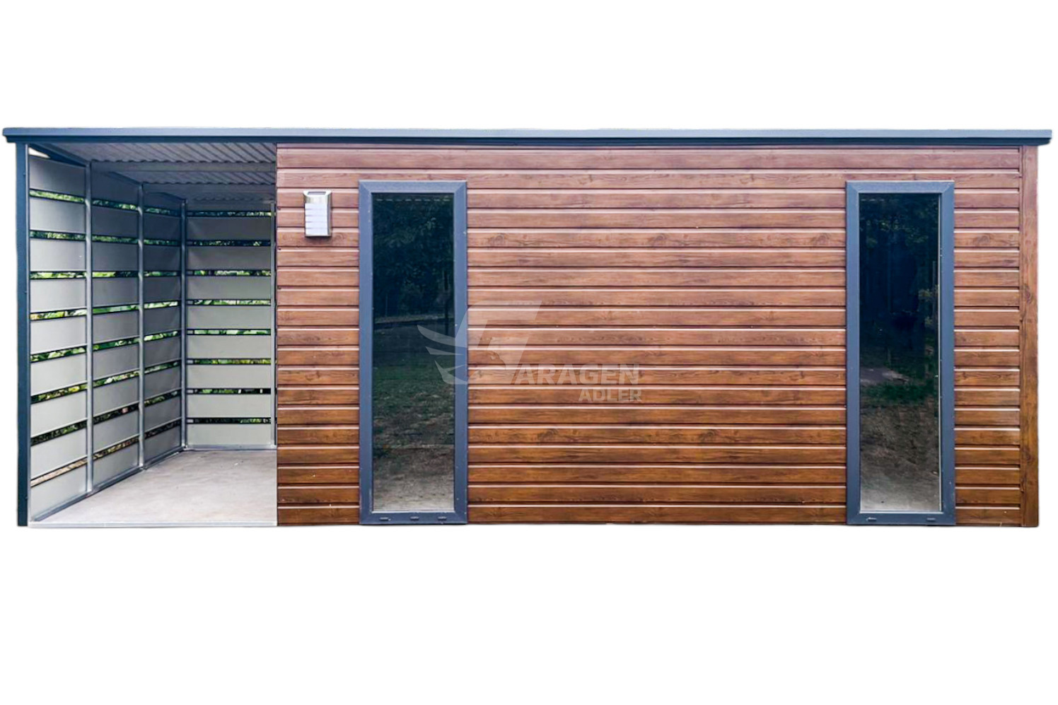 Gartenhaus – Gartenschuppen 4,5×2,5m + Überdachung 1,5m – Tür – 2x PVC Kippfenster – Holzoptik – Anthrazit – Flachdach | ID802 |