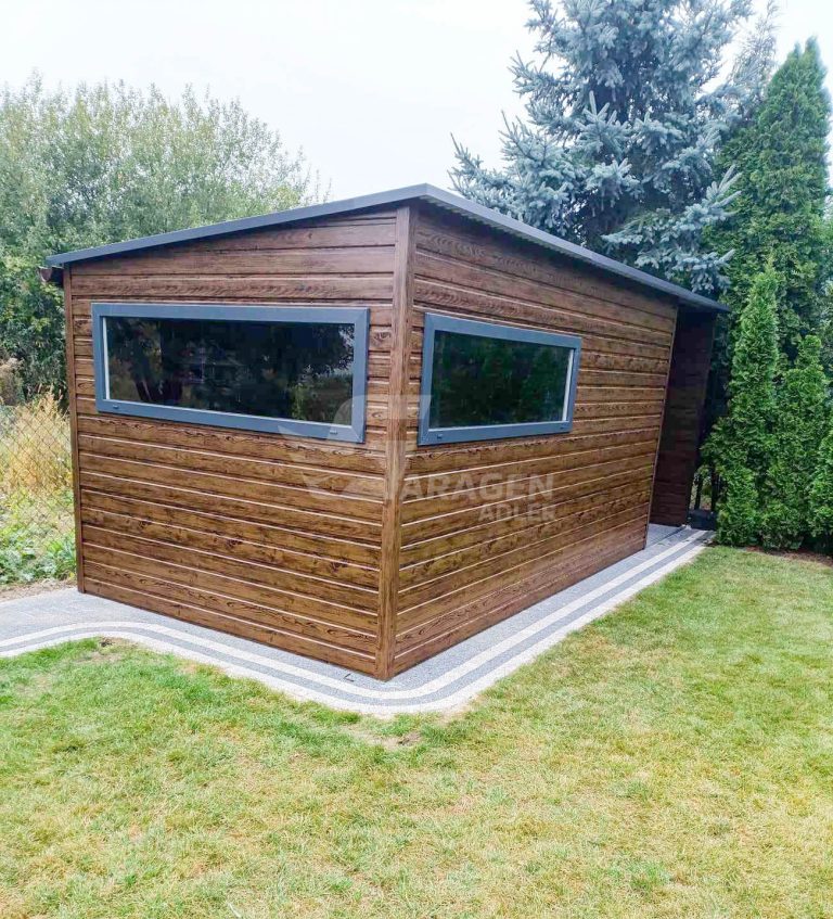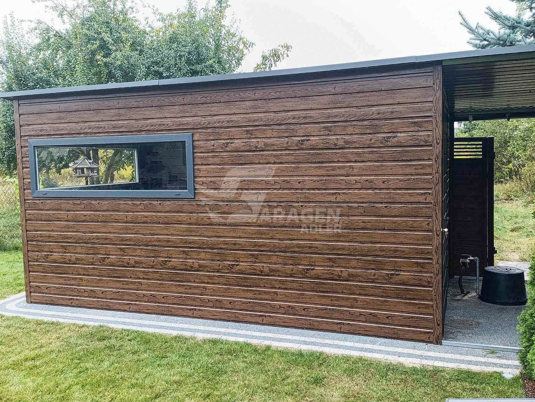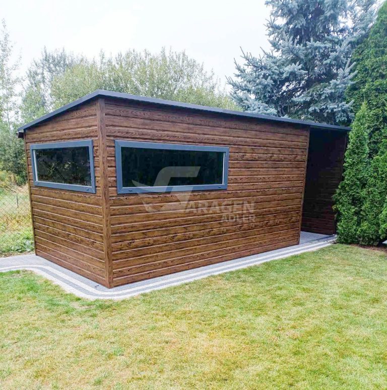Gartenhaus – Gartenschuppen 4,5×2,5m + Überdachung 1,8m – Tür – 2x PVC Kippfenster – Holzoptik – Anthrazit – Dachrinnen – Flachdach ID813