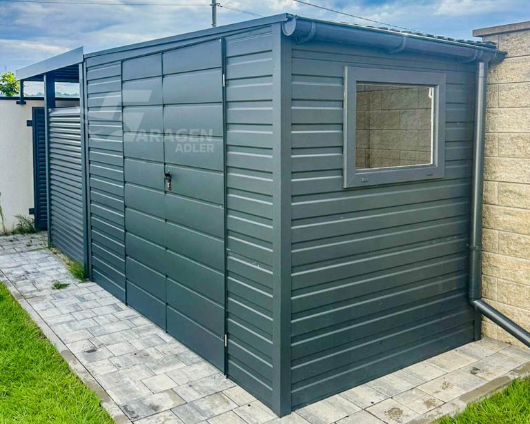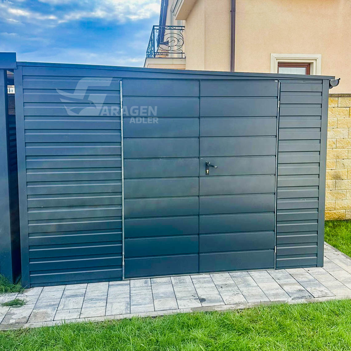 Gartenhaus – Gartenschuppen 4×1,5m – Zweiflügeliges Tor – Anthrazit – Dachrinnen – PVC Kippfenster – Flachdach ID615