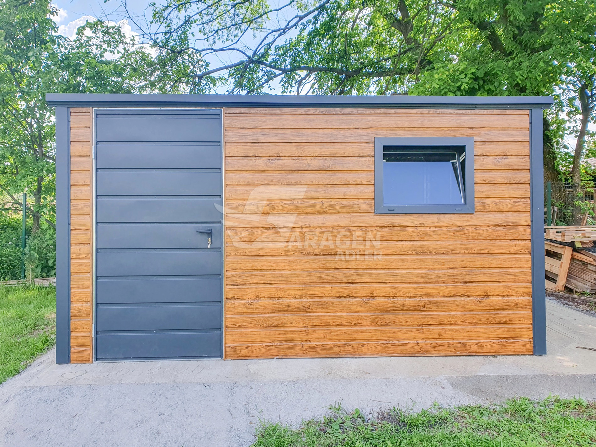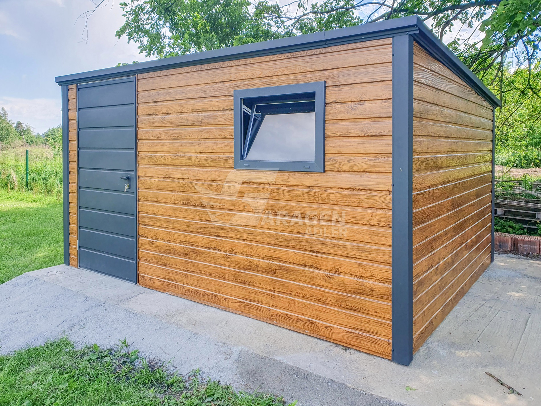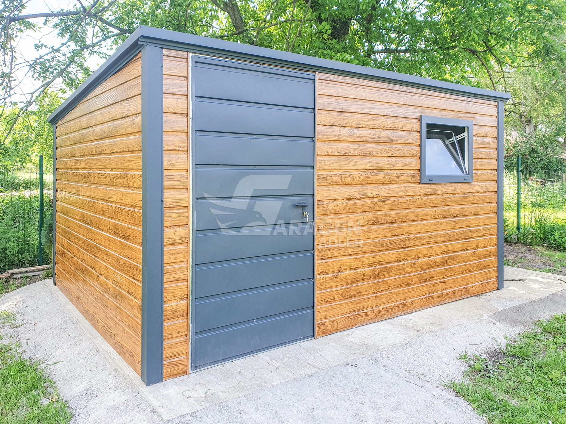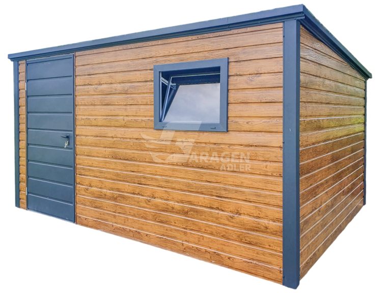 Gartenhaus – Gartenschuppen 4x3m – Tür – PVC Kippfenster – Helles Walnussholz – Holzoptik – Anthrazit – Flachdach | ID636 |