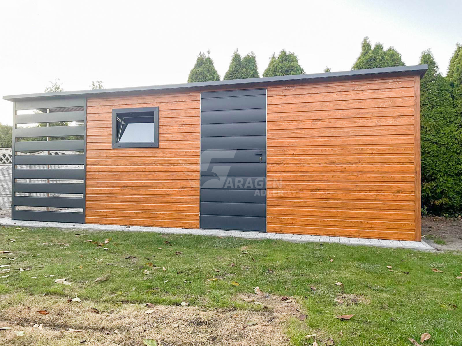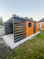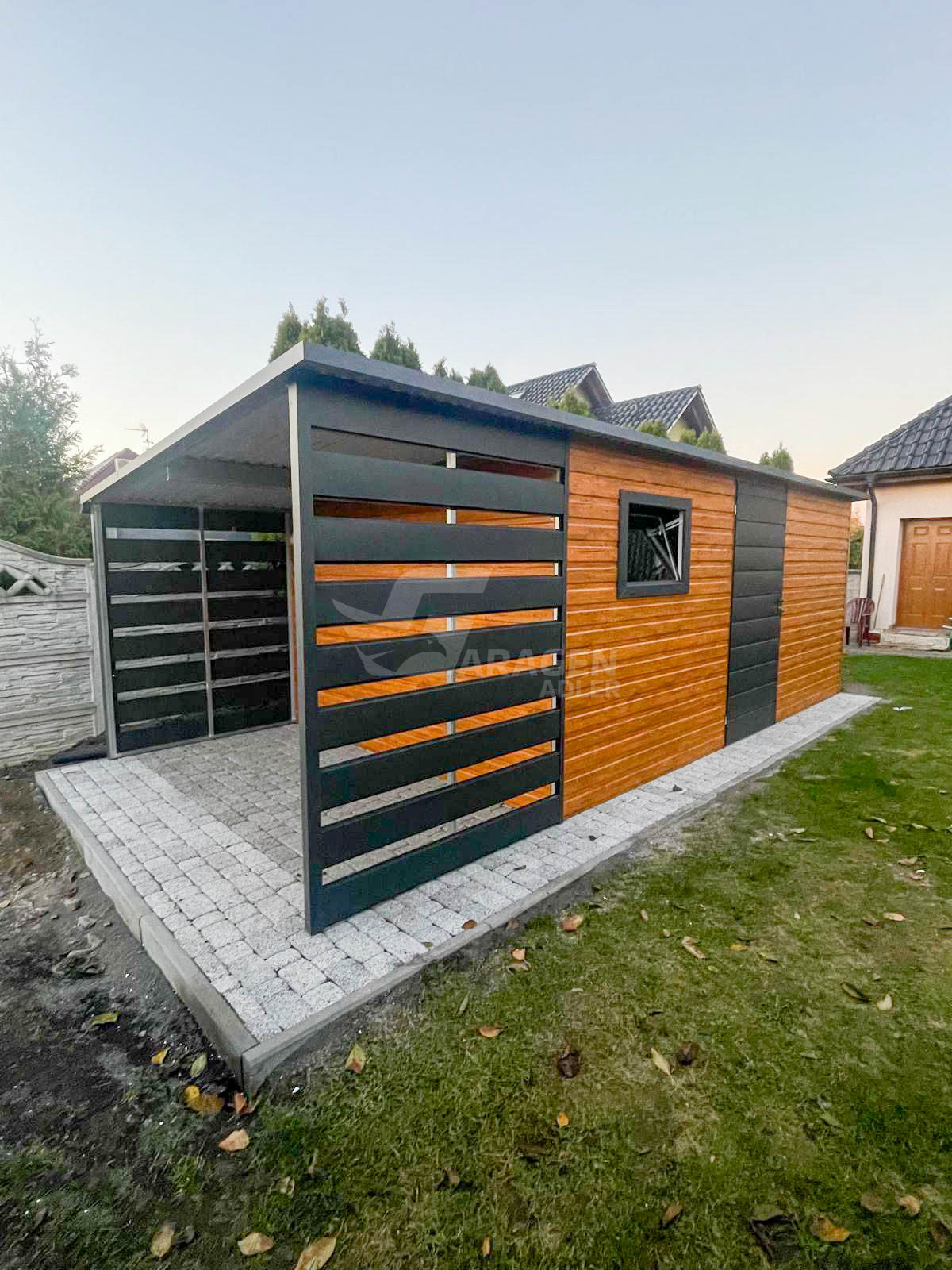 - Überdachung 1,5×3,5m Die Rück- und Vorderwand sind mit Paneelen verkleidet.