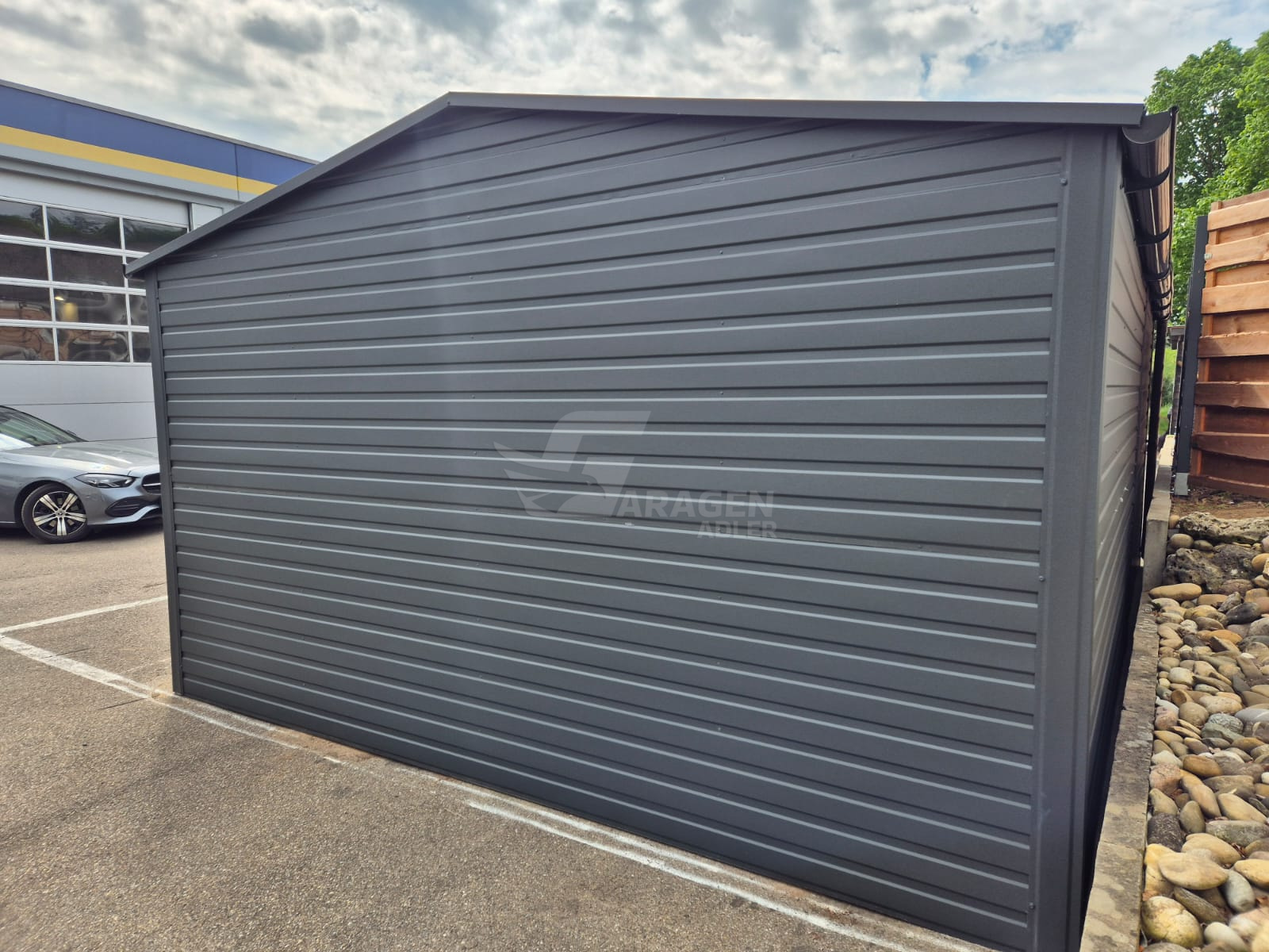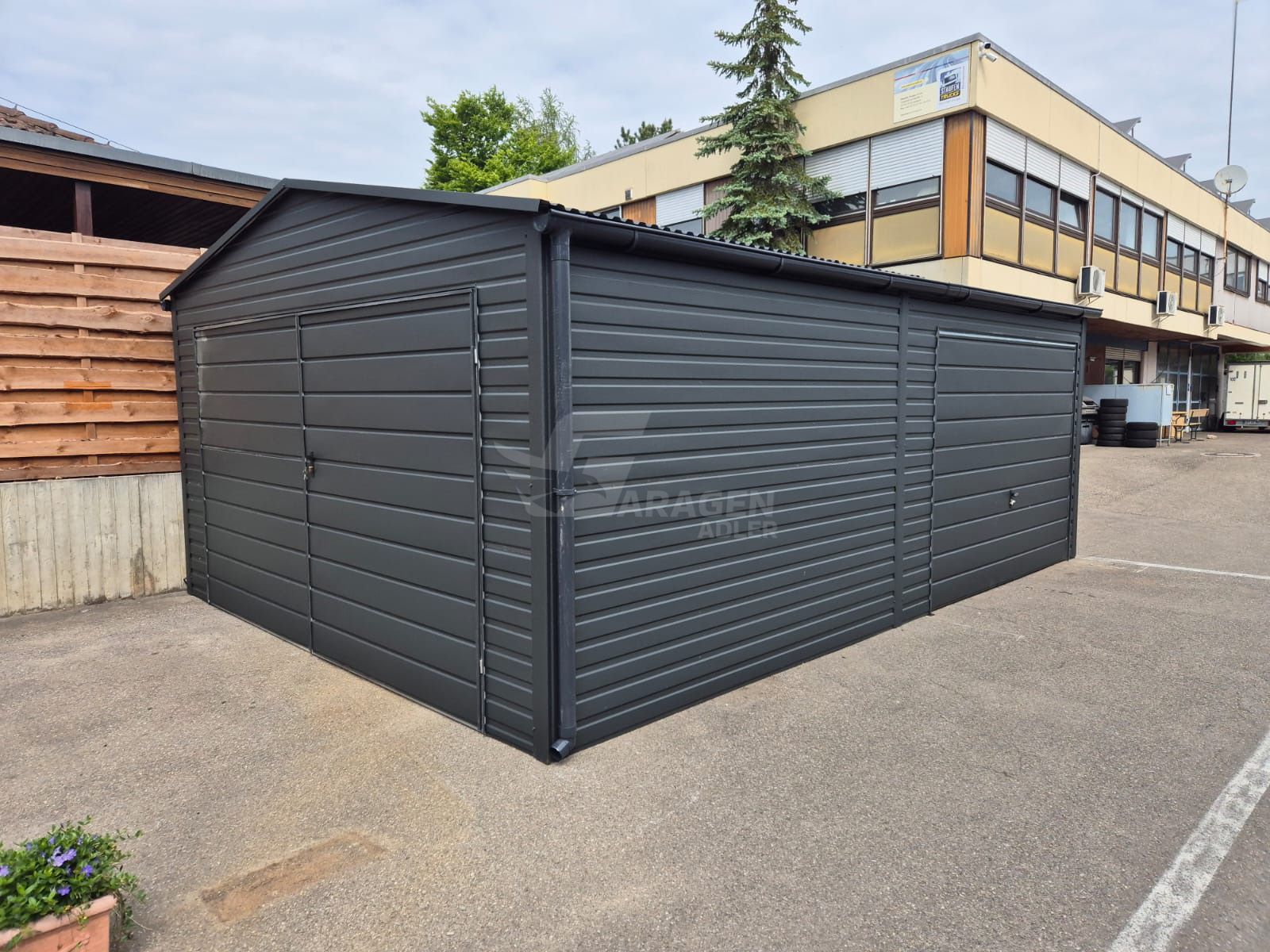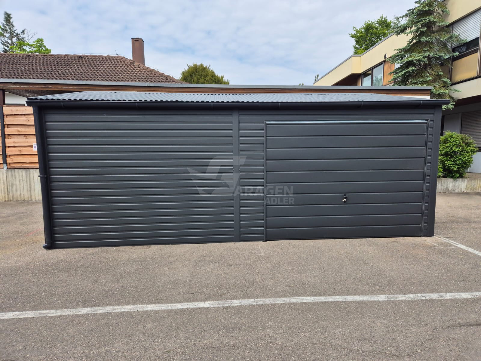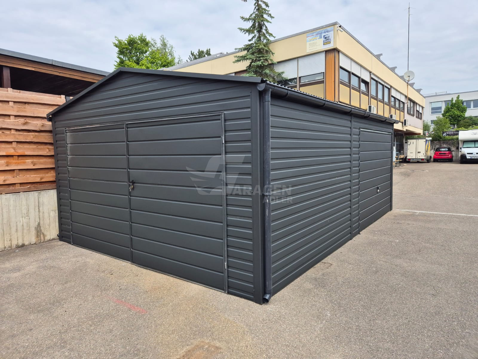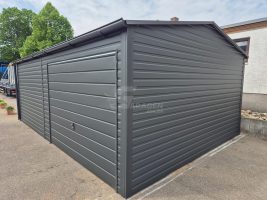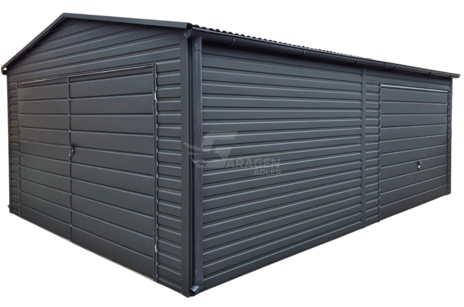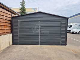 Blechgarage 4,5×6,5m – Schwingtor – Zweiflügeliges Tor – Anthrazit – Dachrinnen – Satteldach GP573