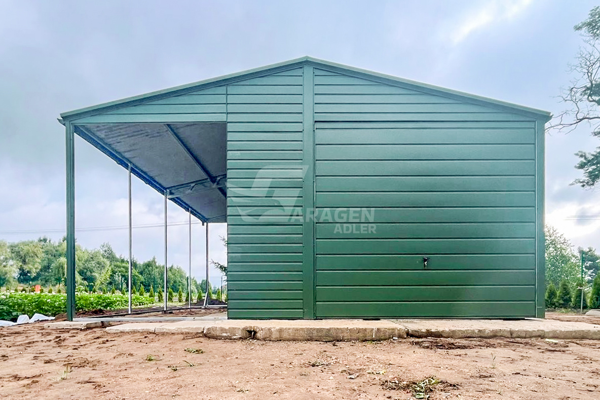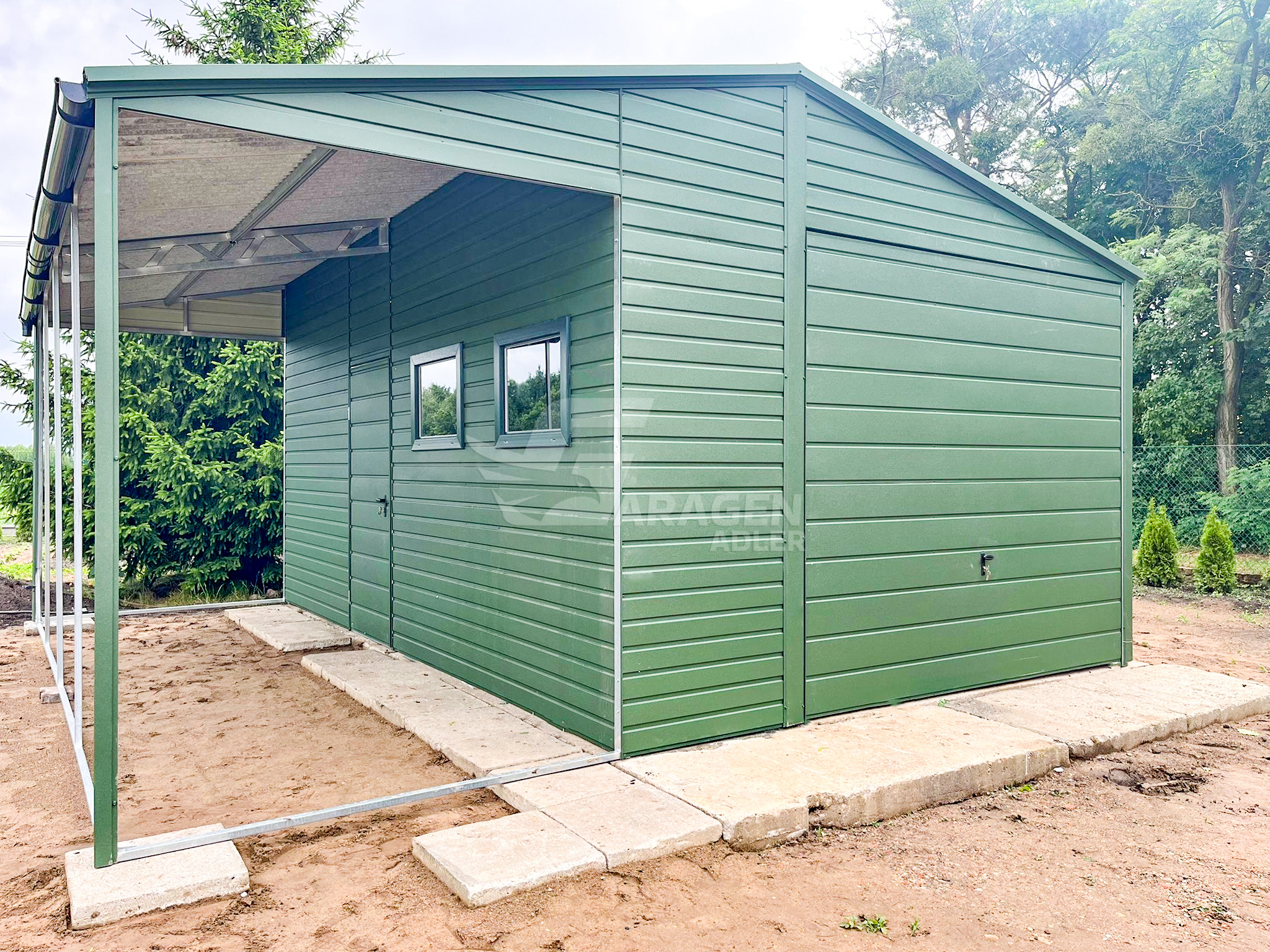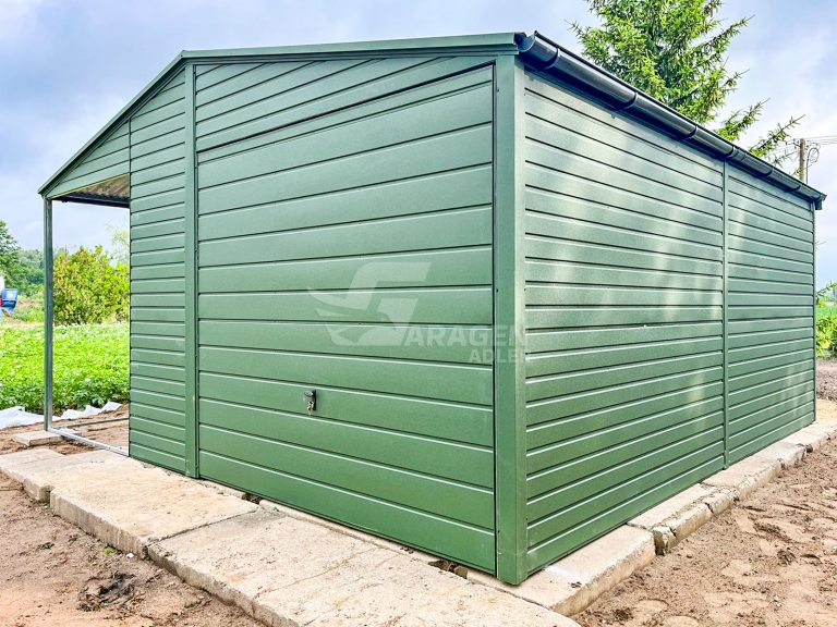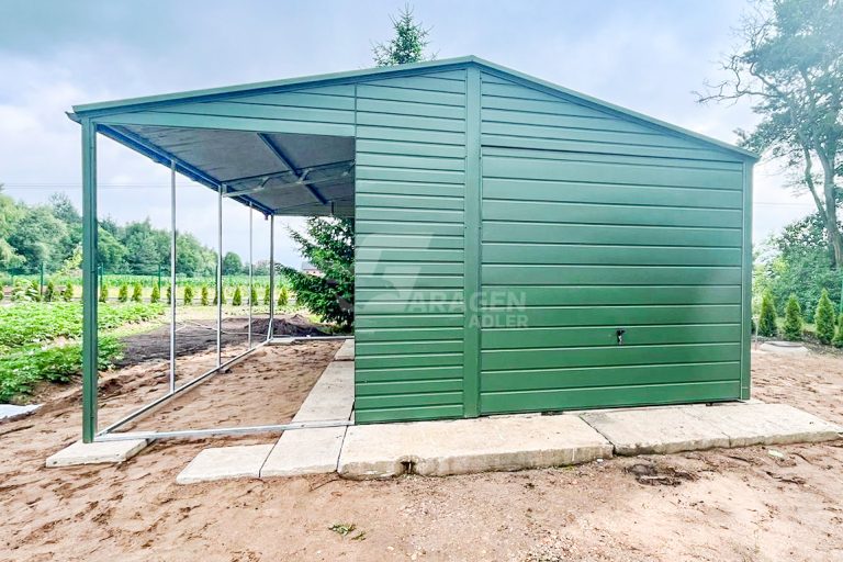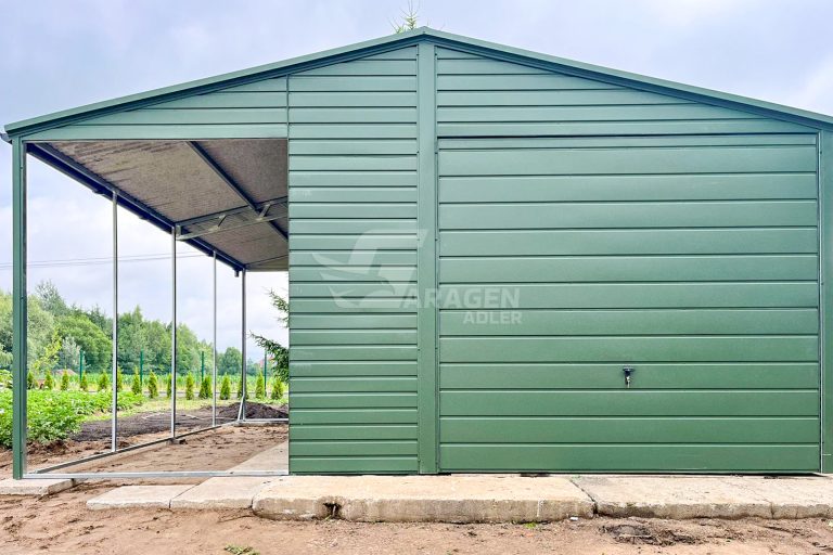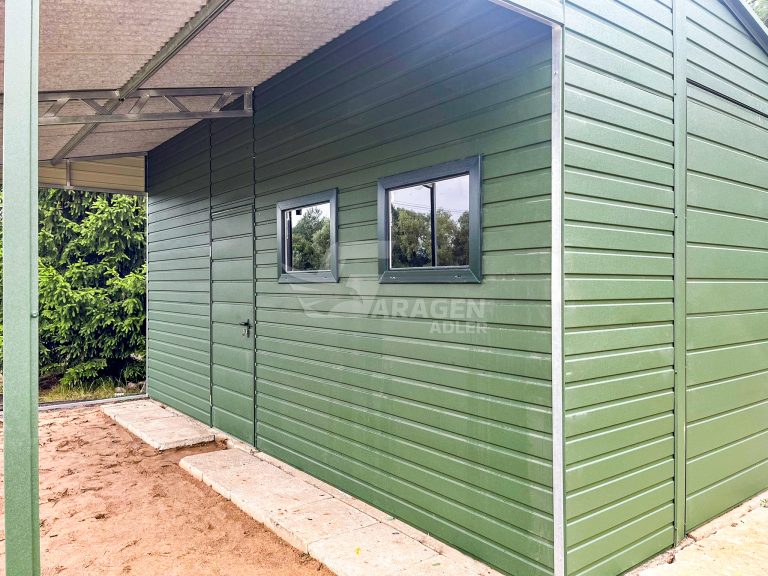 Blechgarage 4x6m + Überdachung 2m – Schwingtor – Tür – 2x PVC Kippfenster – Grün – Dachrinnen – Satteldach ID676