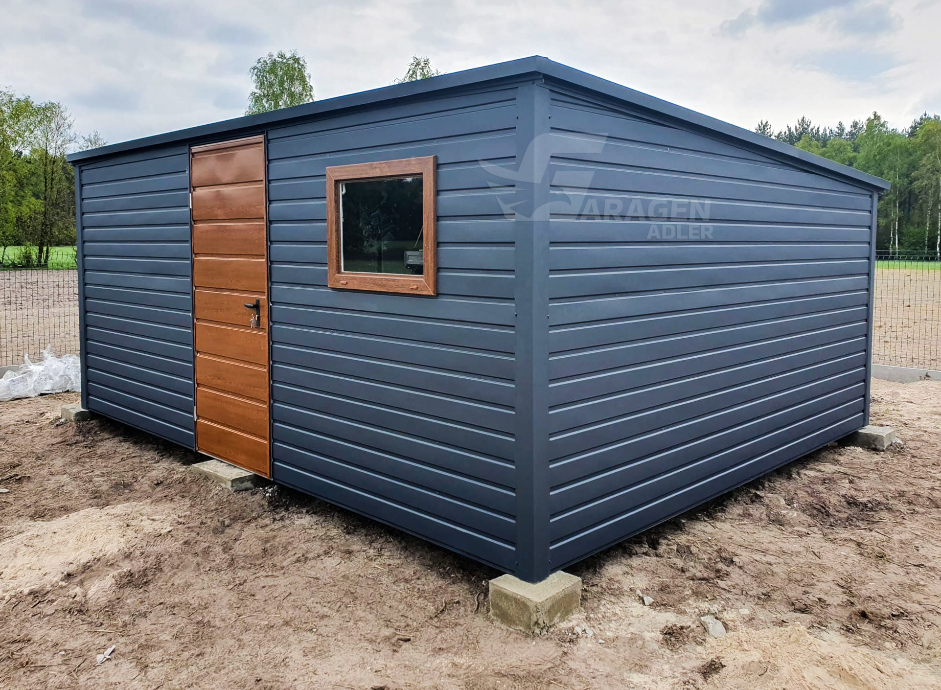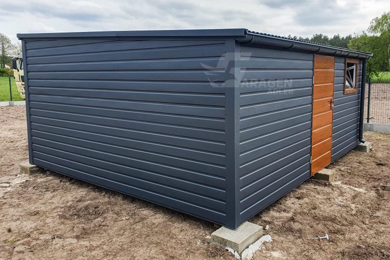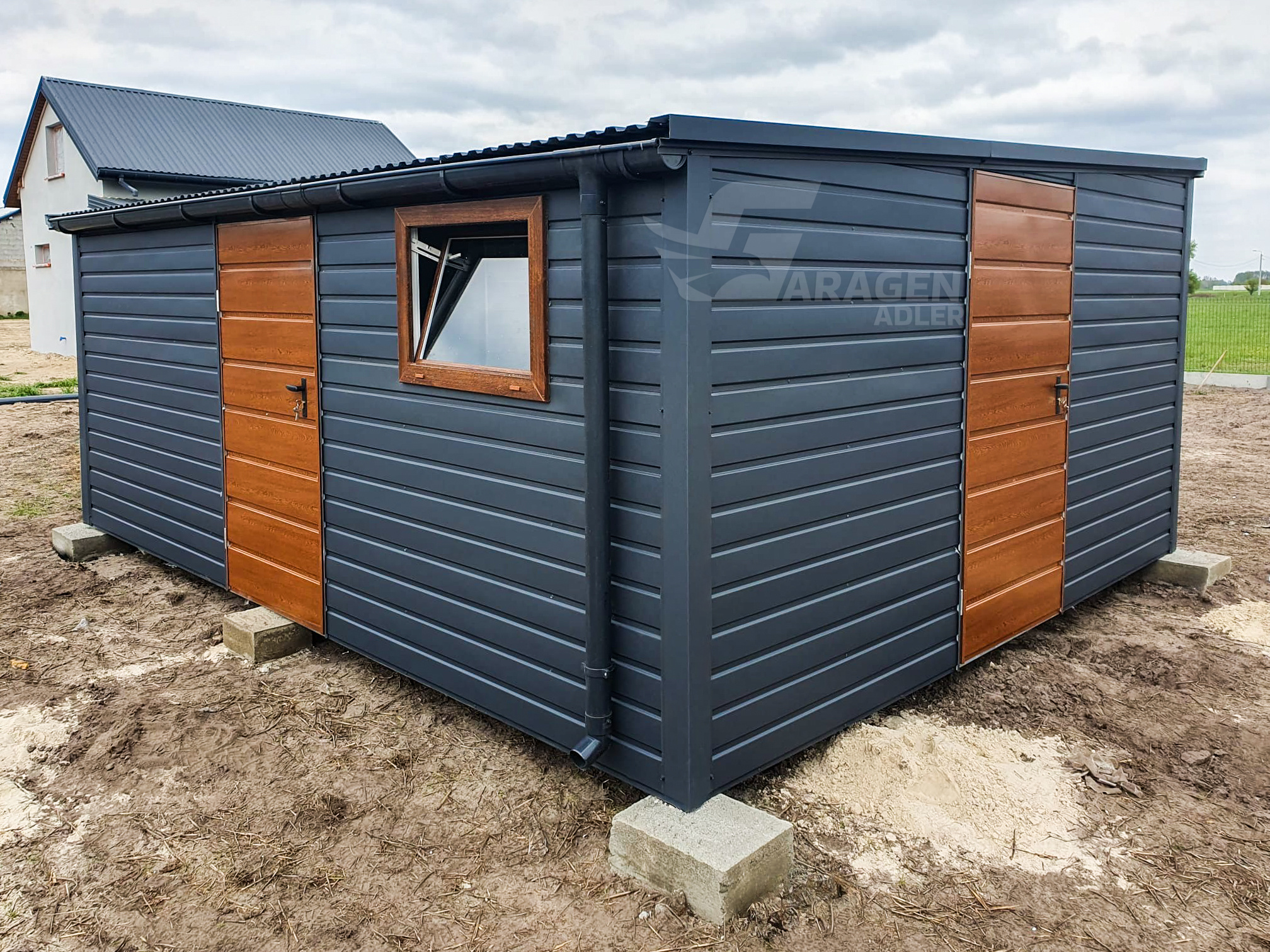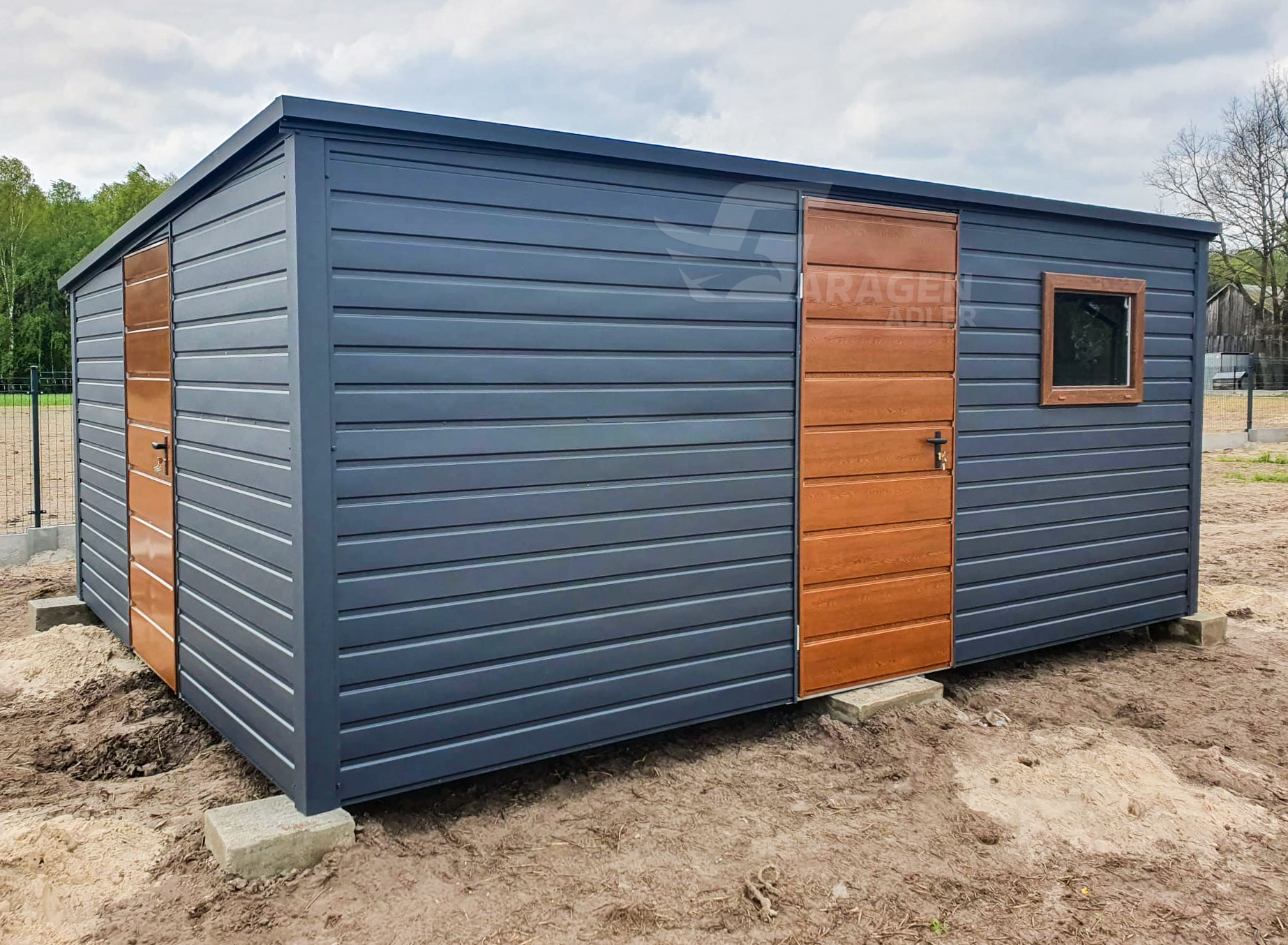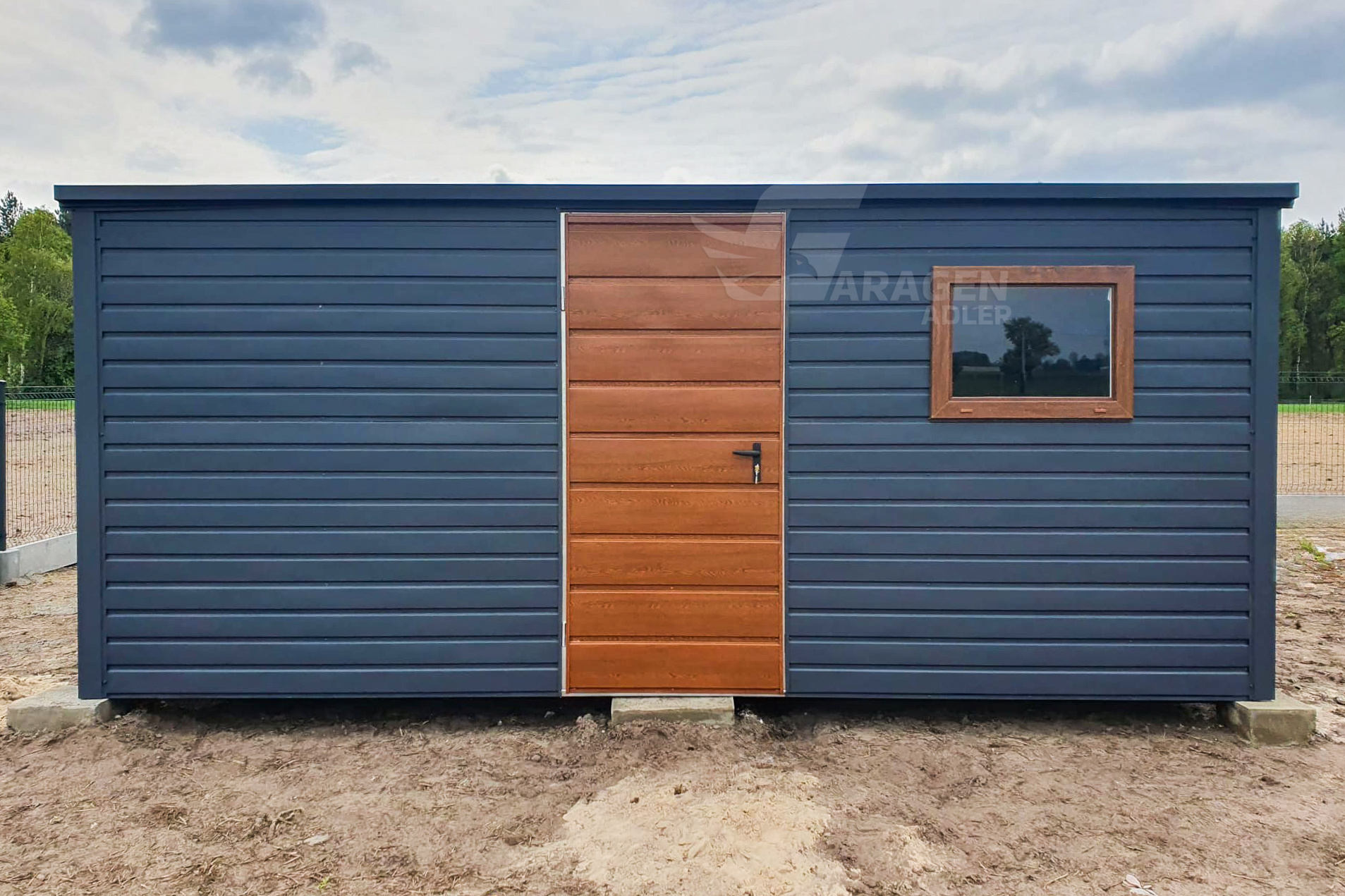 - Flachdach Pultdach Farbe: Anthrazit Matte 7016Tür in der Abmessung:90x200cm Horizontal Blech T17 Farbe : Goldene Eiche