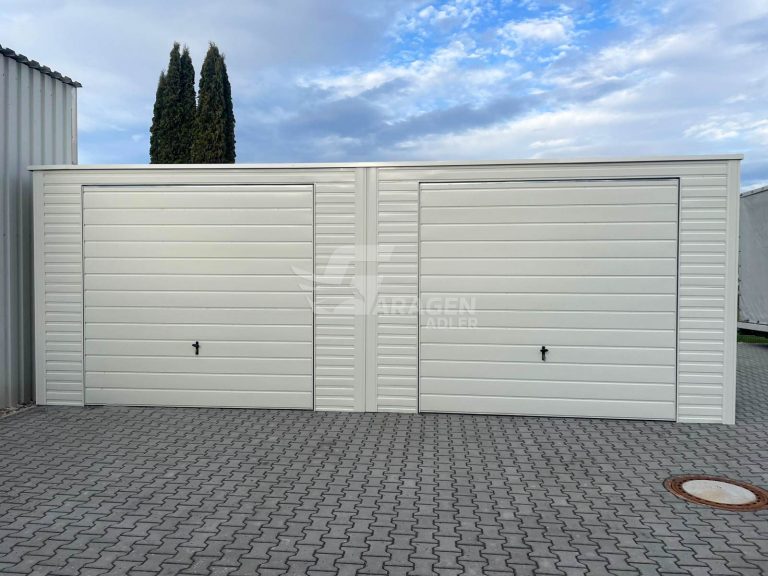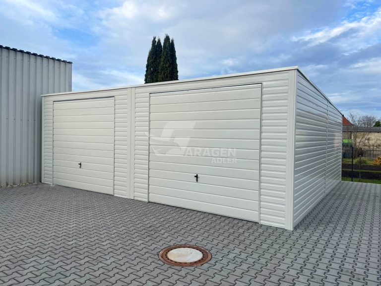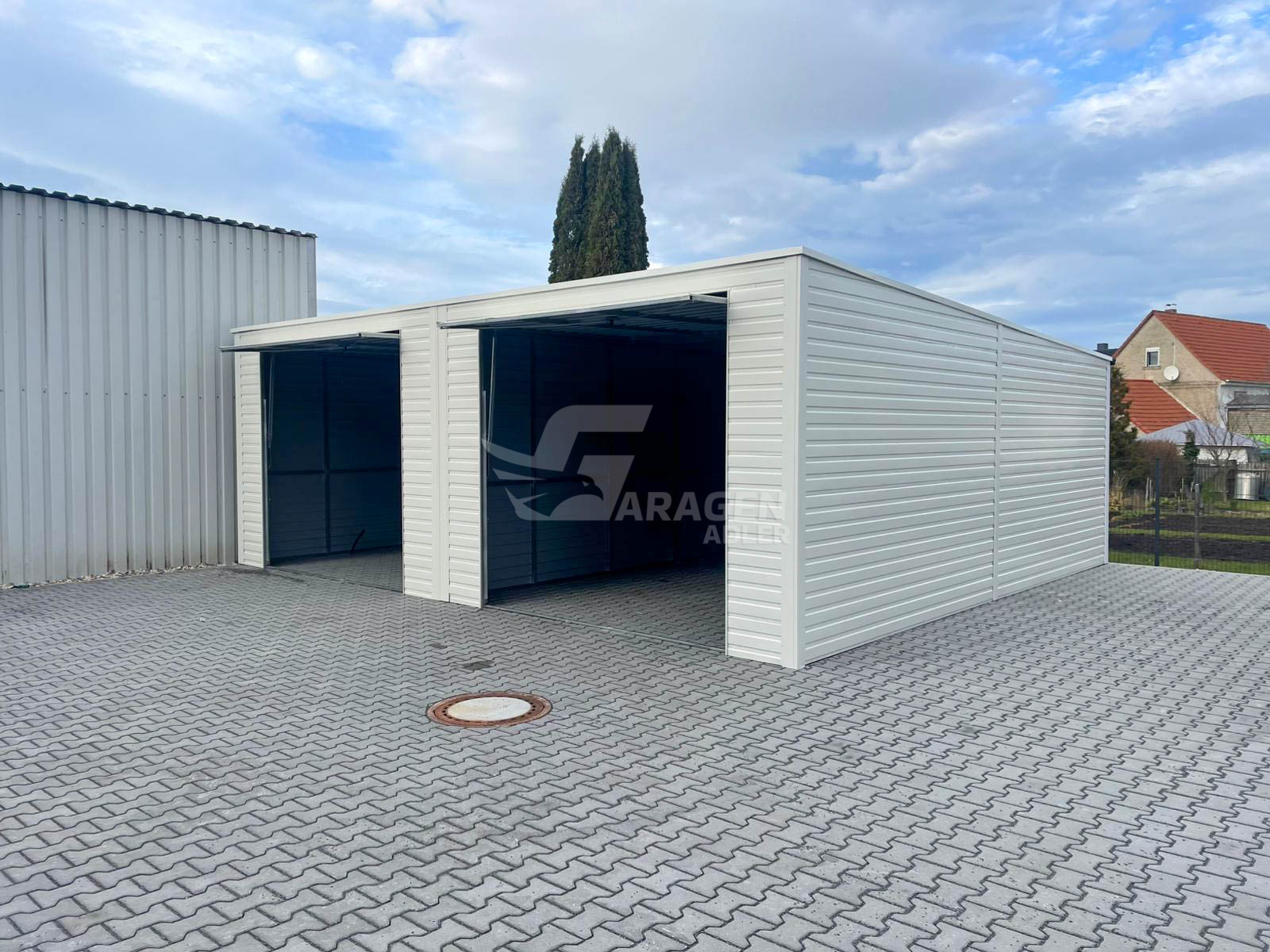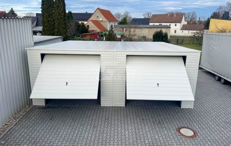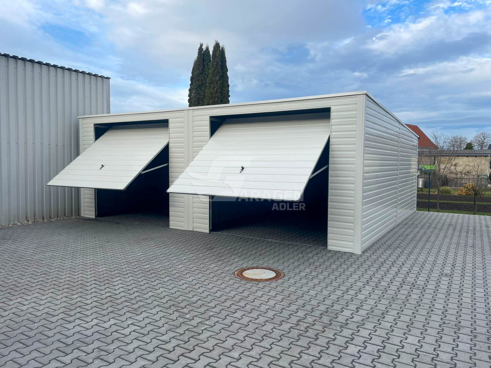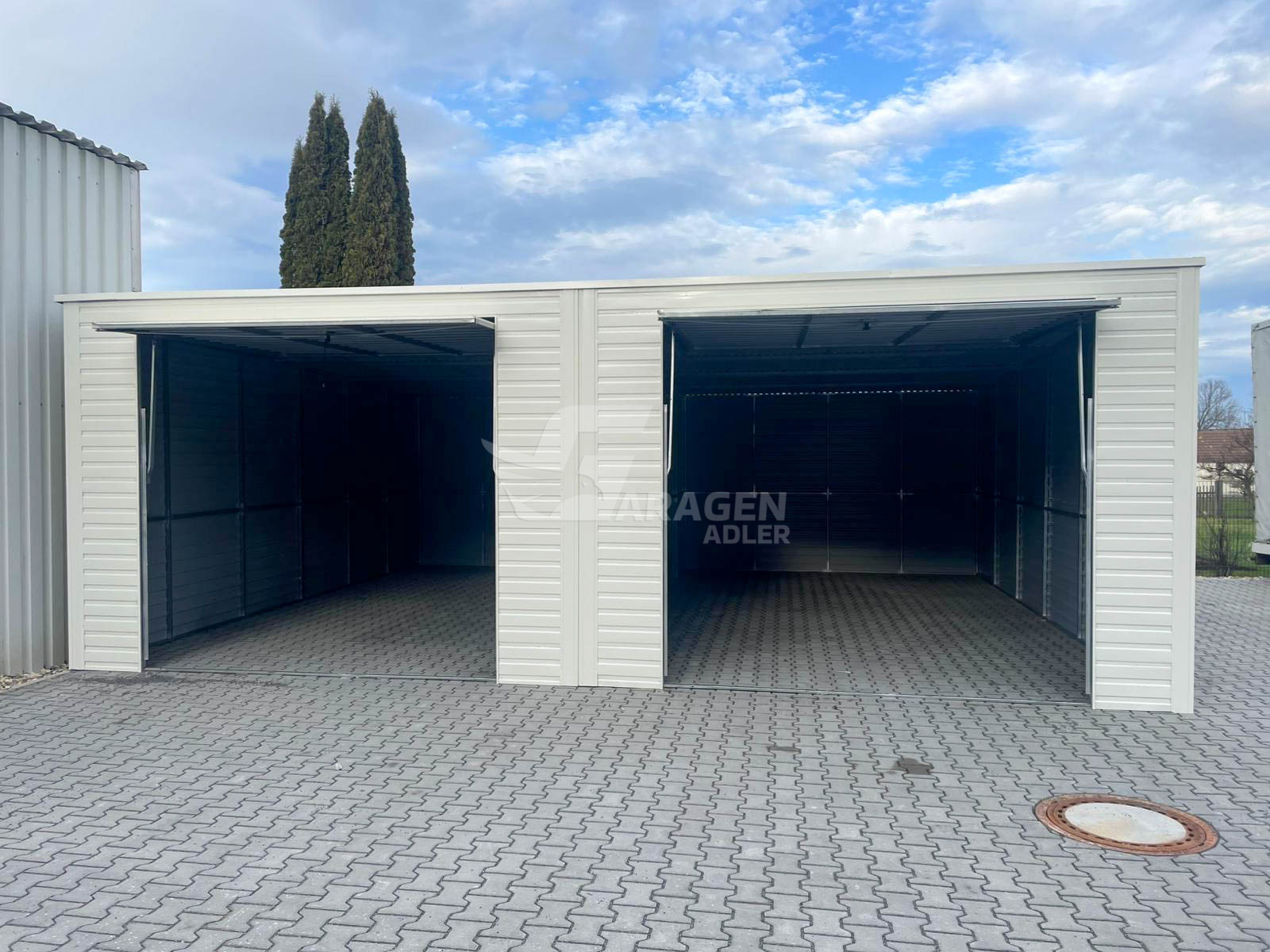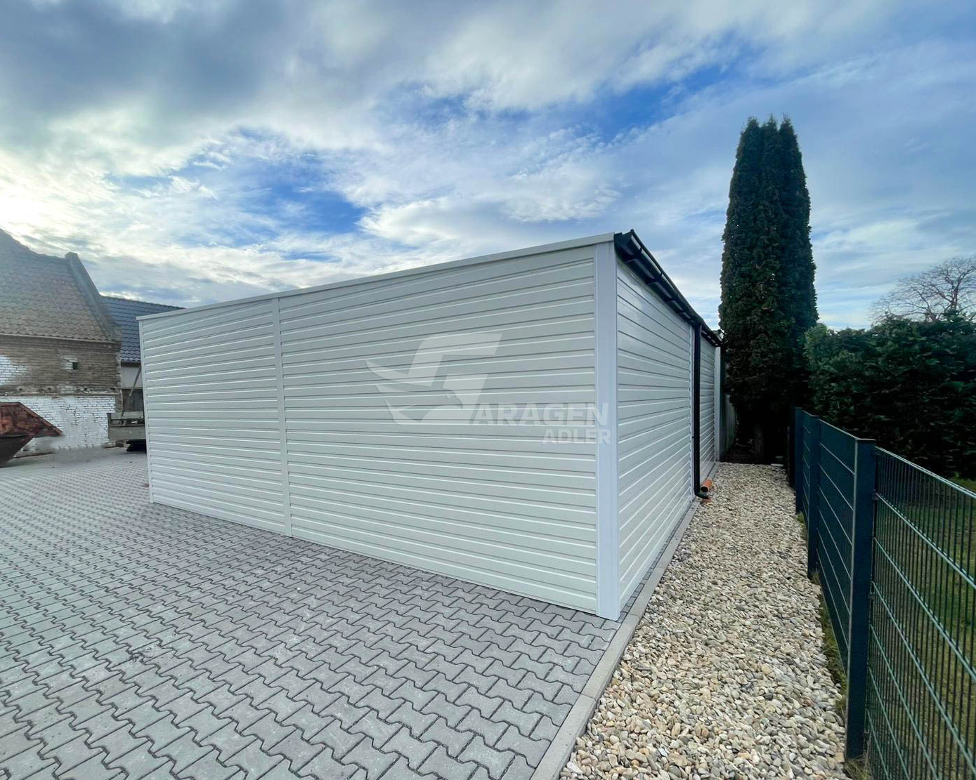 Blechgarage 8x7m – 2x Schwingtor – Weiß – Dachrinnen – Flachdach GP524