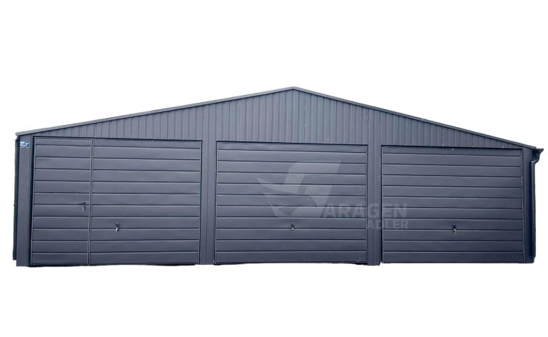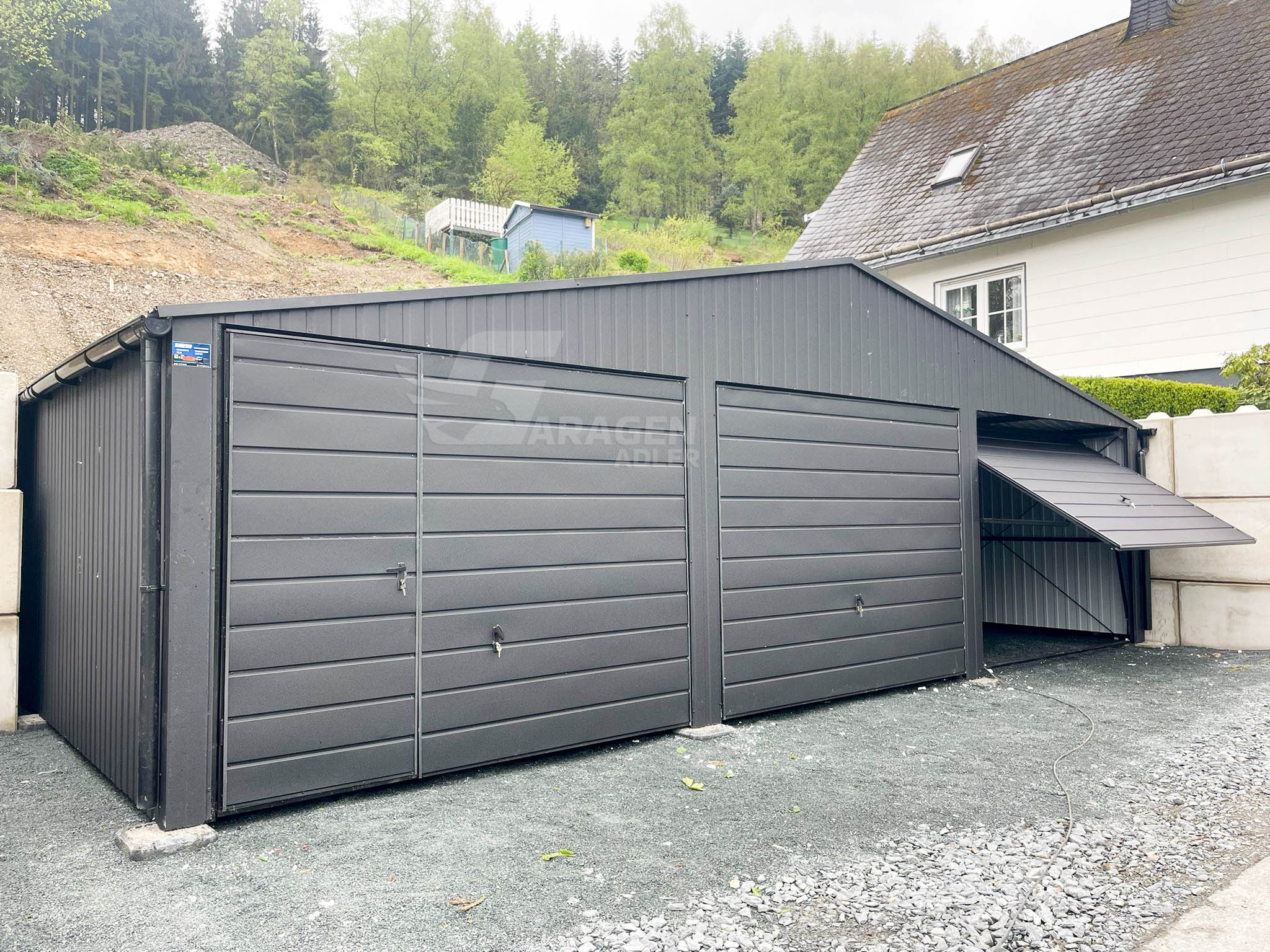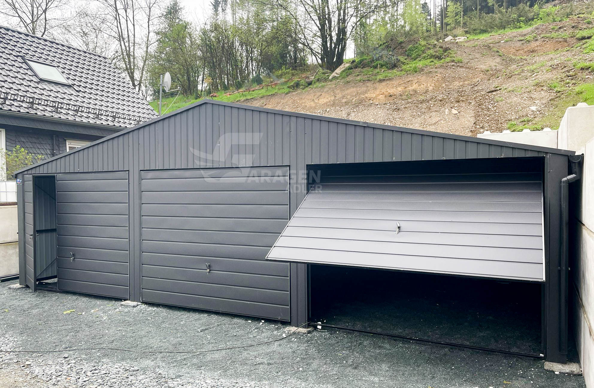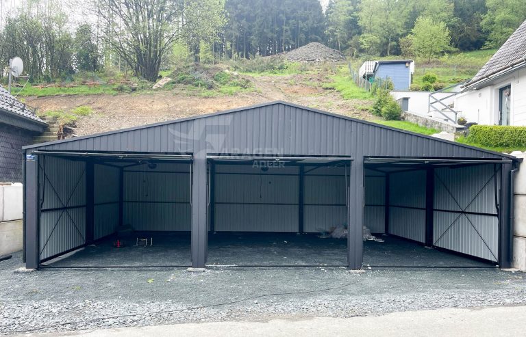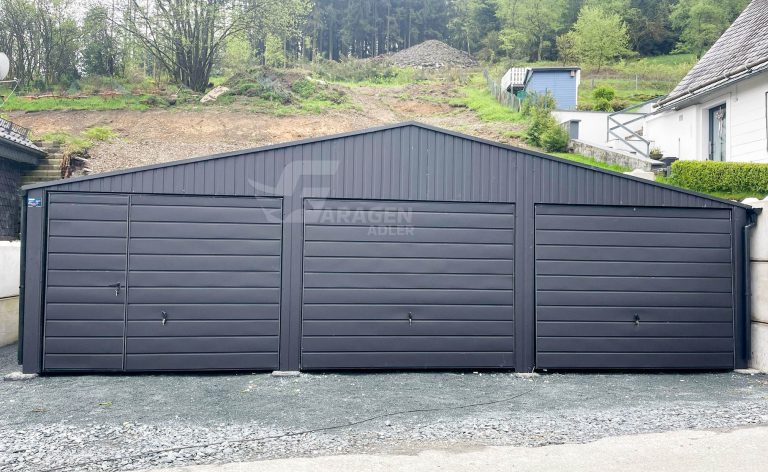 Blechgarage 9x6m 3xSchwingtor – Anthrazit – Dachrinnen – Satteldach GP134