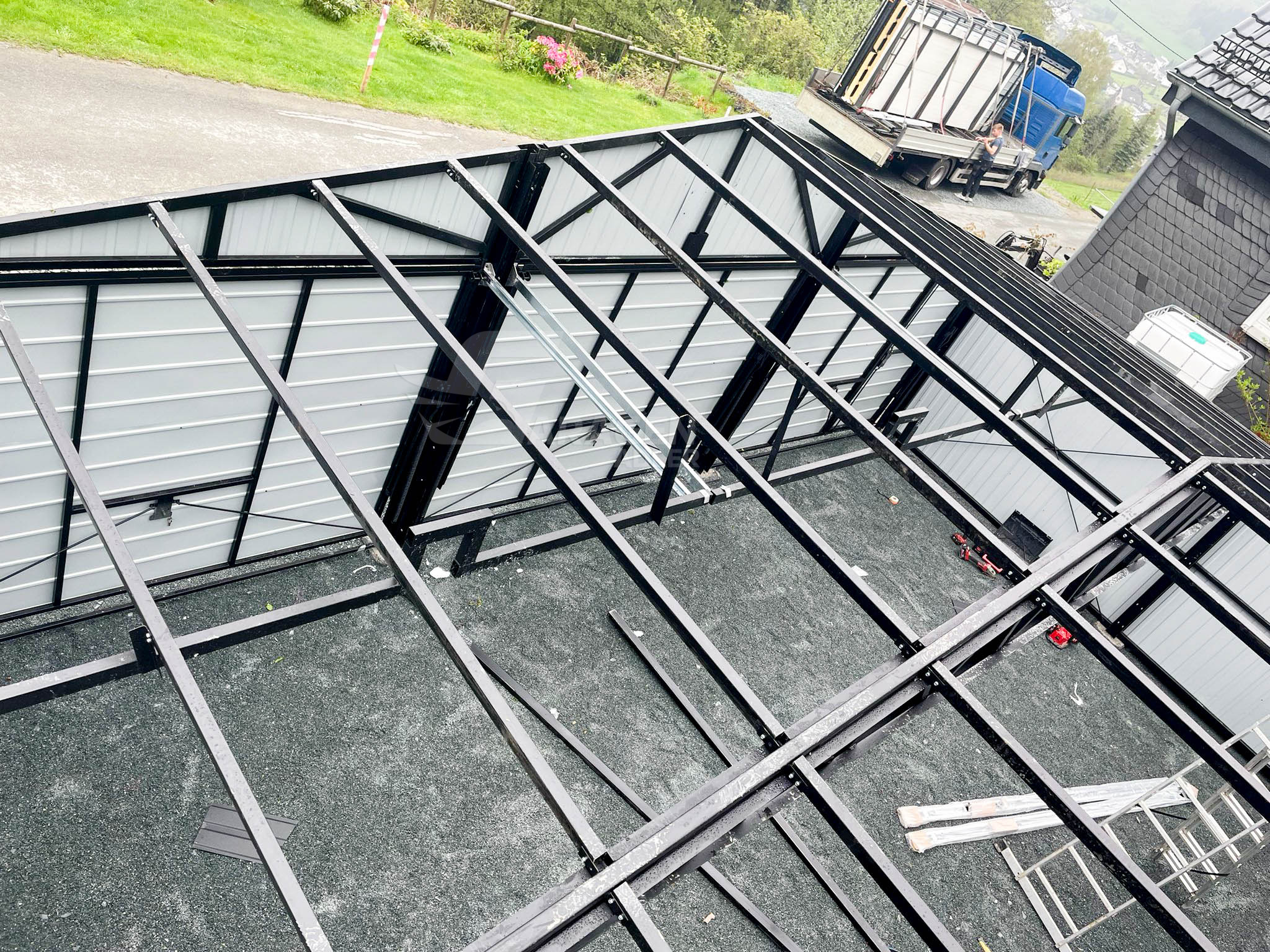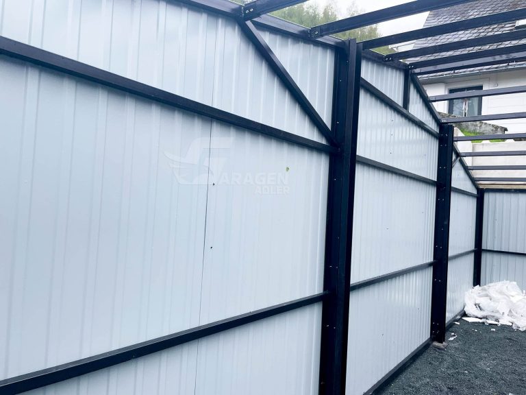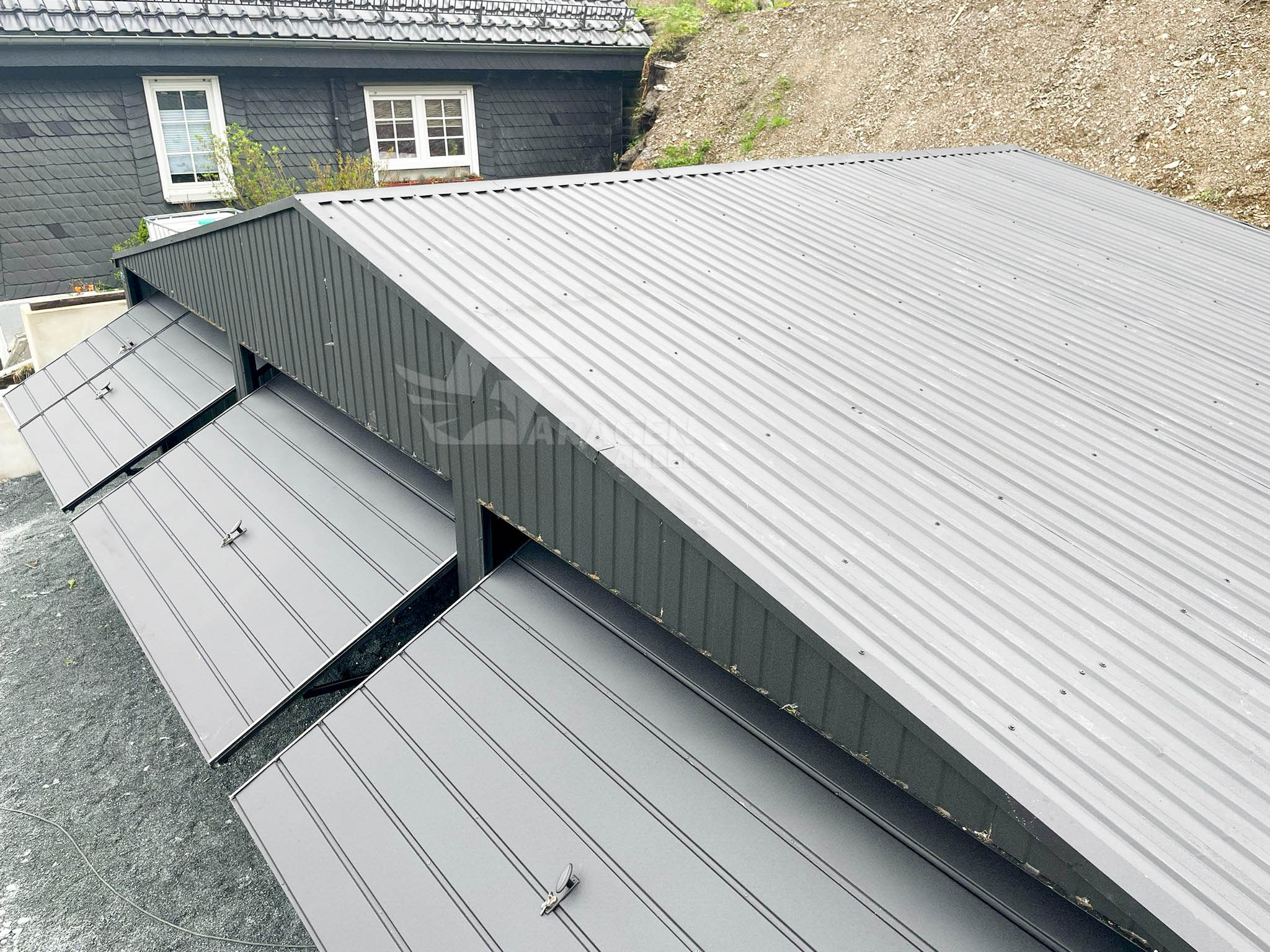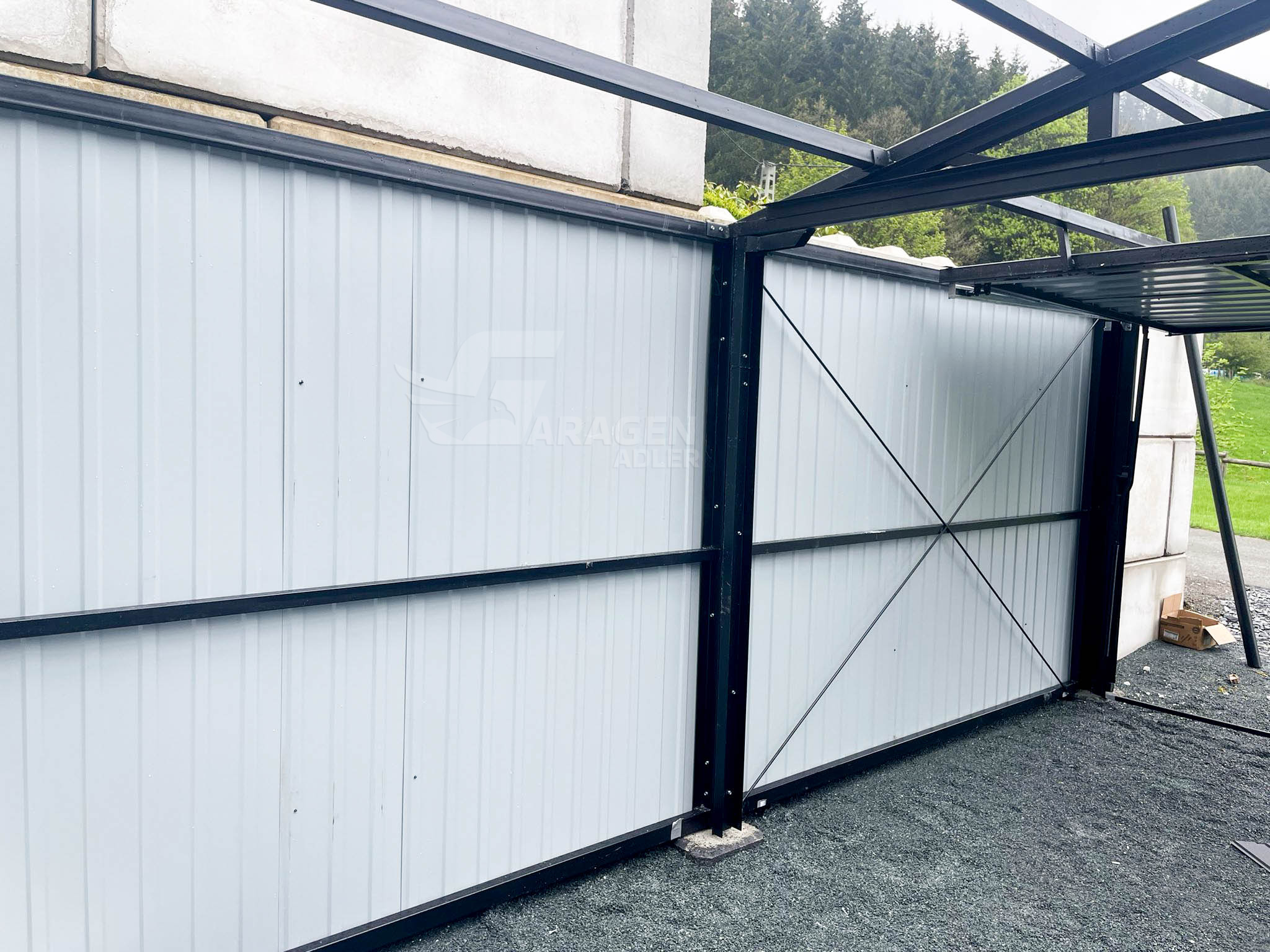Blechgarage 9x6m 3xSchwingtor – Anthrazit – Dachrinnen – Satteldach GP134