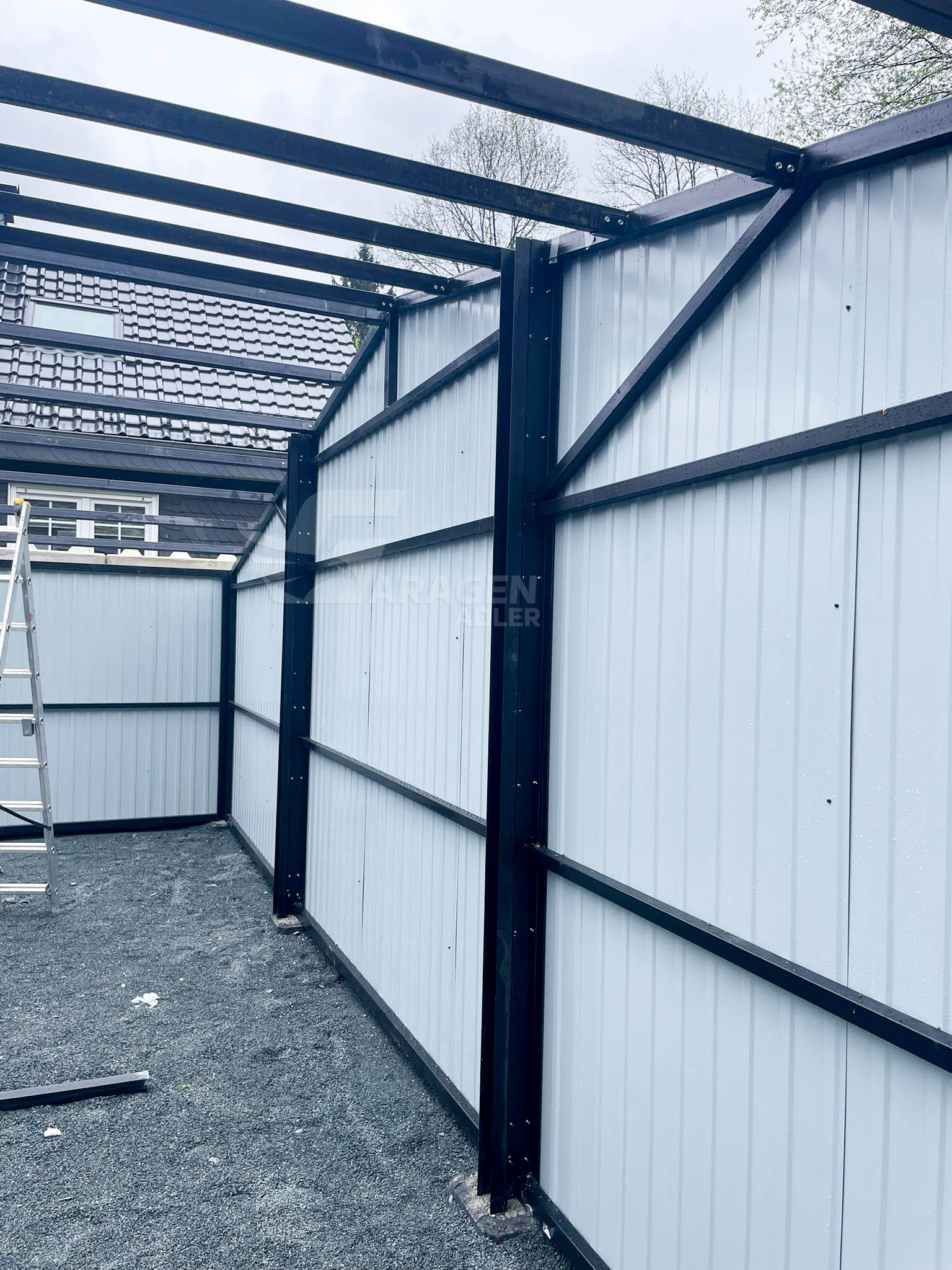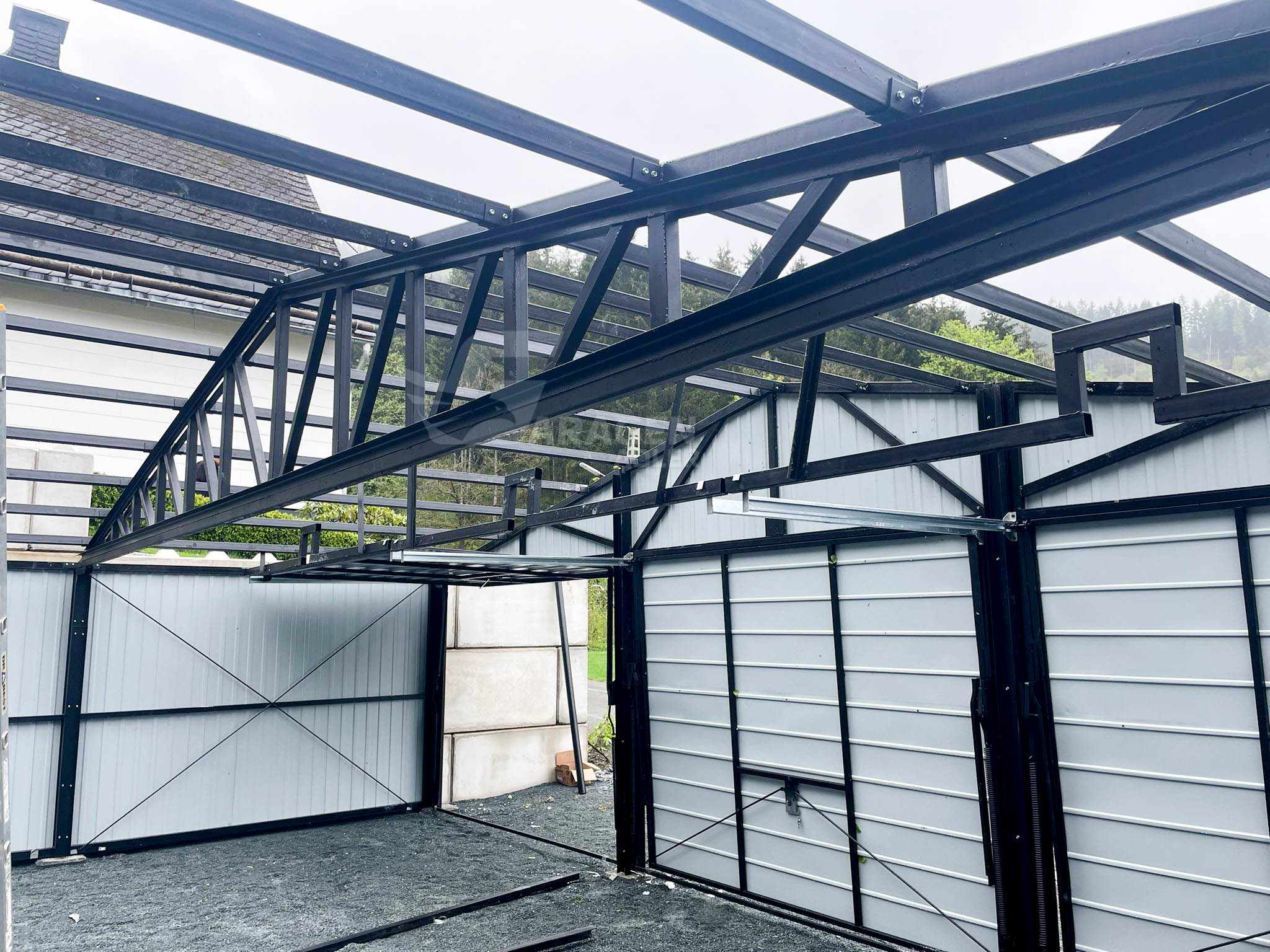 • Wir verwenden solide Verstärkungen der Konstruktion aus Winkeln, Trägern und geschlossenen ProfilenVerstärkung des Daches durch einen Stahlrahmen+ Dachkonstruktion aus robusten, geschlossenen, feuerverzinkten Profilen Wir fertigen jede garage nach ihren wünschen. Bitte Kontaktieren sie uns, wenn sie irgendwelche fragen haben.