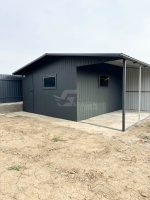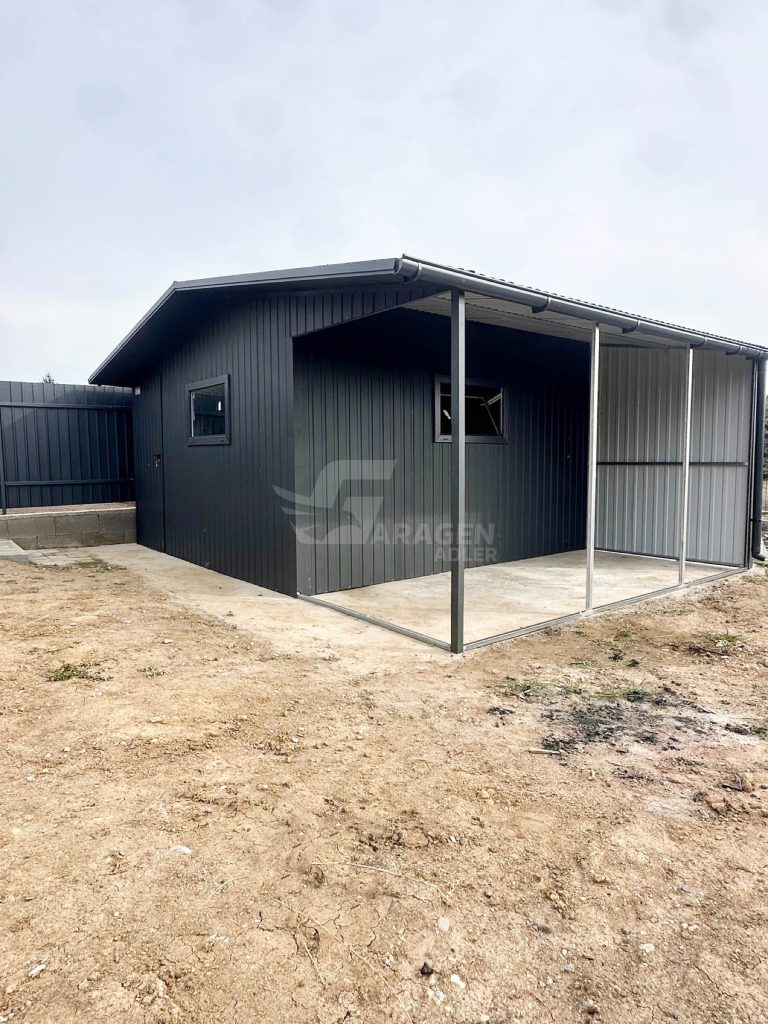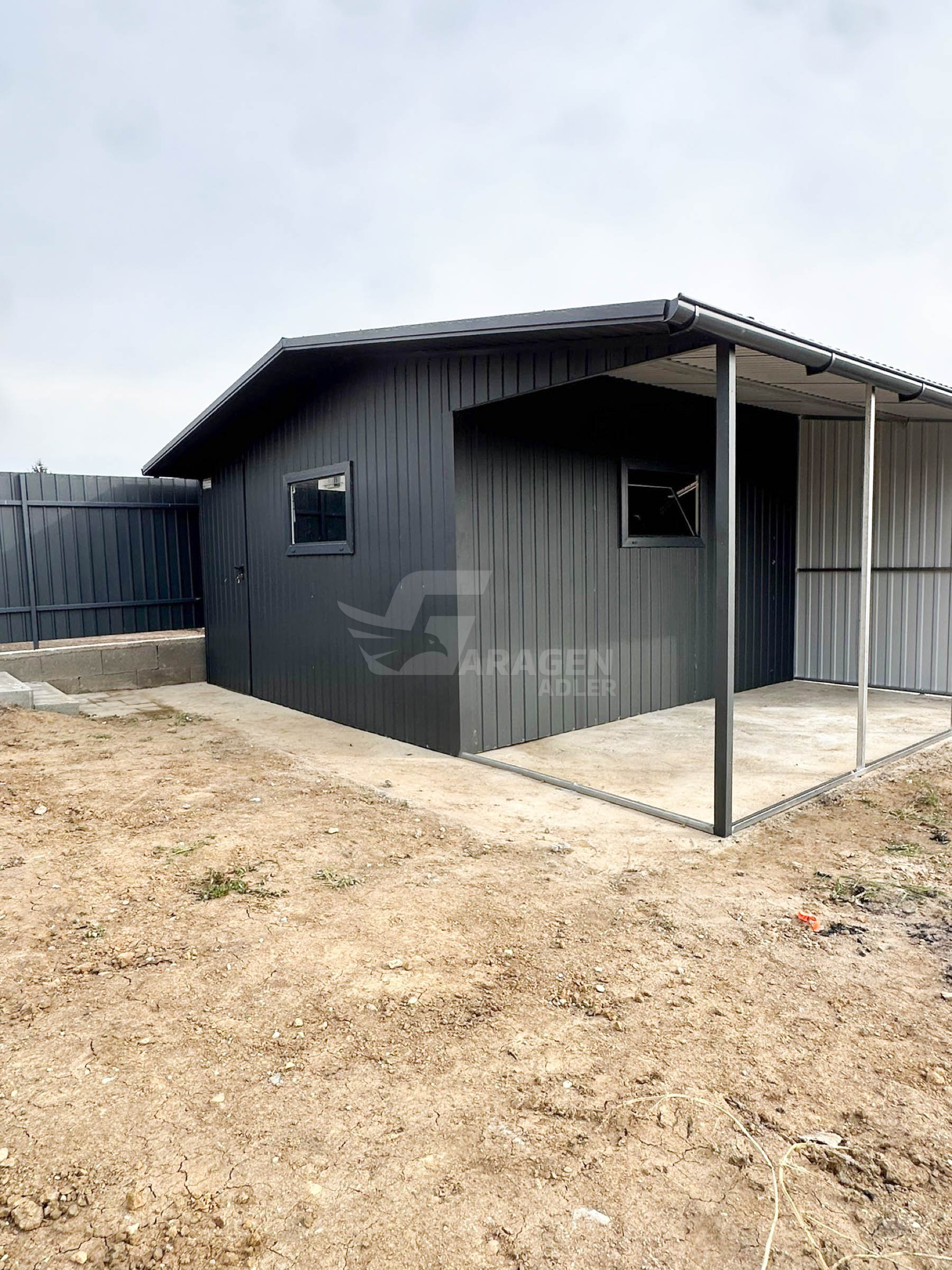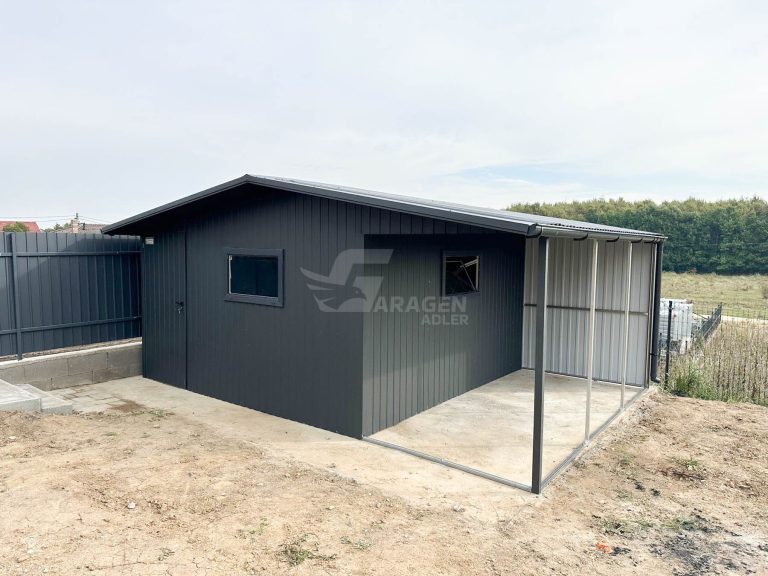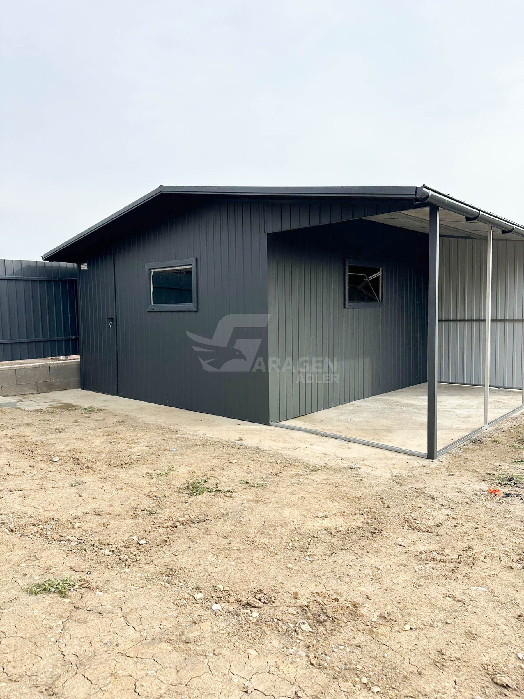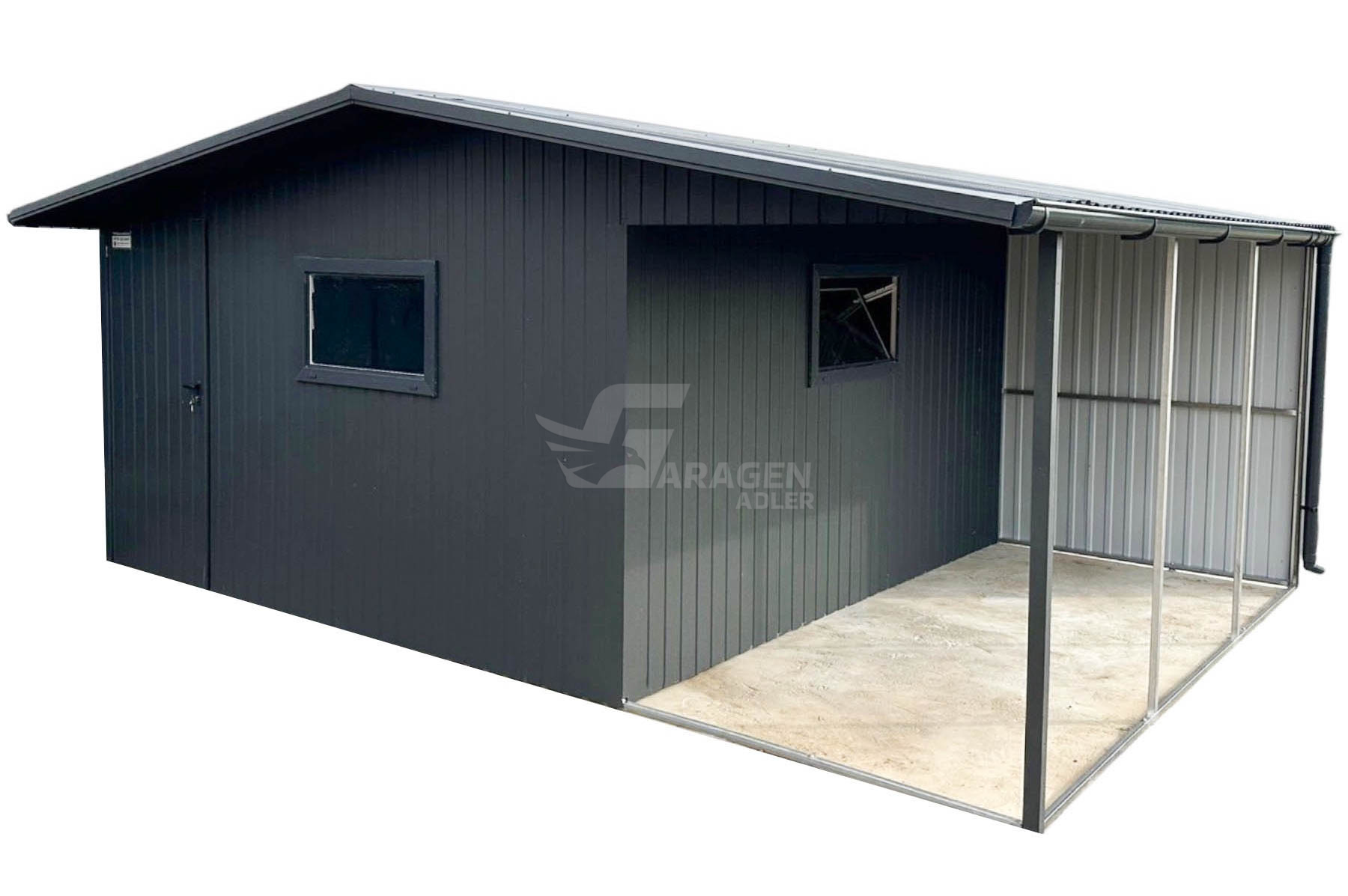 Blechgarage – Gartenschuppen 4x6m + Überdachung 2m – Tür – 2x PVC Kippfenster – Anthrazit – Dachrinnen – Satteldach ID921