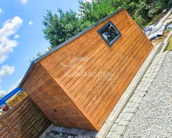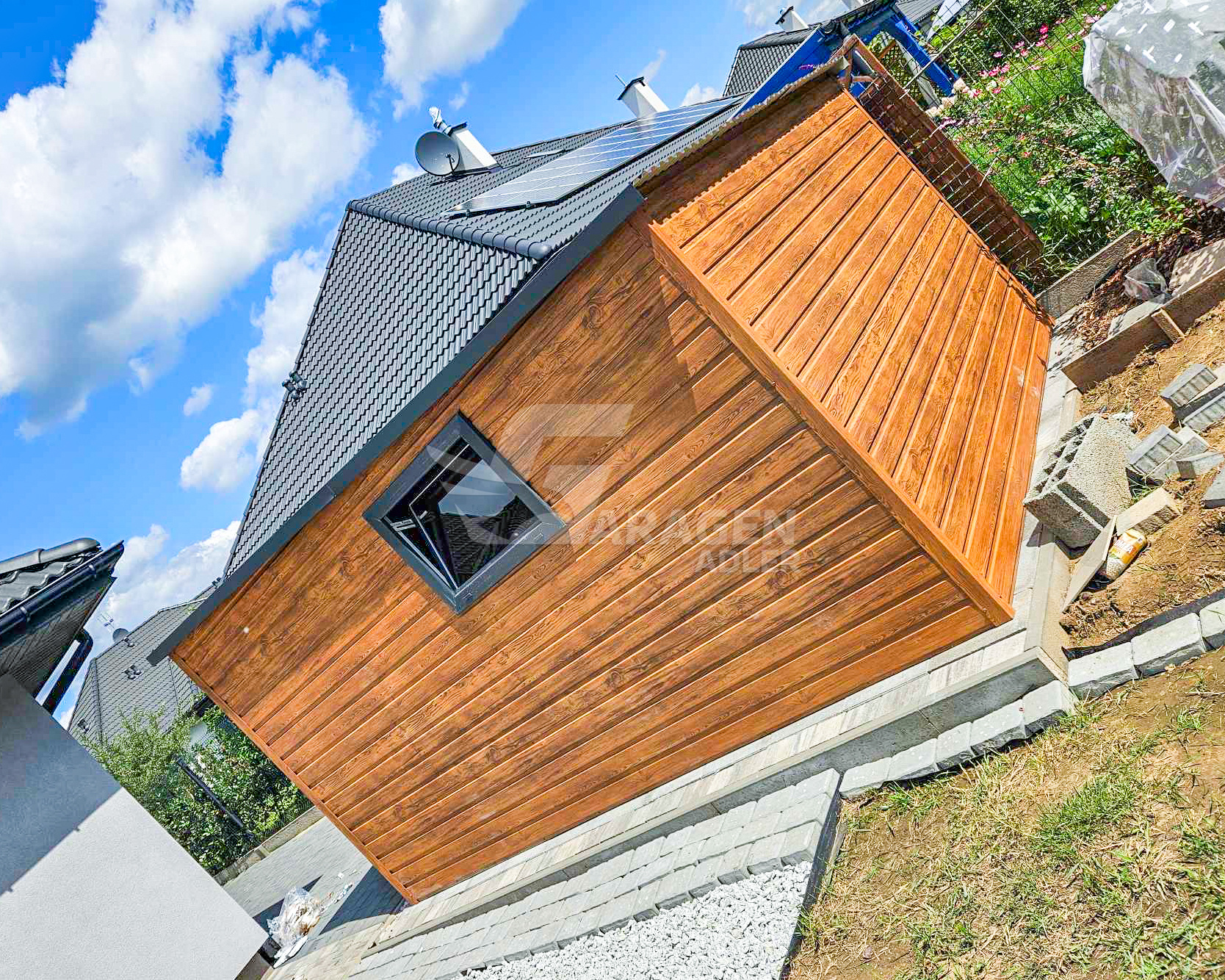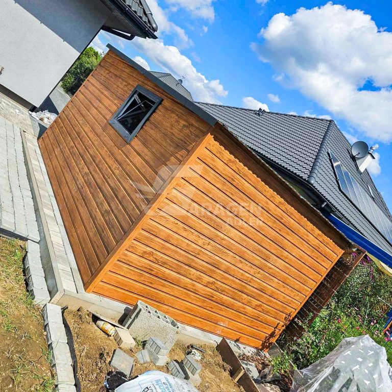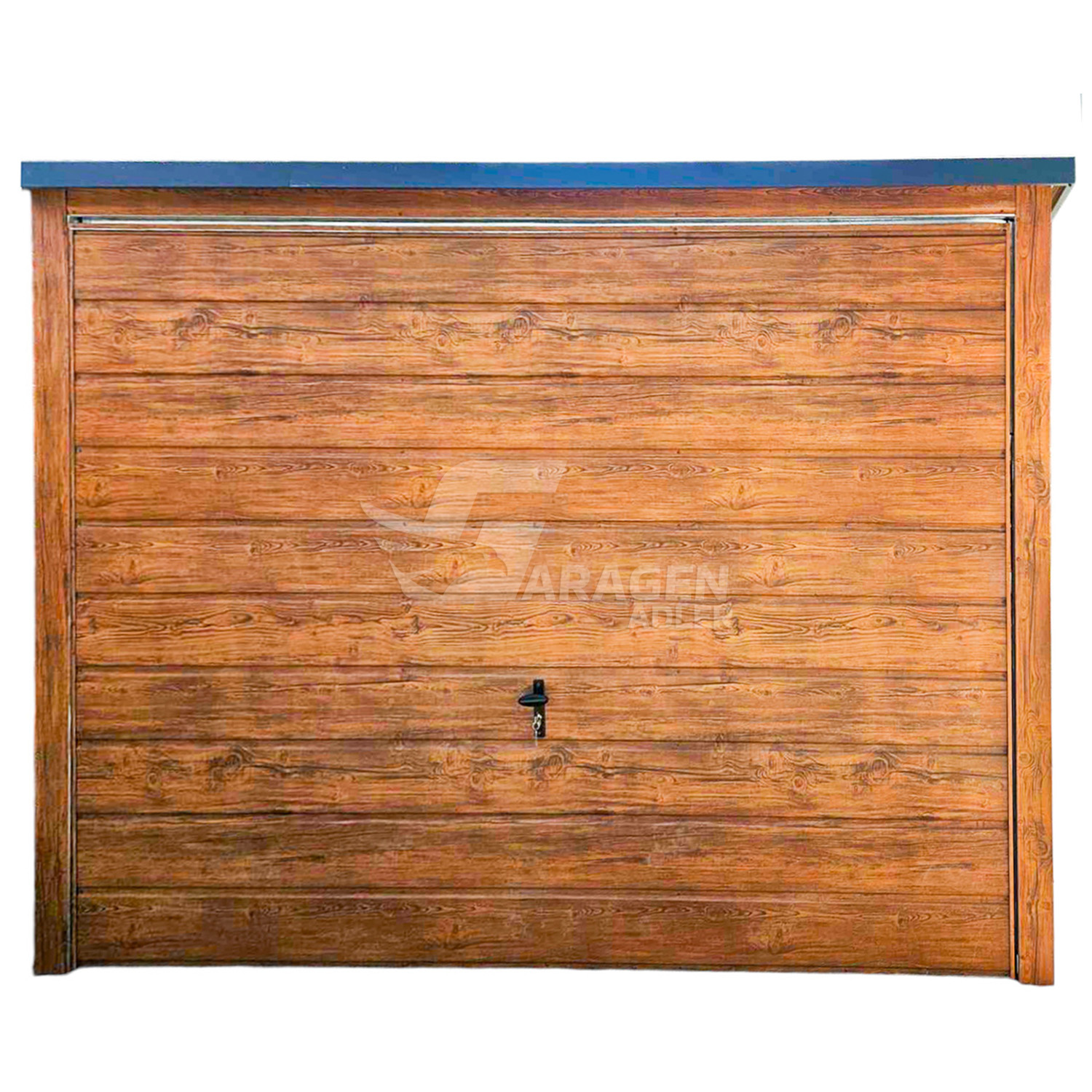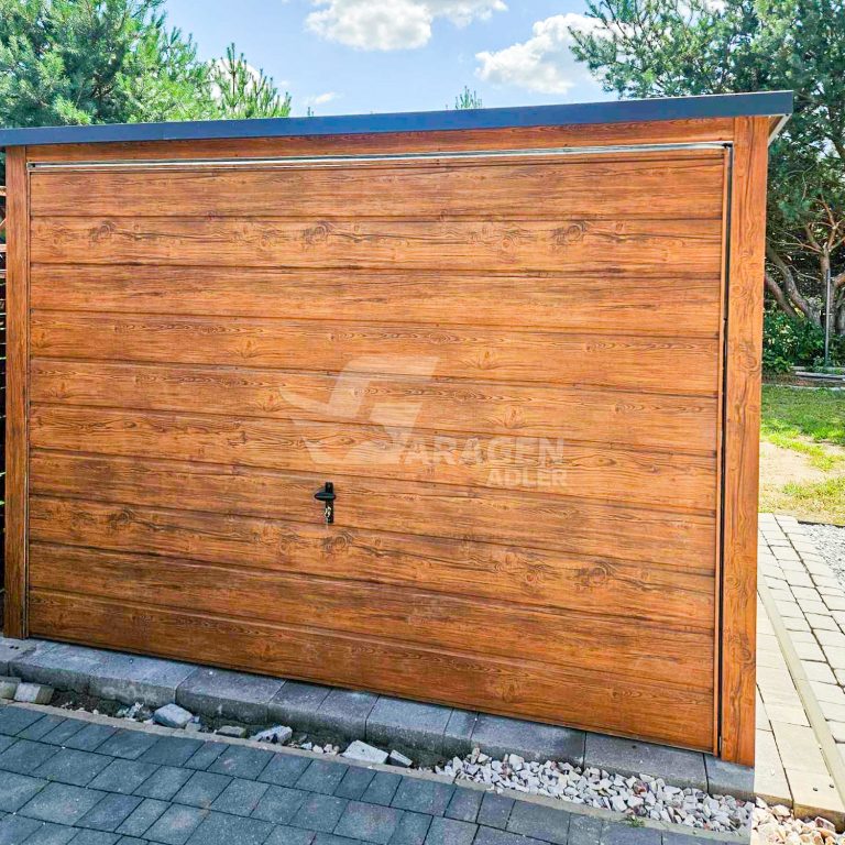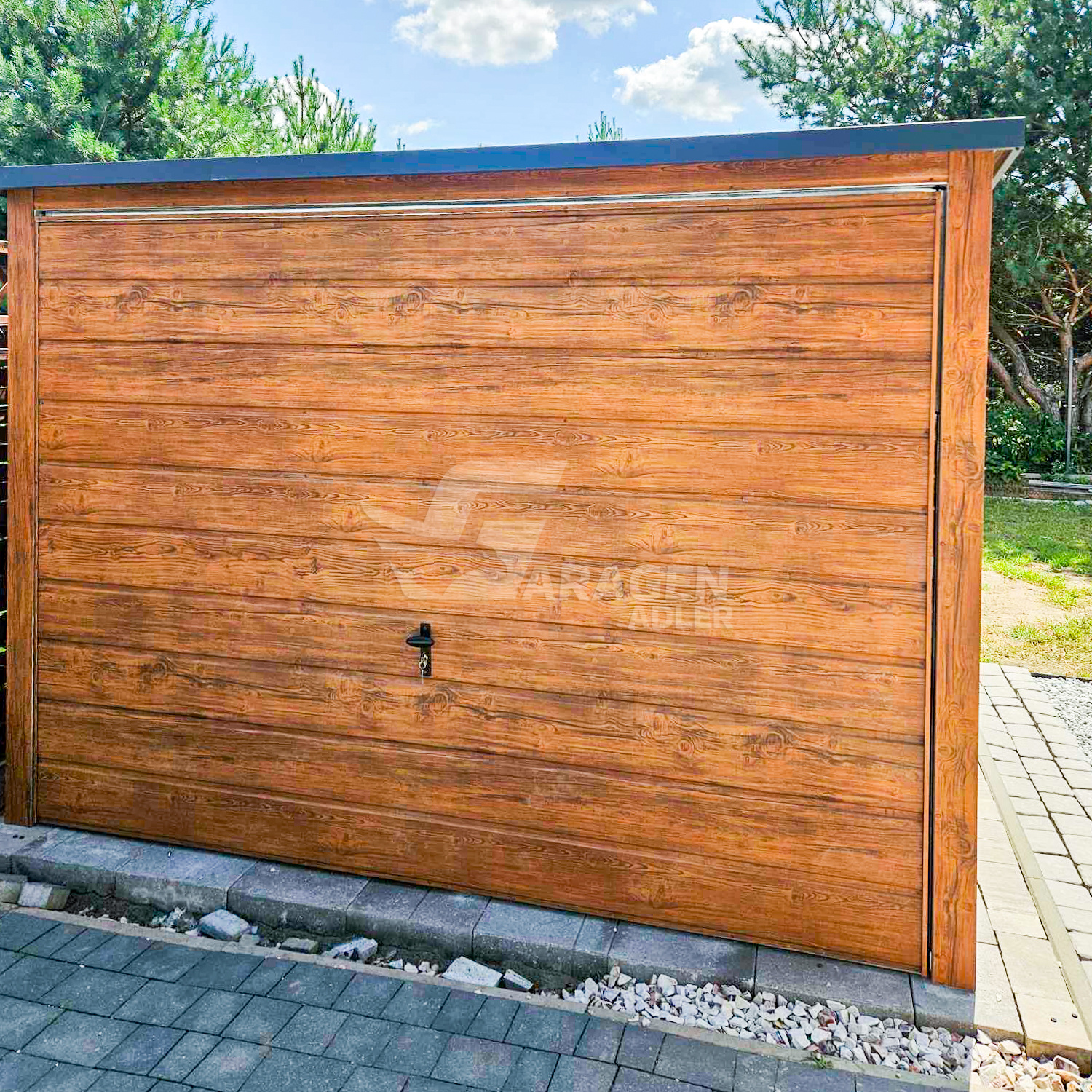 Blechgarage 3x4m – Schwingtor – PVC Kippfenster – Helles Walnussholz – Holzoptik – Flachdach ID672