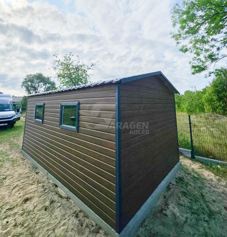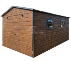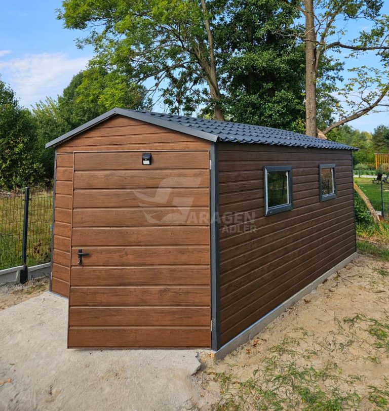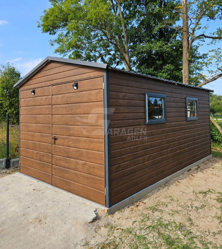 Blechgarage 3x5m – Zweiflügeliges Tor – 2x PVC Kippfenster – Metalldachziegel – Dunkles Walnussholz – Holzoptik – Satteldach | ID709 |