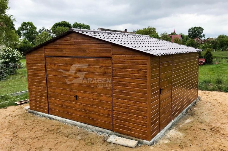 Blechgarage 5x6m Schwingtor – Dunkles Walnussholz – Holzoptik – Metalldachziegel – Satteldach GP99