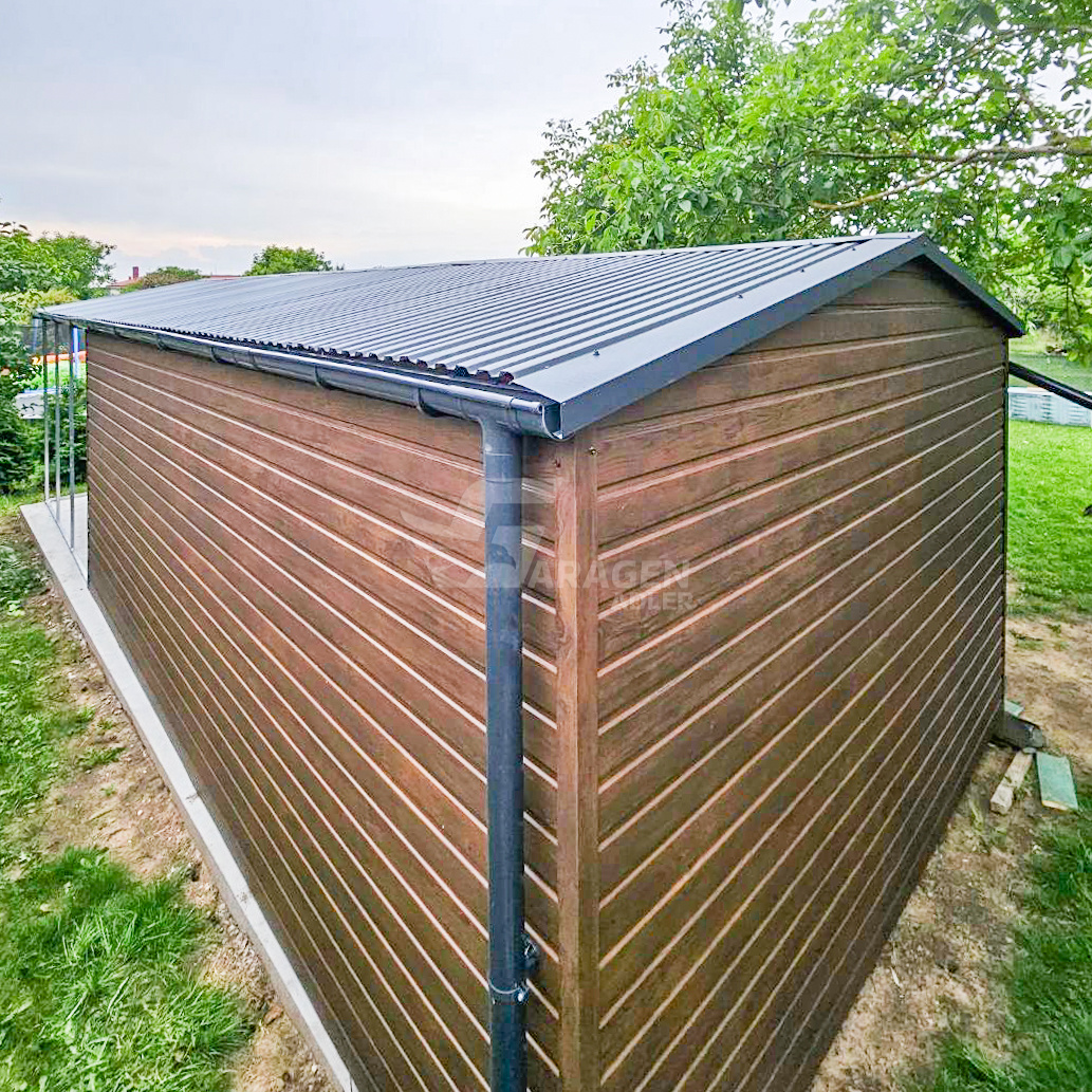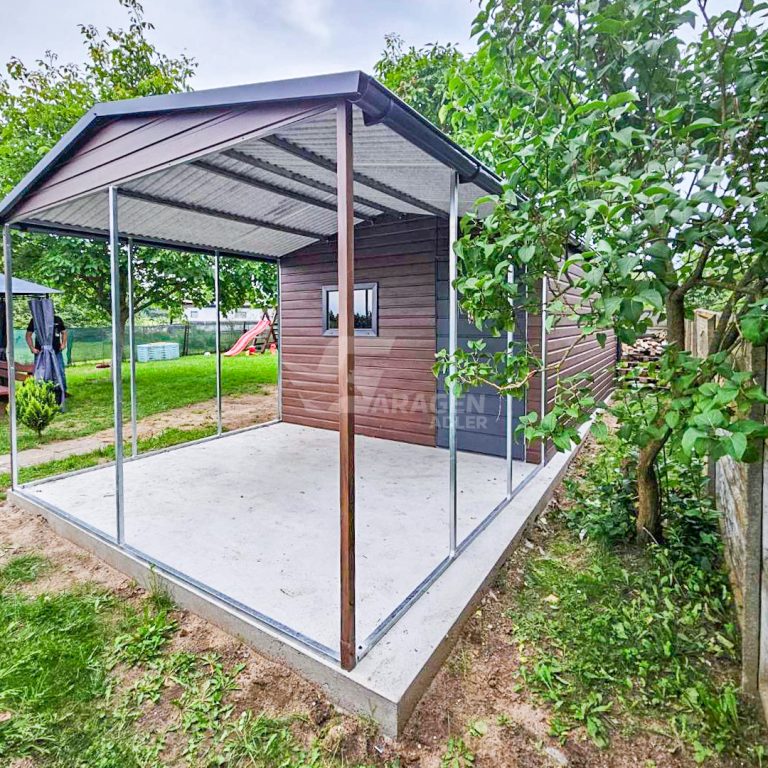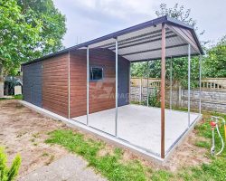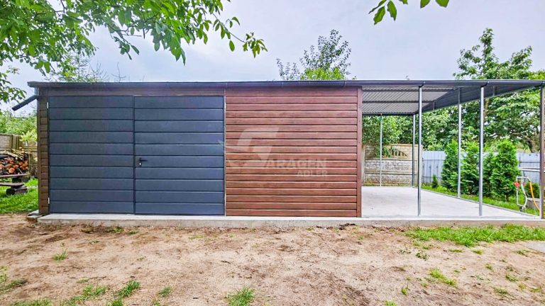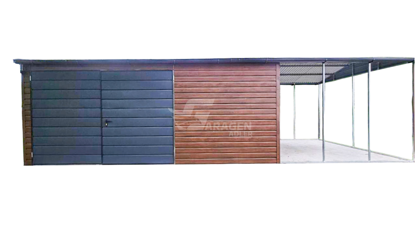 Blechgarage 6x4m + Überdachung 3m – Zweiflügeliges Tor – PVC Kippfenster – Tür – Dachrinnen – Satteldach ID661