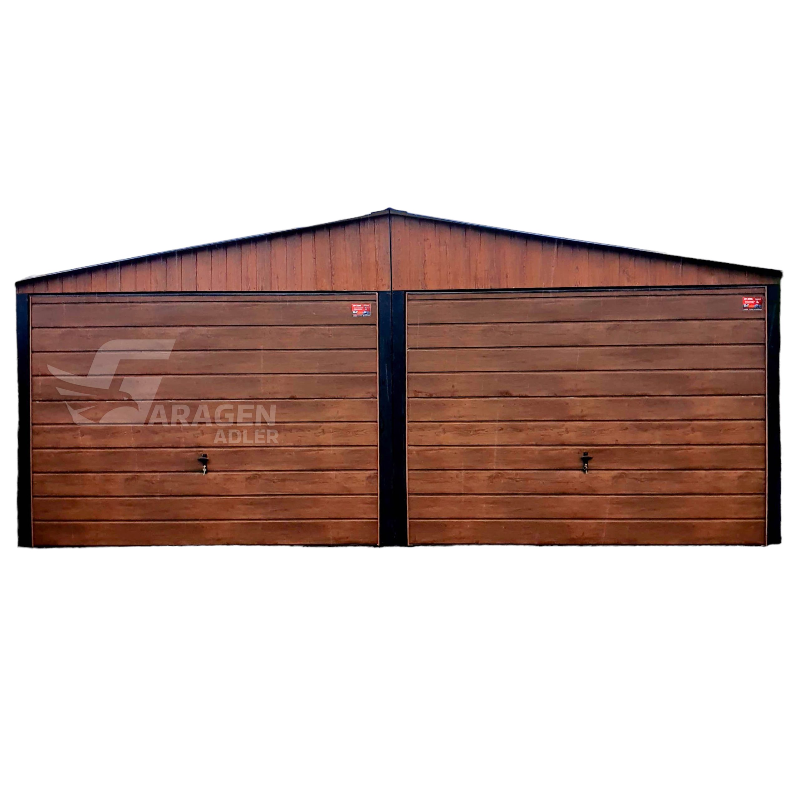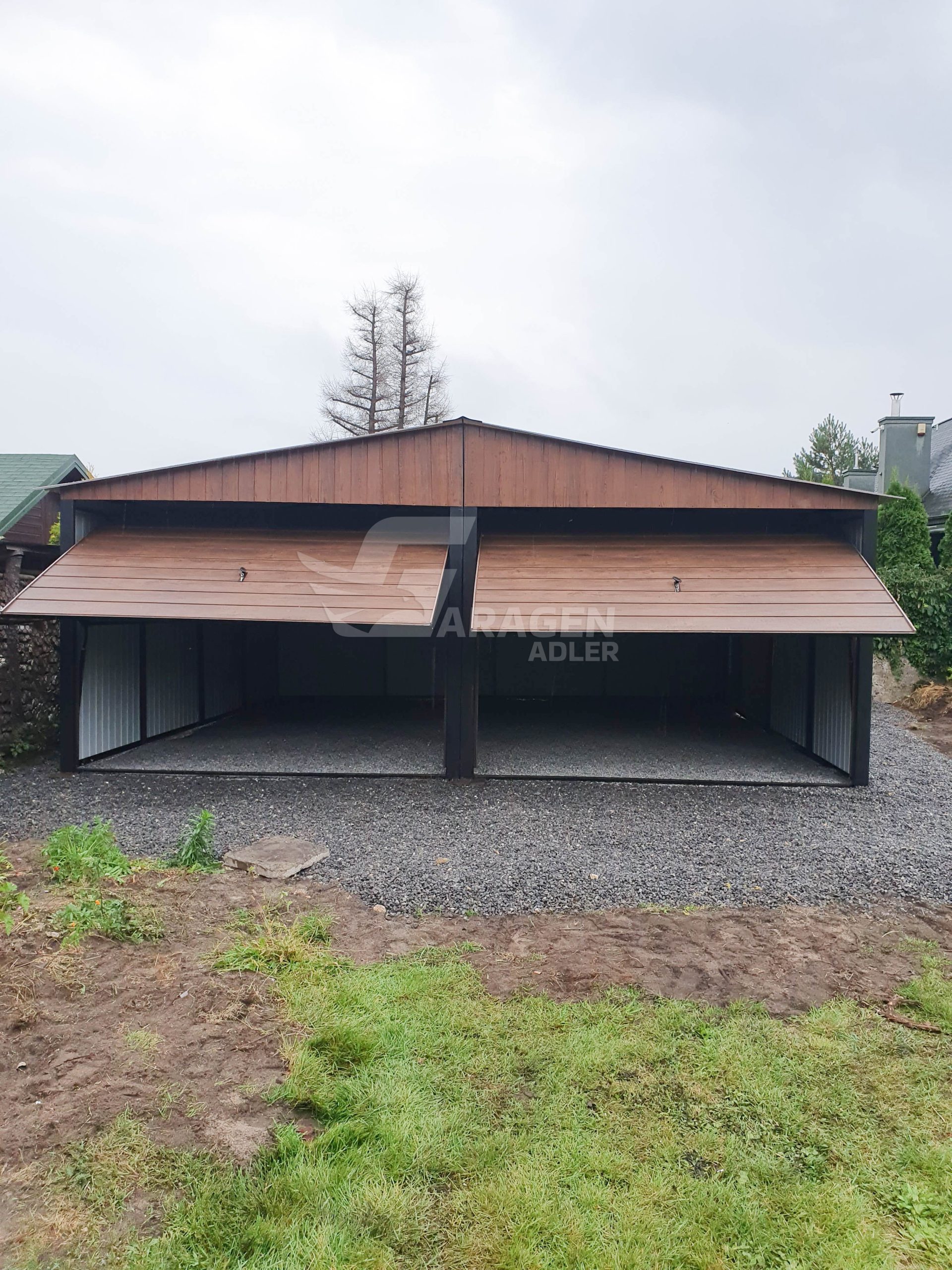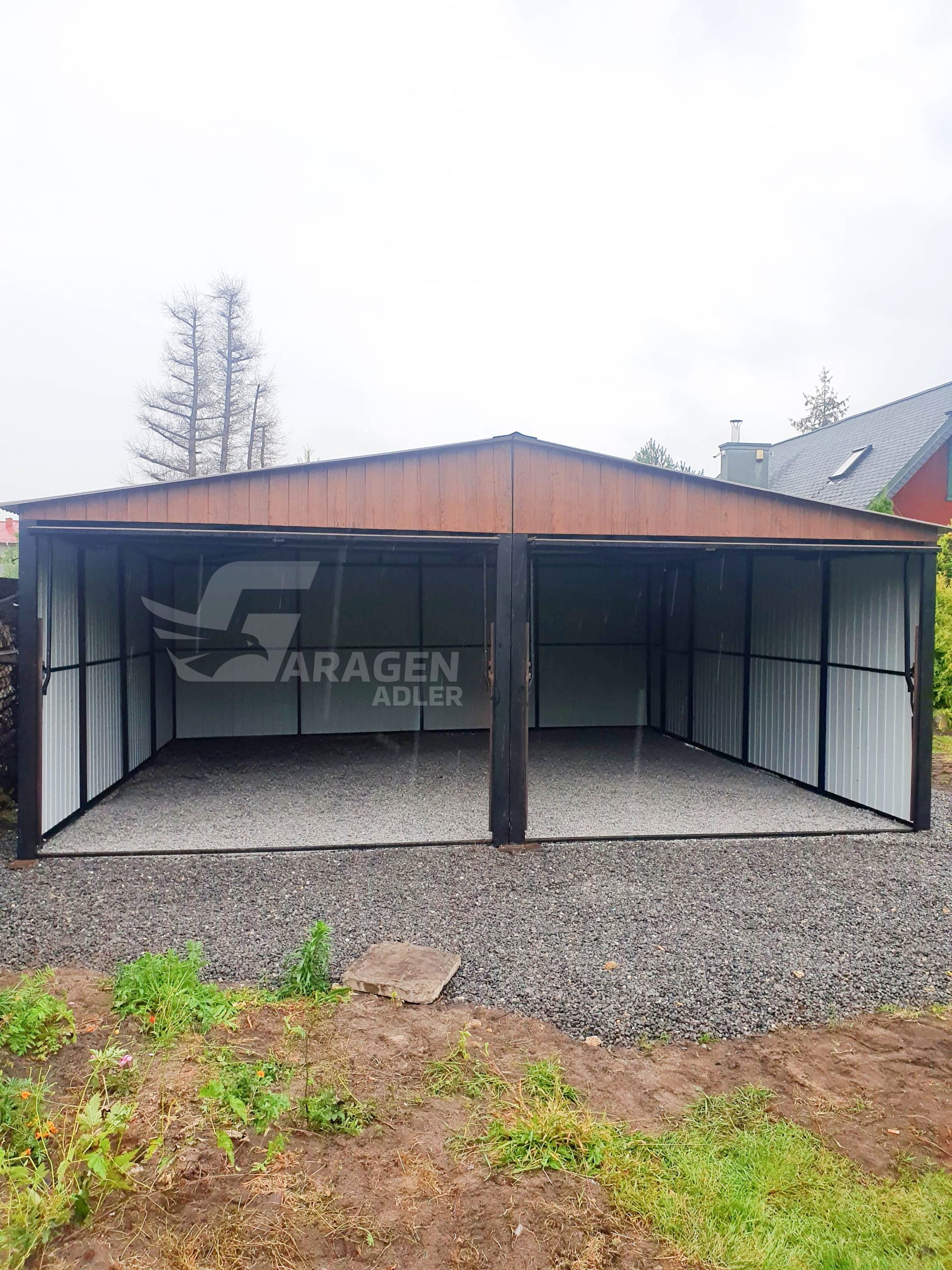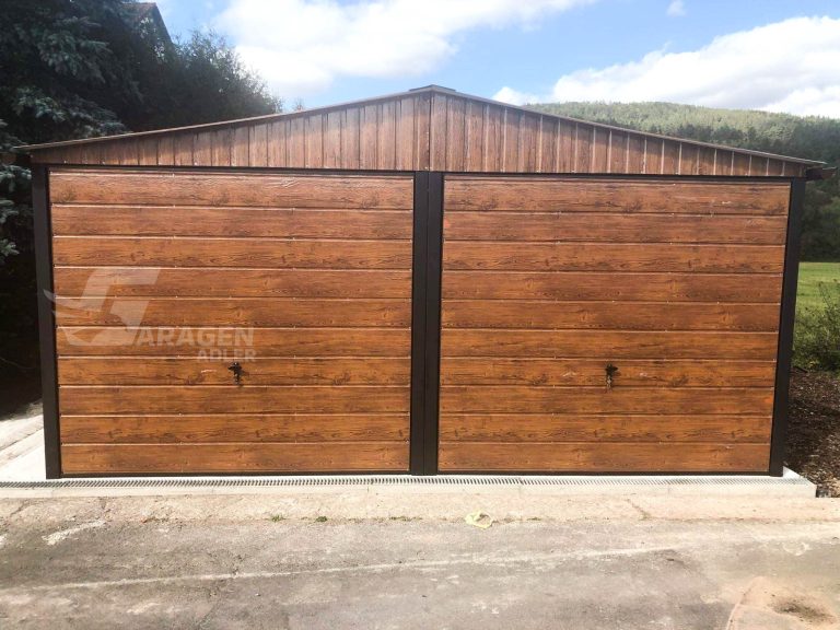 Blechgarage 6x7m – 2x Schwingtor – Holzoptik – Satteldach GP150