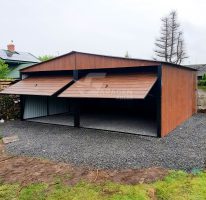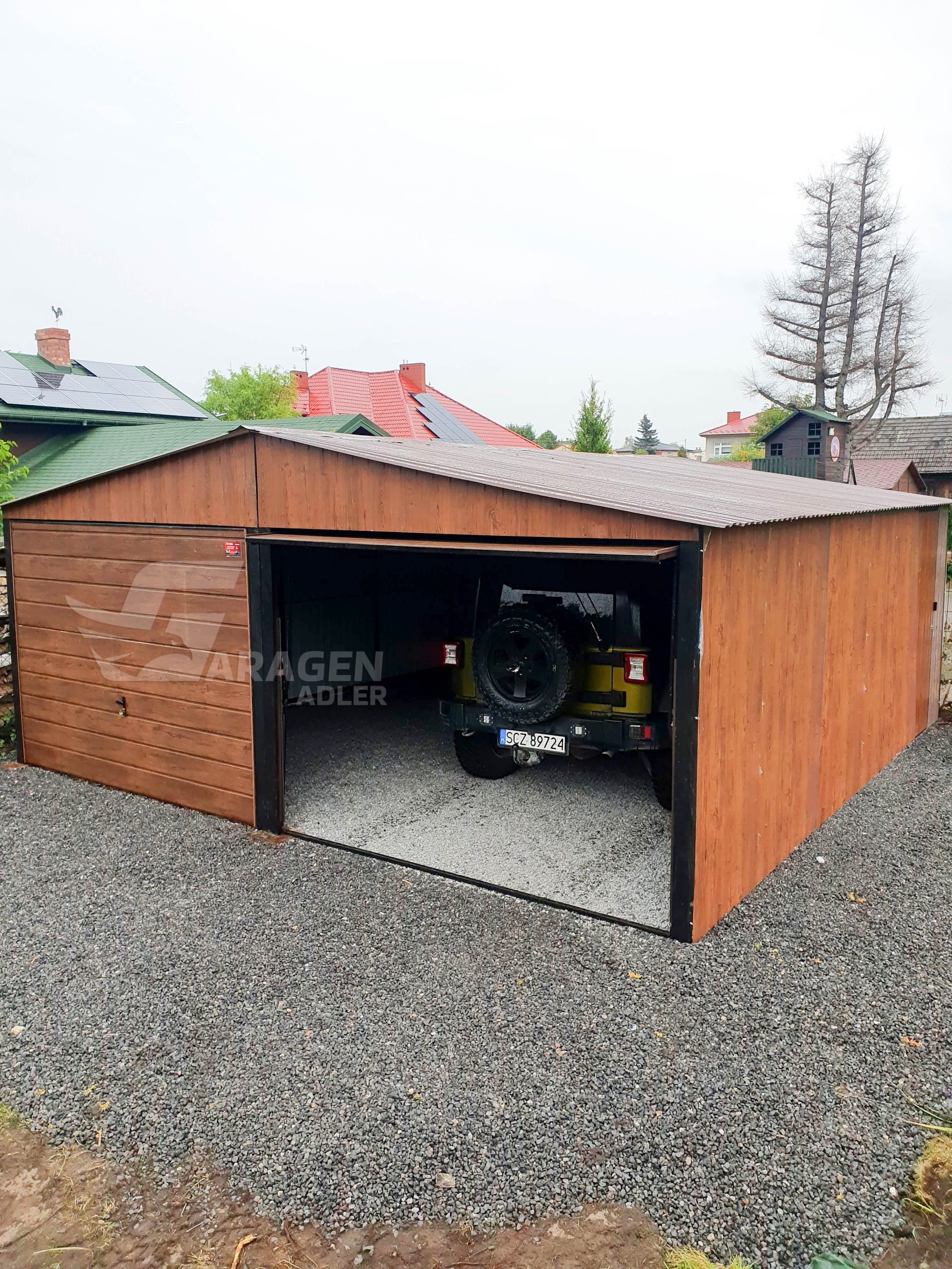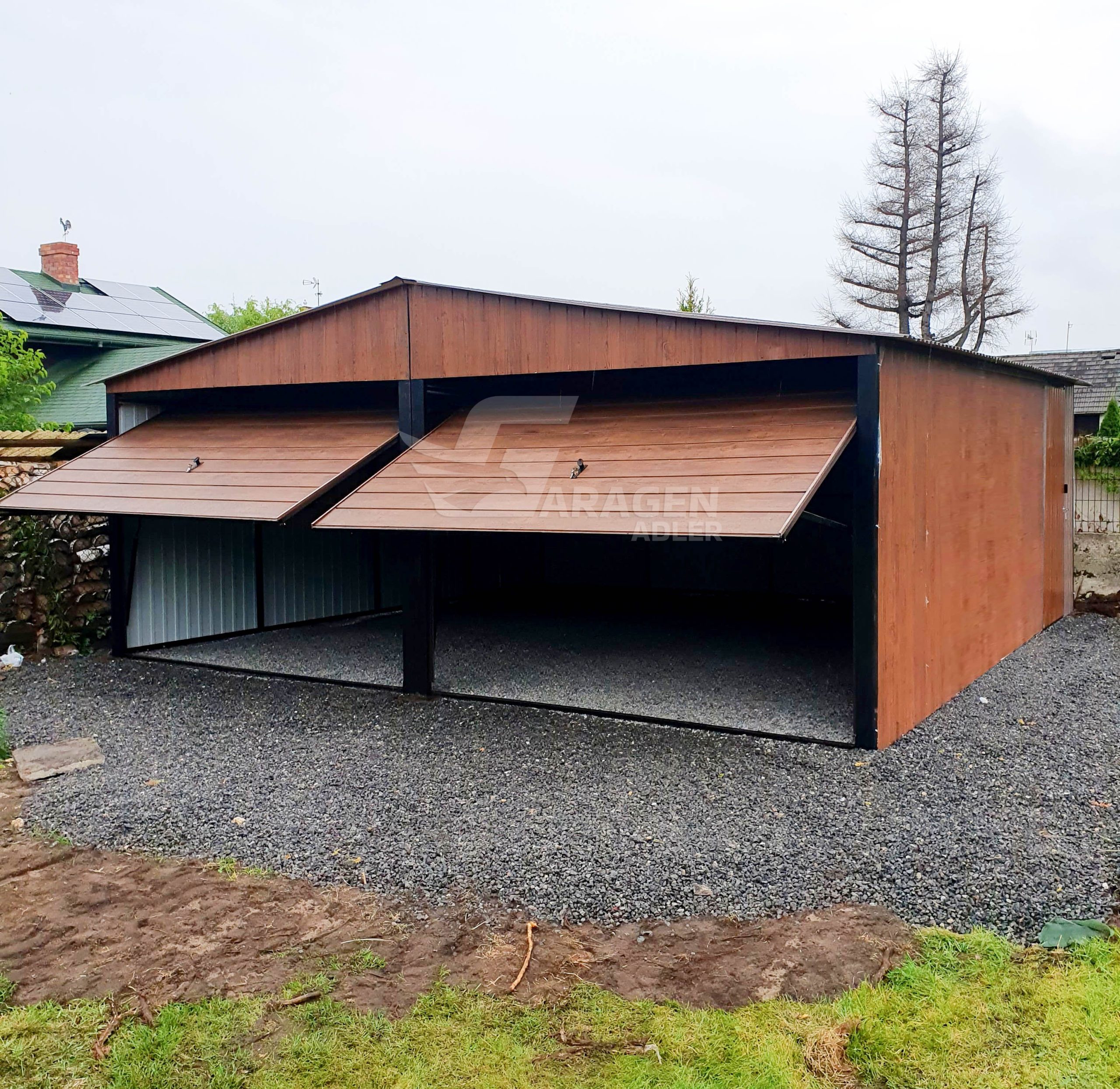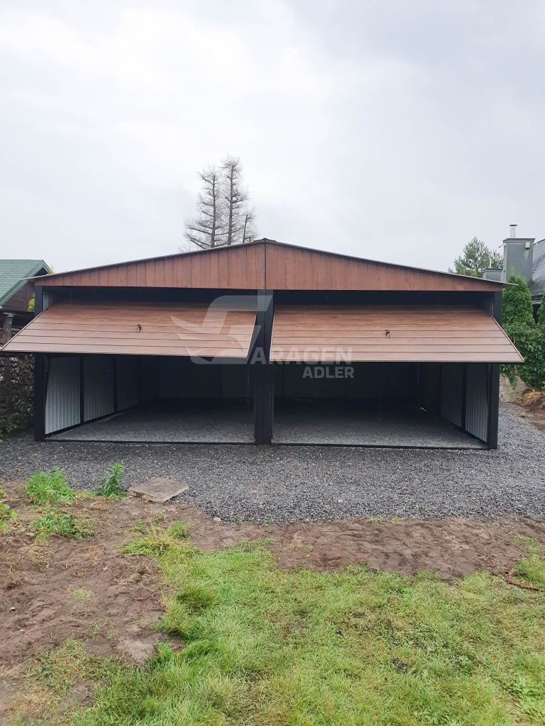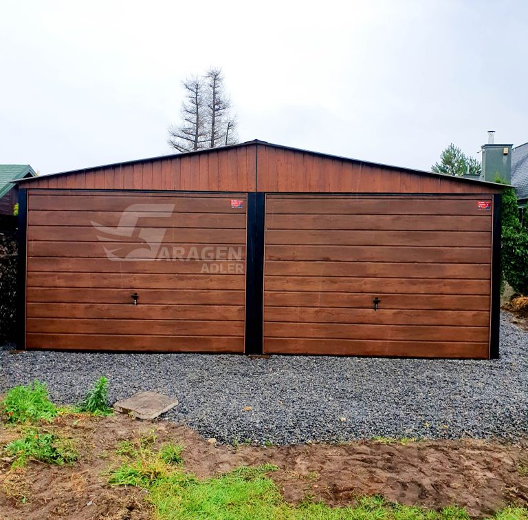 Blechgarage 6x7m – 2x Schwingtor – Holzoptik – Satteldach GP150