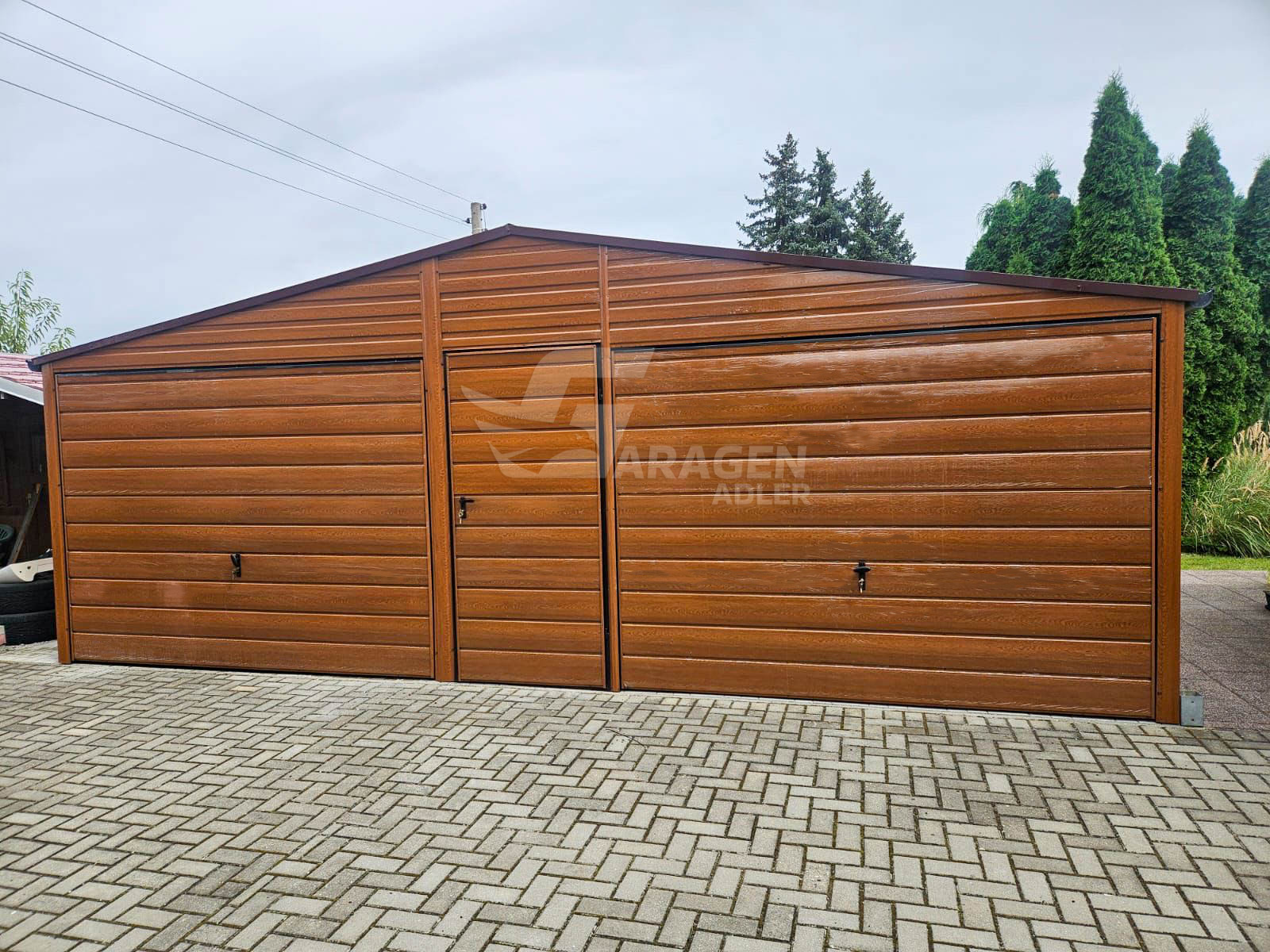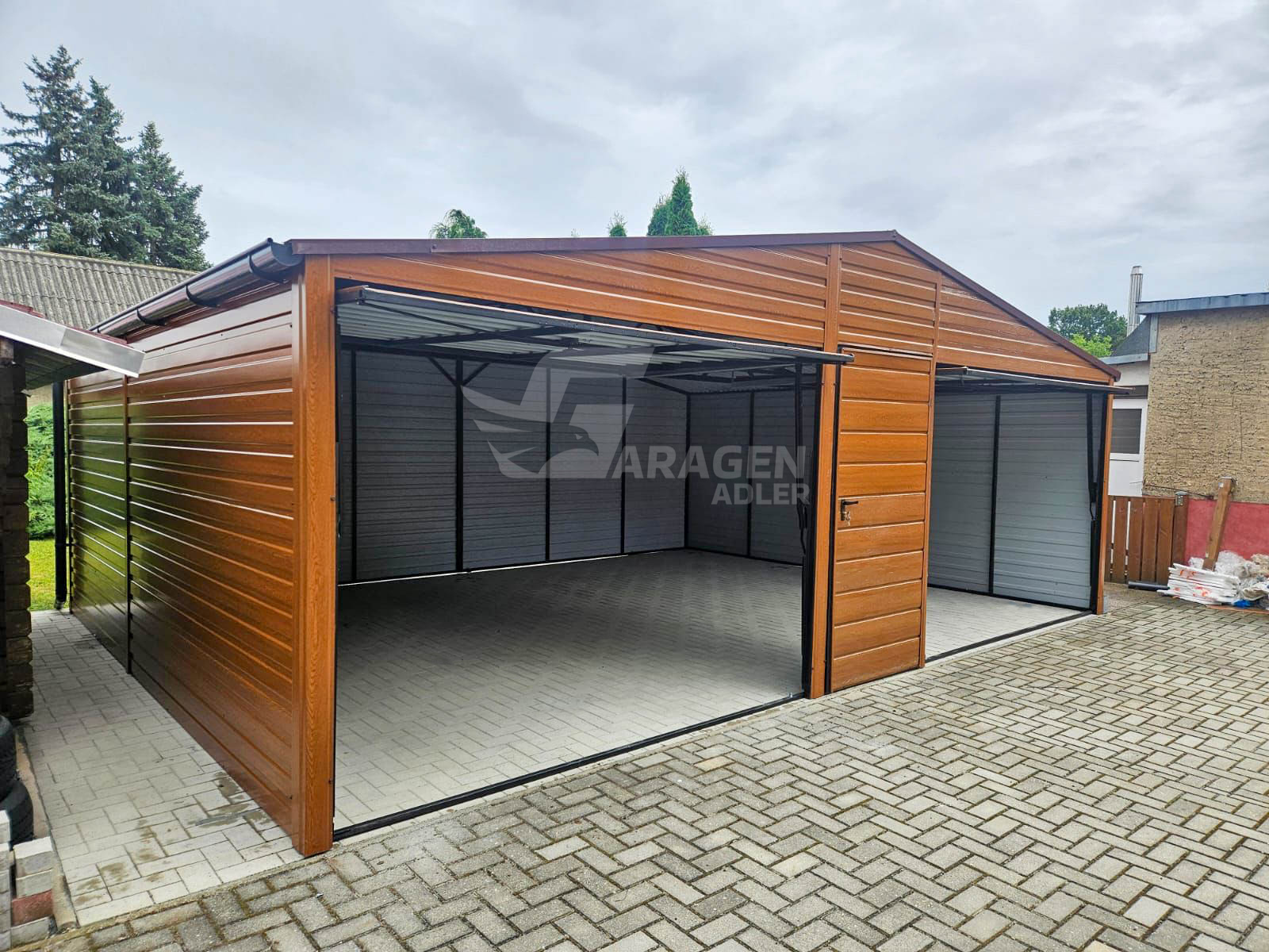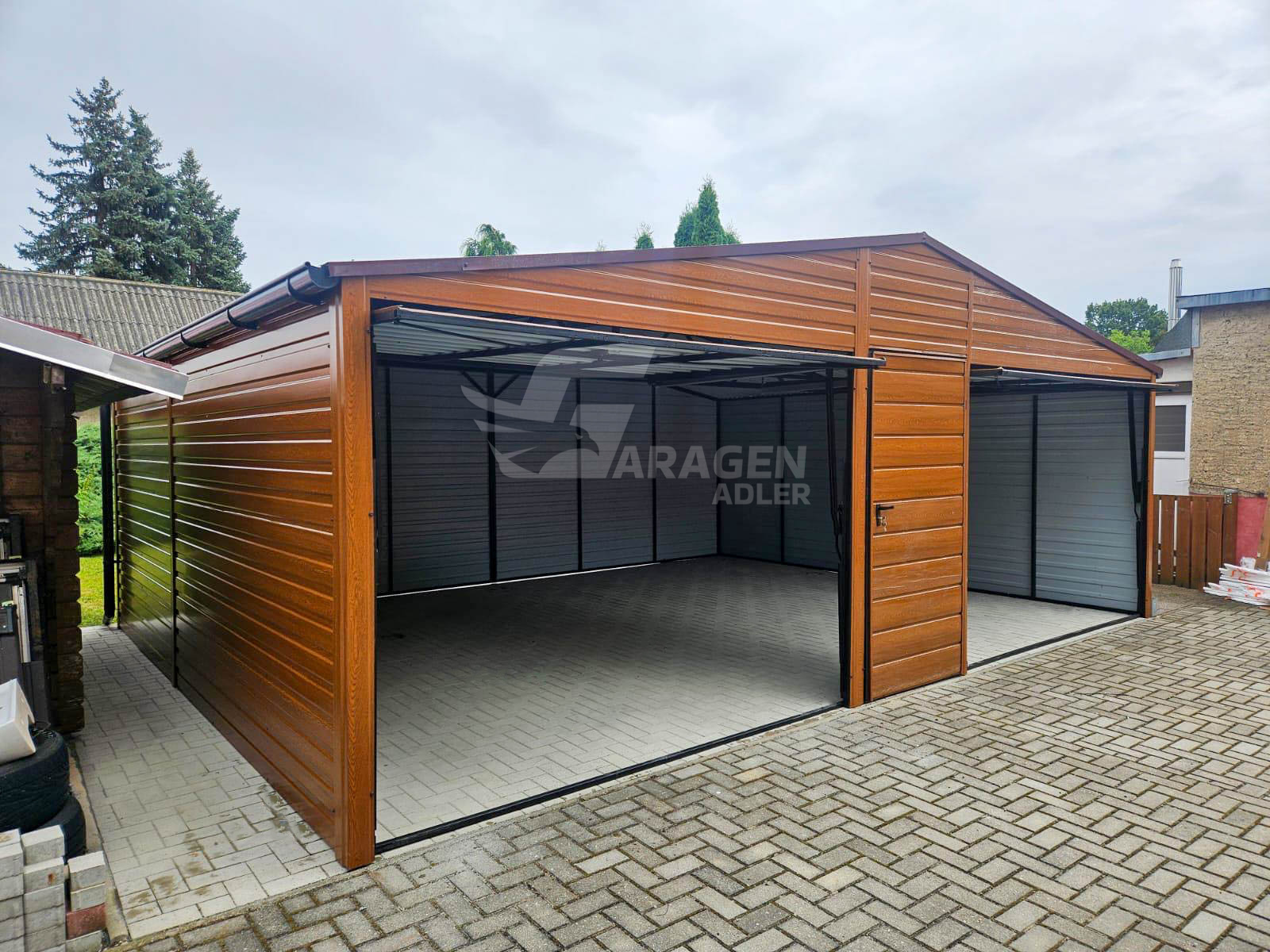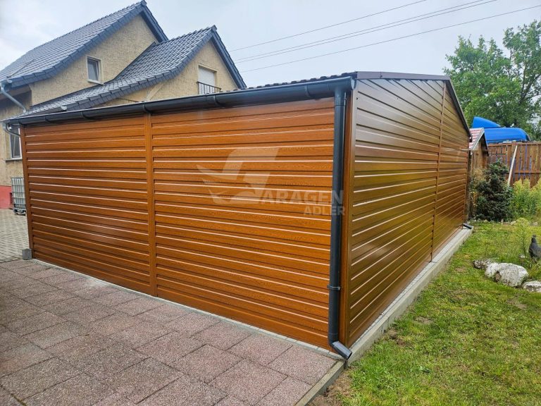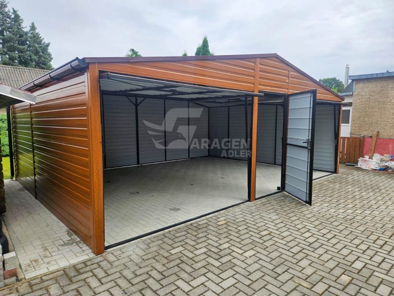 Blechgarage 7x6m – 2x Schwingtor – Tür – Holzoptik – PVC Kippfenster – Dachrinnen – Satteldach | GP598 |