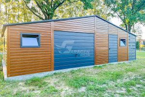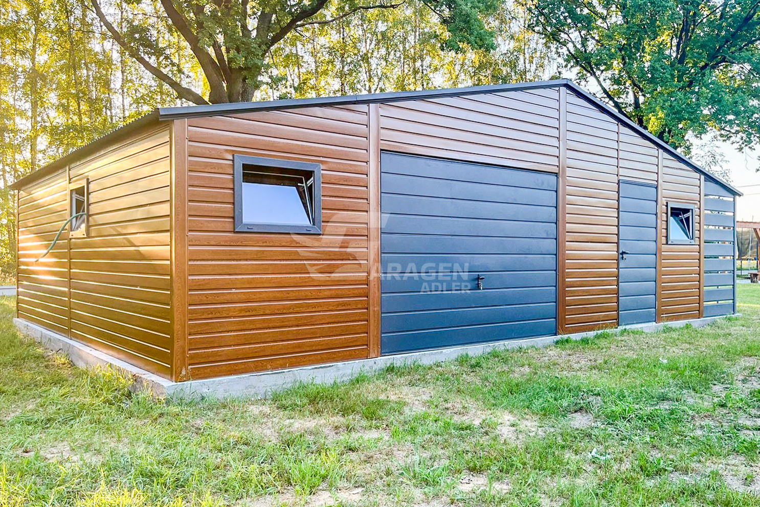 Blechgarage 8,5x6m + Überdachung 1,5m – Schwingtor – Tür – 3x PVC Kippfenster – Helles Walnussholz – Holzoptik – Anthrazit – Satteldach ID683