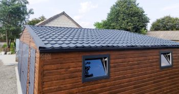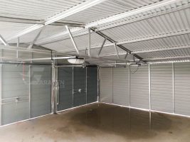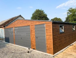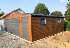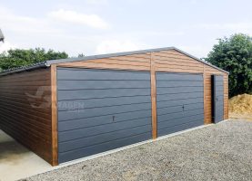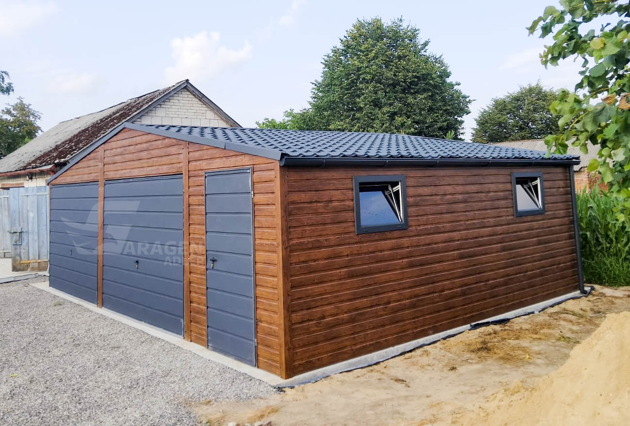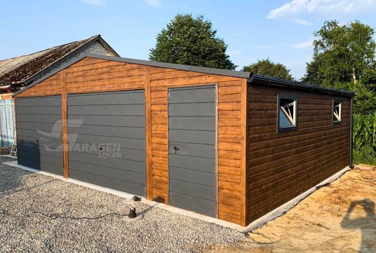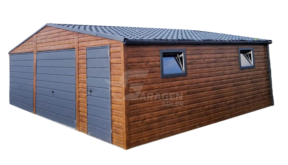 Blechgarage 8x7m 2x Schwingtor 2x PVC Kippfenster Metalldachziegel Holzoptik ID271