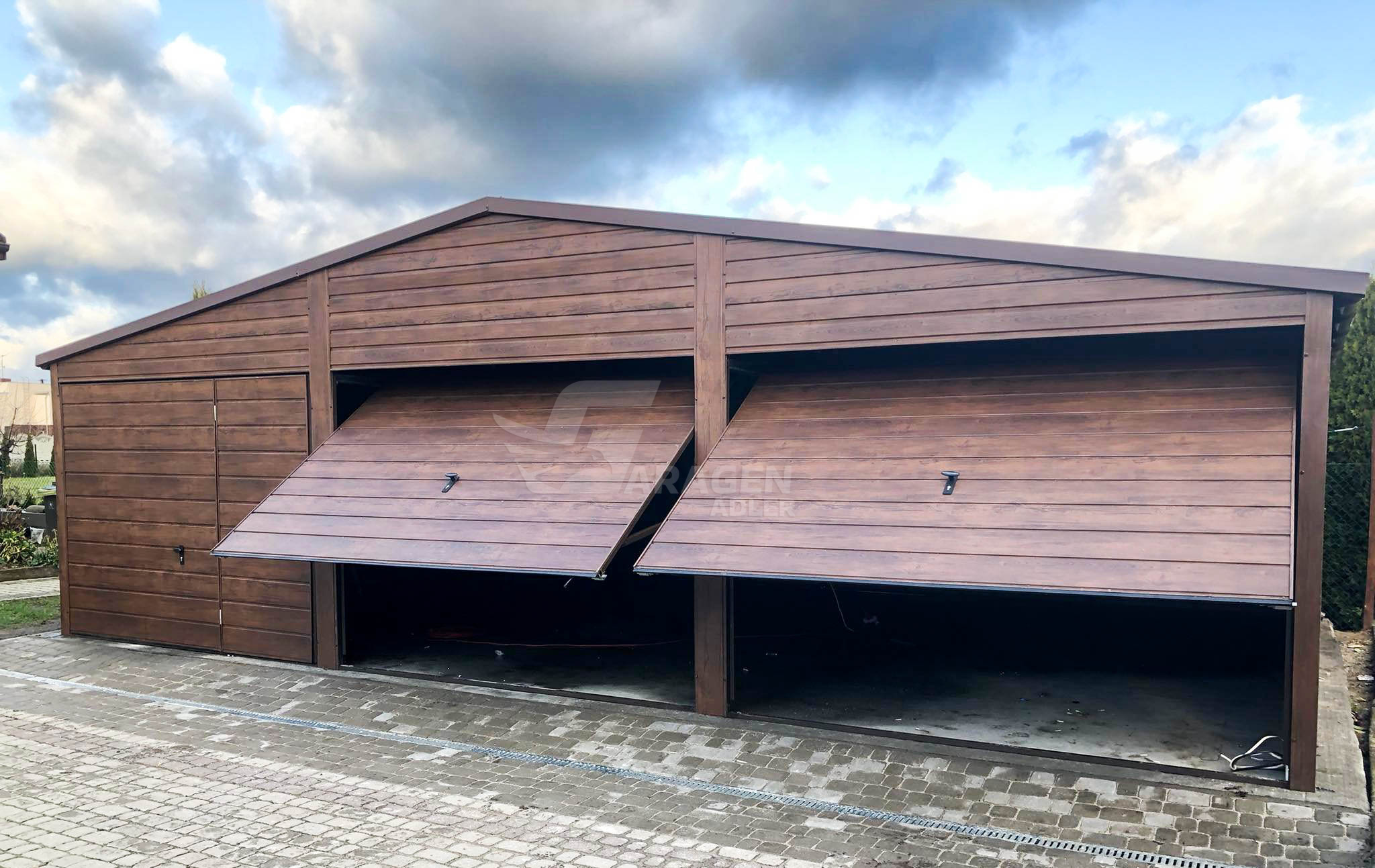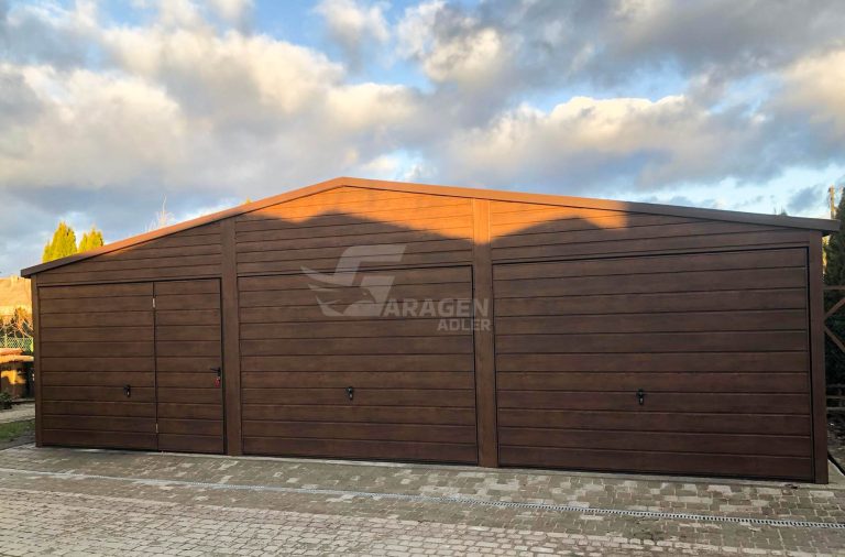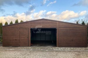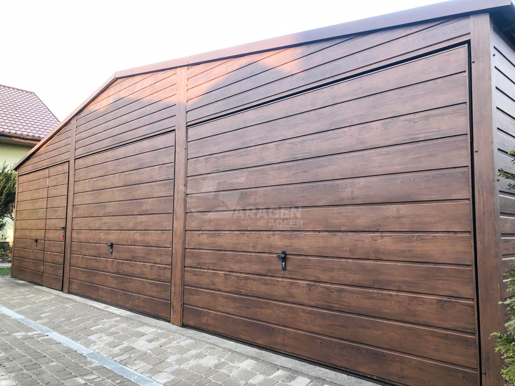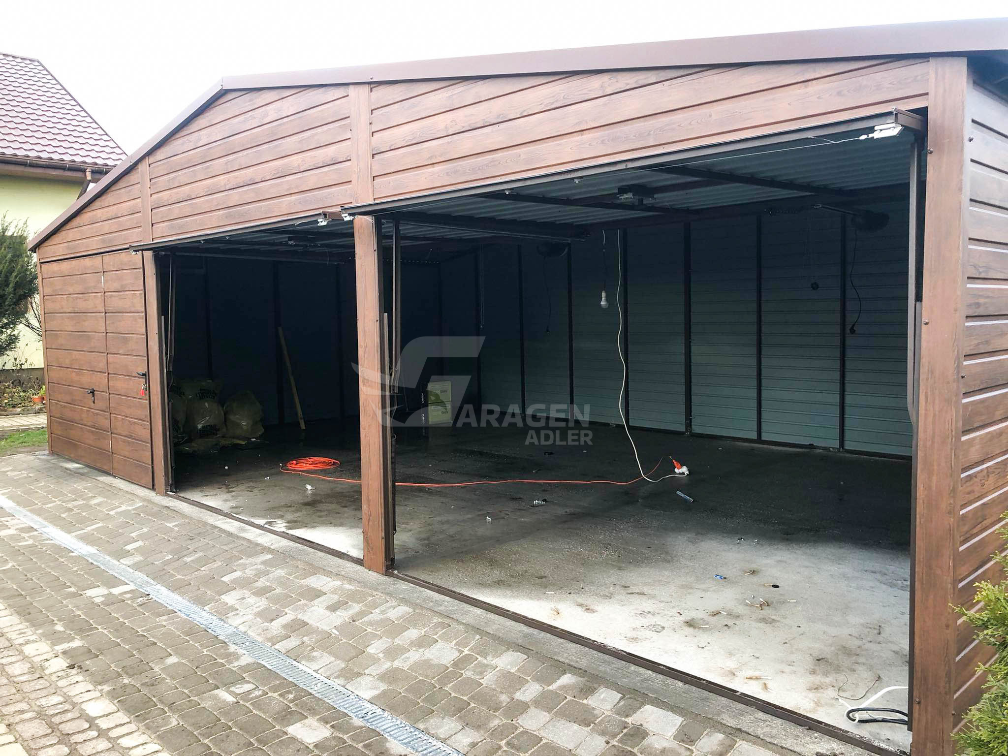 Blechgarage 9x6m 3xSchwingtor + Zusätzliche Tür – Holzoptik – Satteldach GP143