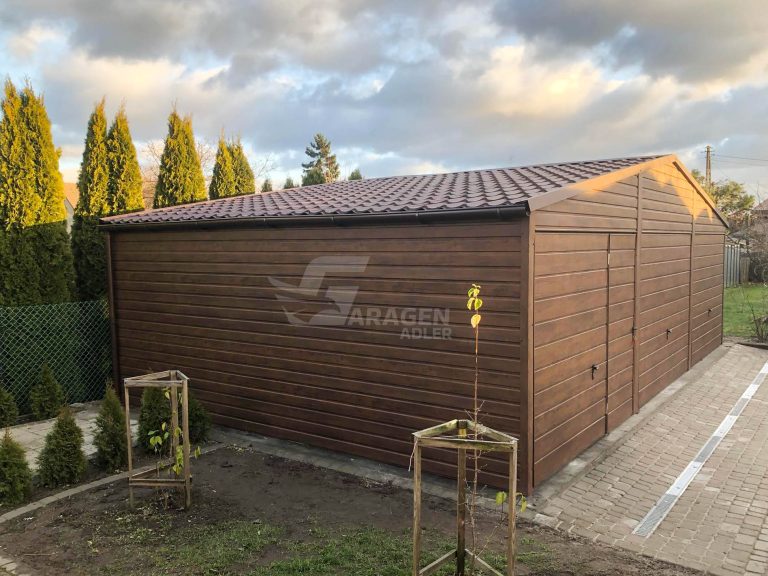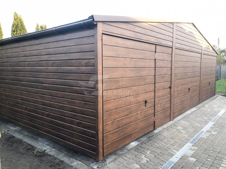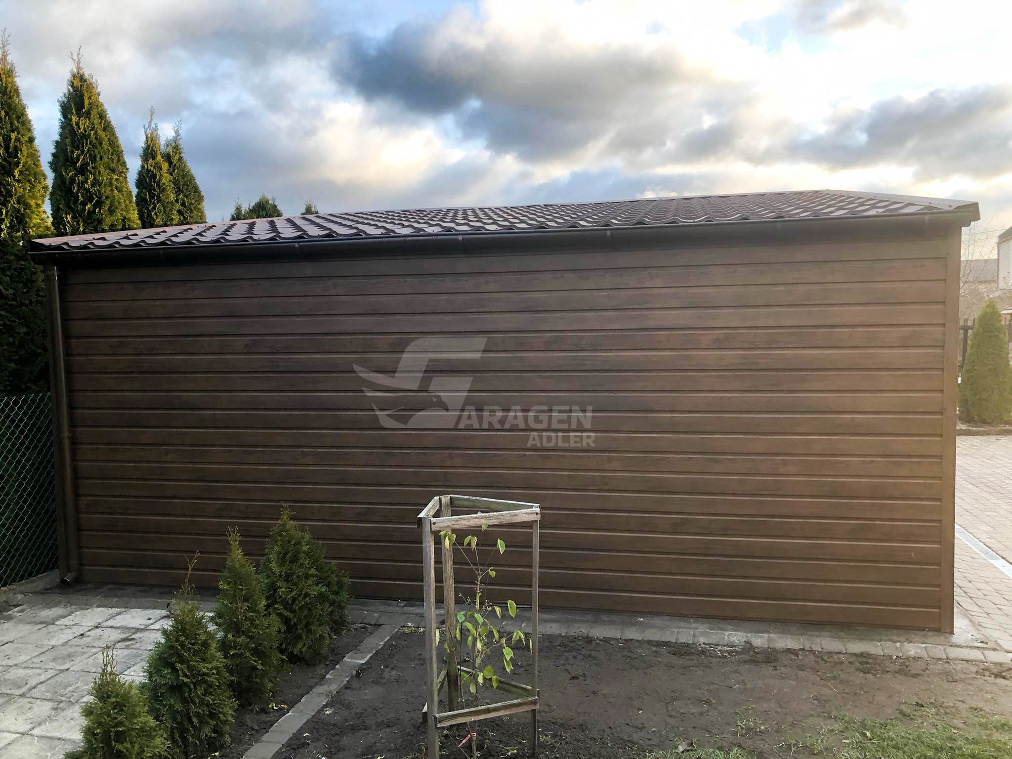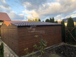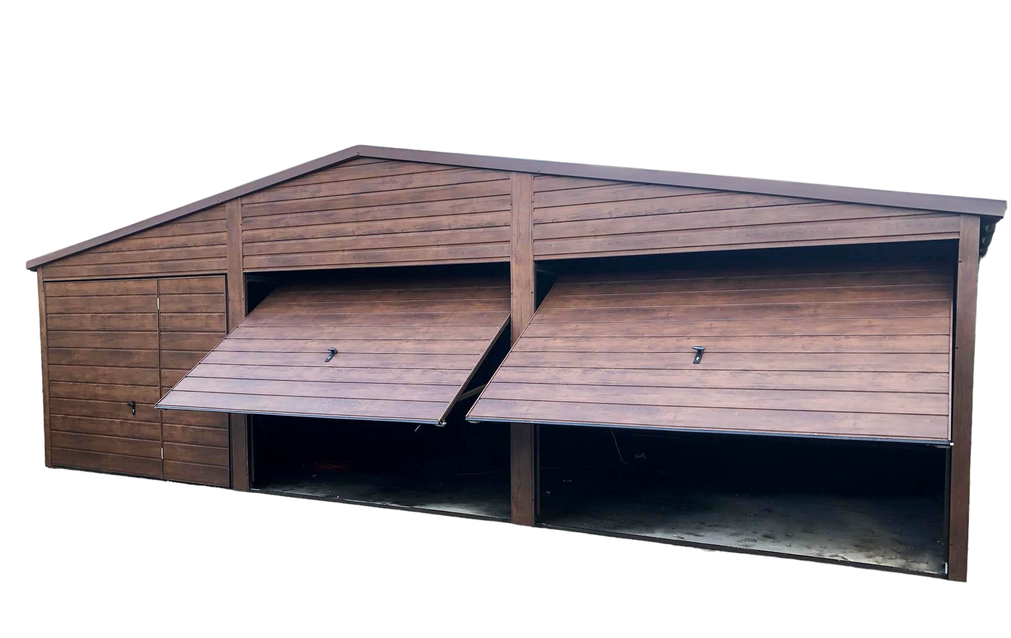 Blechgarage 9x6m 3xSchwingtor + Zusätzliche Tür – Holzoptik – Satteldach GP143