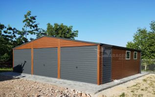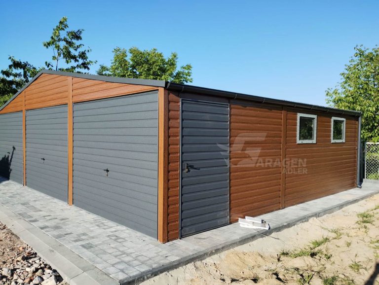 Blechgarage 9x6m Horizontal Blech Dachrinnen 3x Schwingtor 2x PVC Kippfenster Holzoptik ID216
