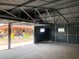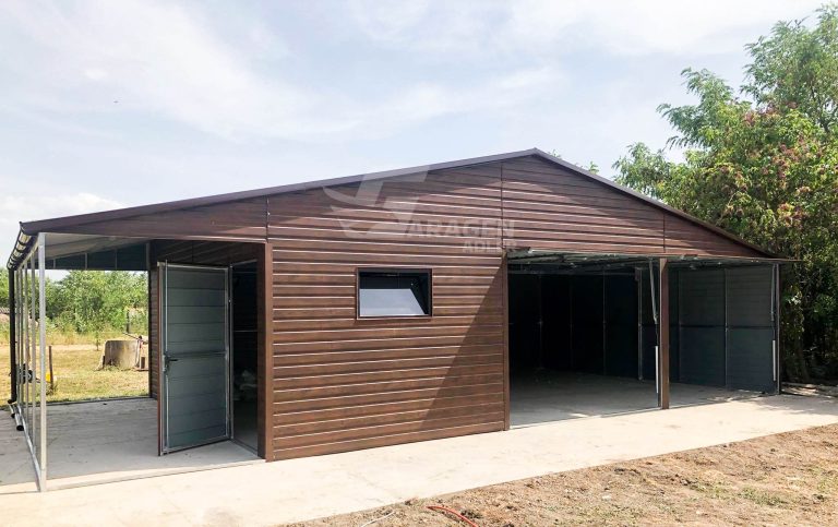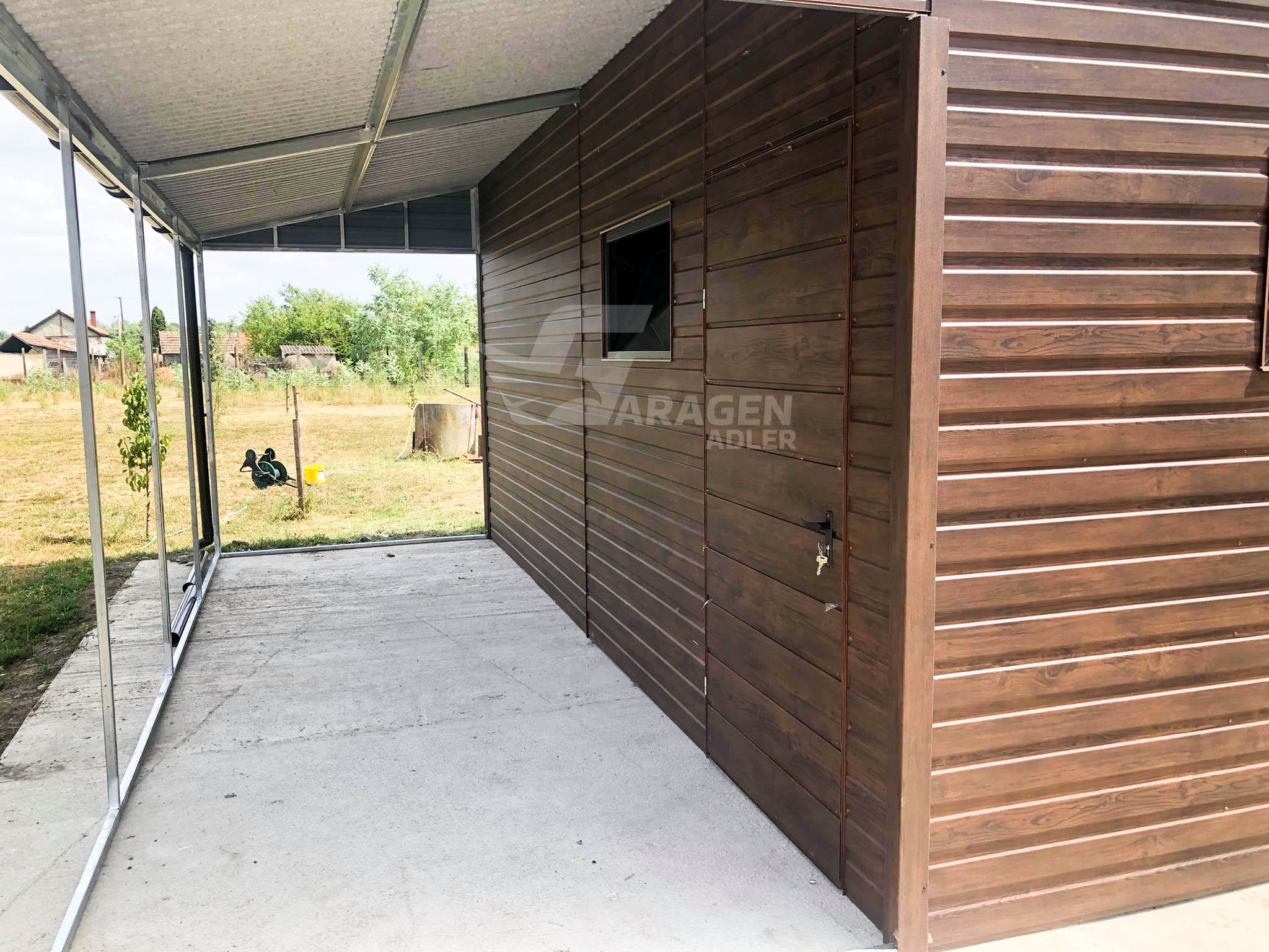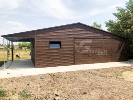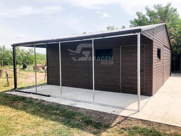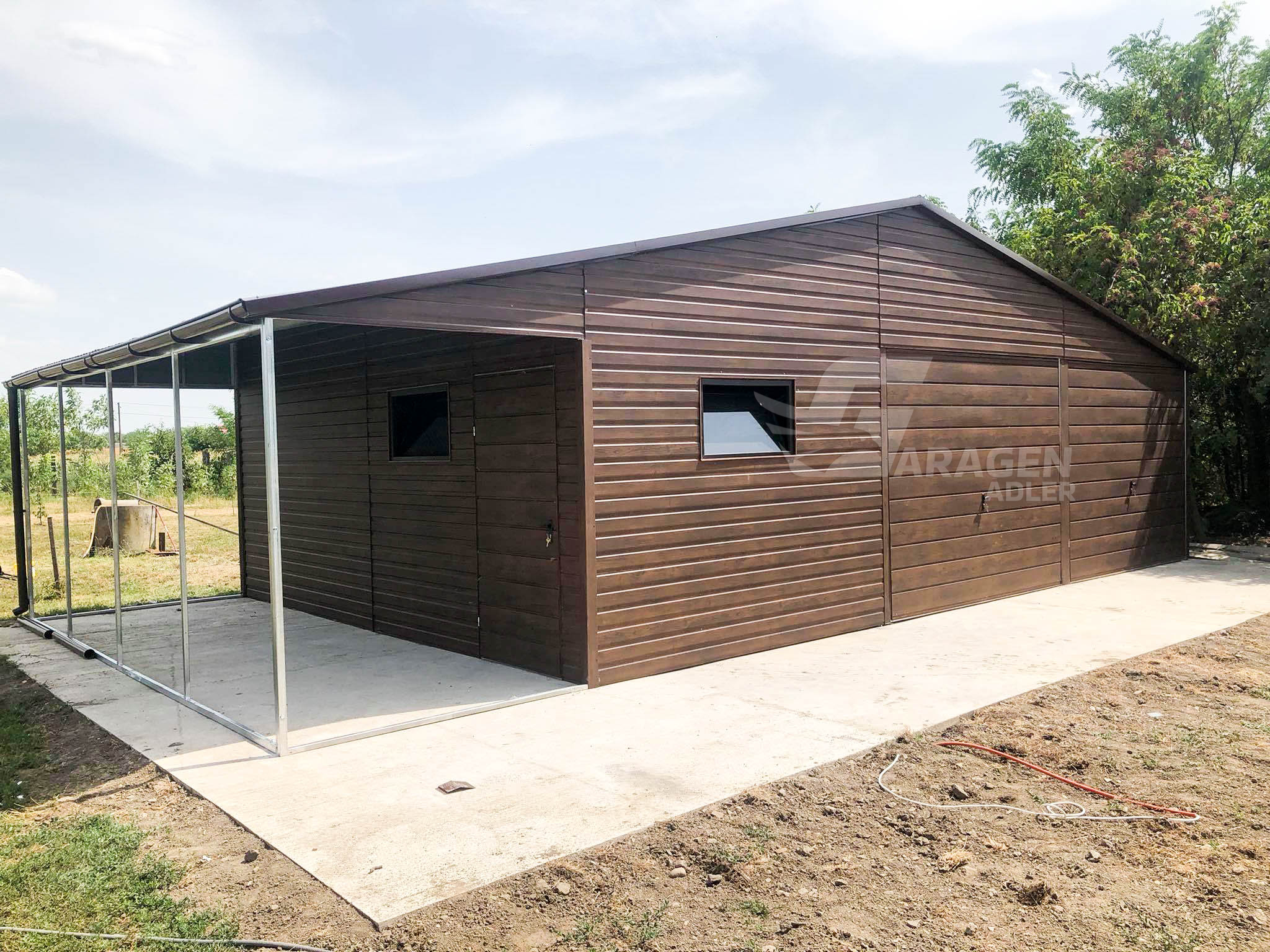 Blechgarage 9x6m + Überdachung 3m x 6m – Holzoptik – Satteldach GP135