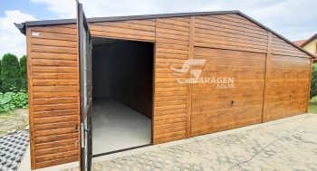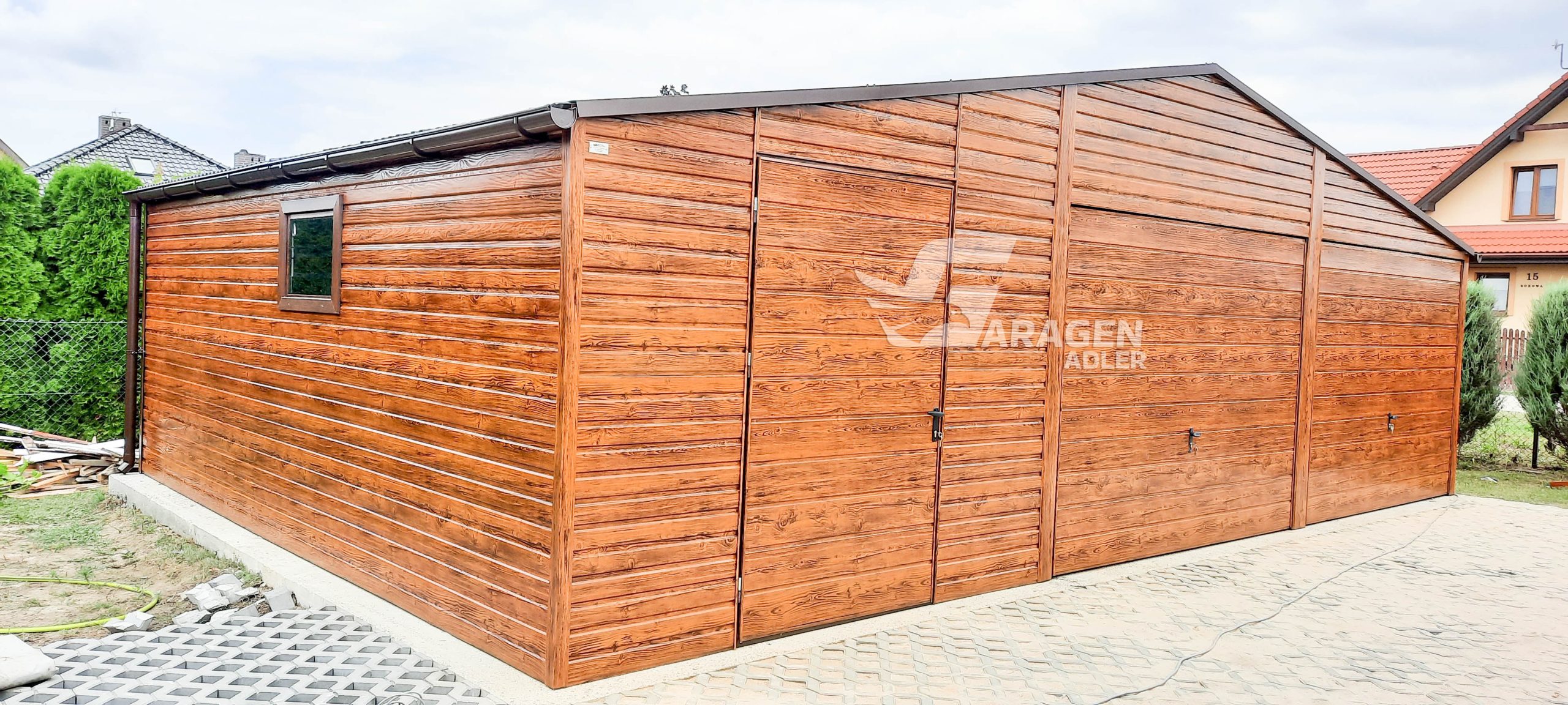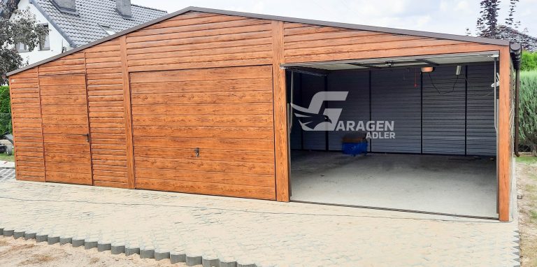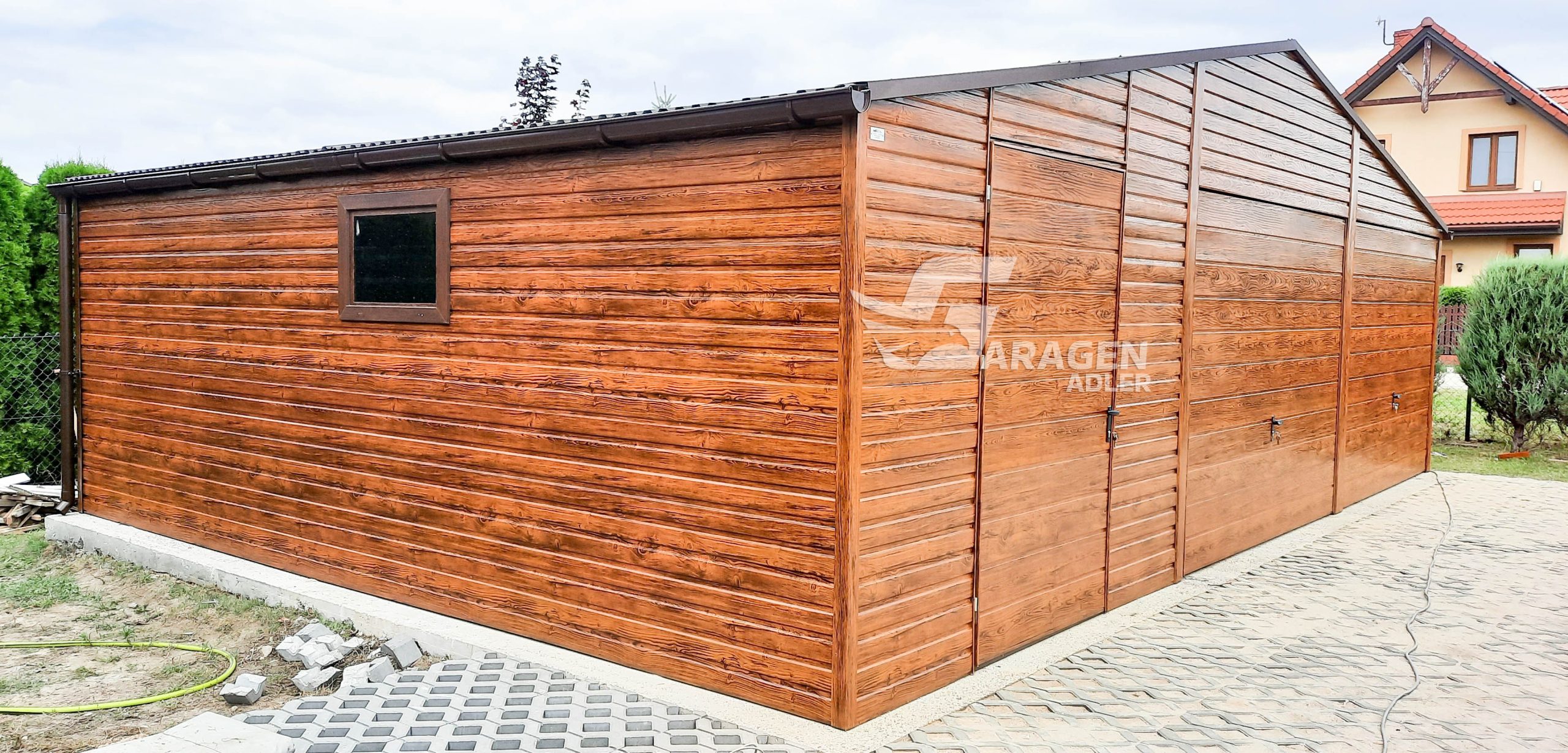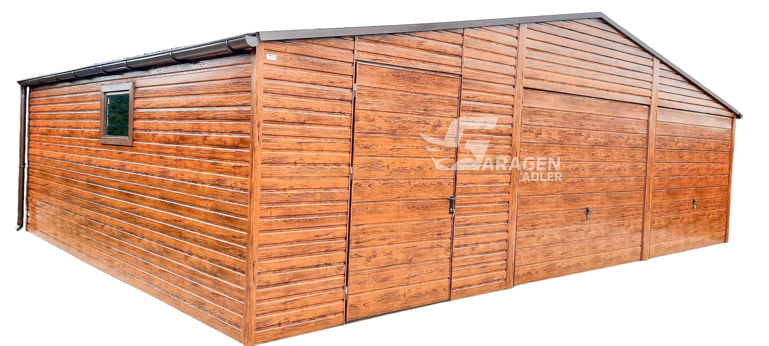 Blechgarage 9x7m Horizontal Blech Satteldach 2x Schwingtor Holzoptik 2x Tür ID139