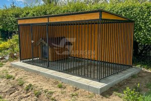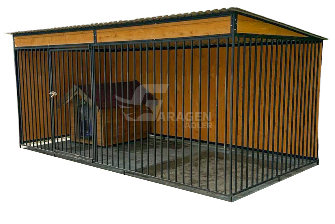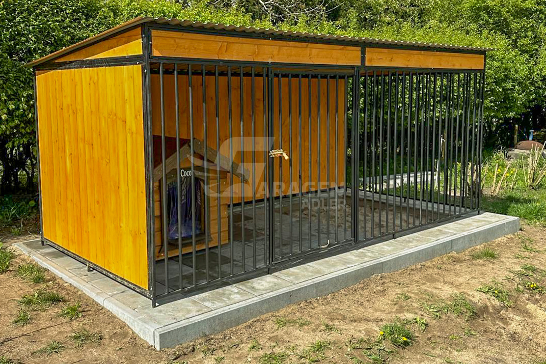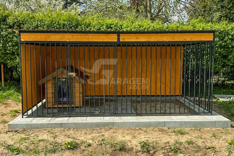 Hundezwinger 4x2m – Windschutz – Wände mit Holz verkleidet – Dach mit Gefälle nach hinten – GP405